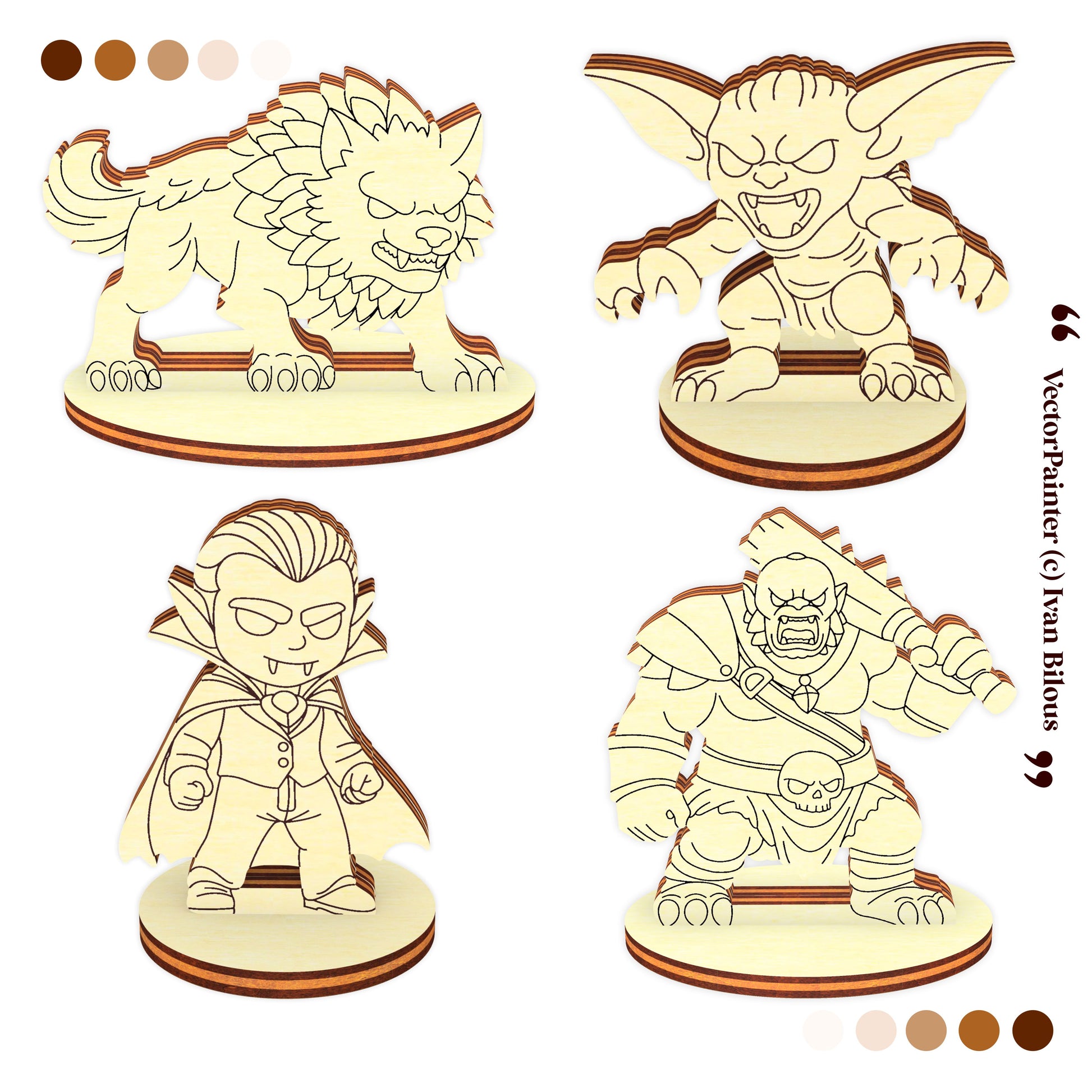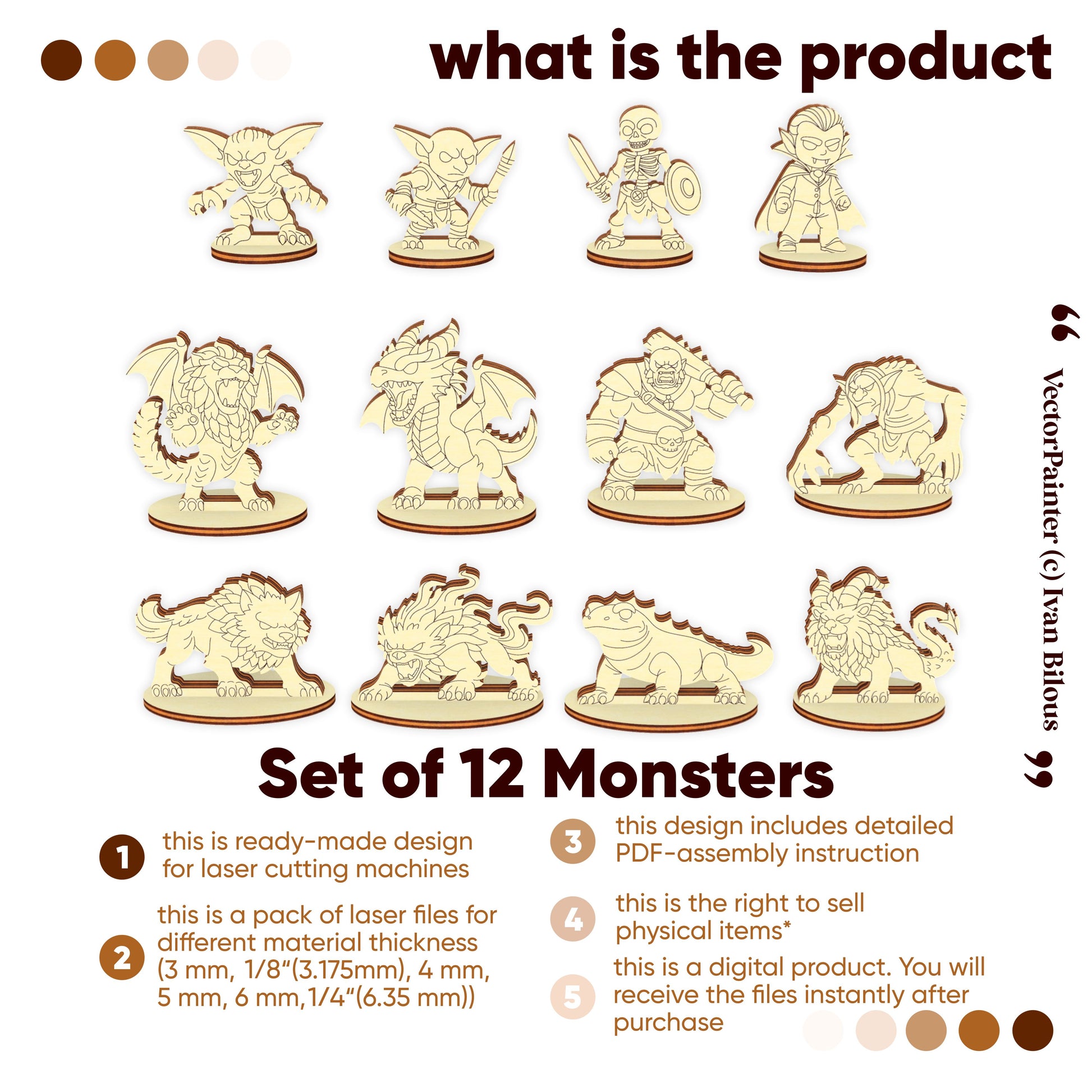 Juego de archivos digitales de corte láser con monstruos de mesa de RPG de fantasía diseñados para juegos de mesa y campañas de rol. Esta plantilla SVG lista para CNC le permite crear miniaturas de monstruos de madera compatibles con mapas de batalla de mesa y configuraciones de terreno de juego.