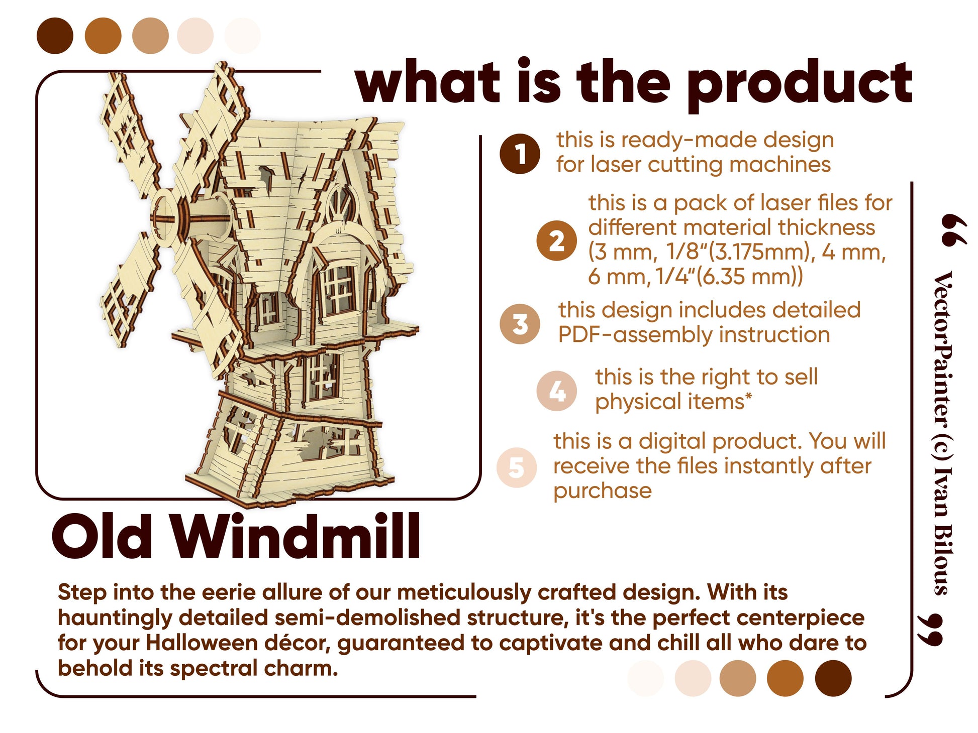 Discover the eerie charm of our Laser Cut File featuring an Old Abandoned Mill for Halloween décor. This intricate design captures the spooky essence of a deserted mill, complete with haunting details perfect for Halloween. Ideal for crafters and enthusiasts looking to add a touch of ghostly intrigue to their projects, this laser-cut file is sure to impress.