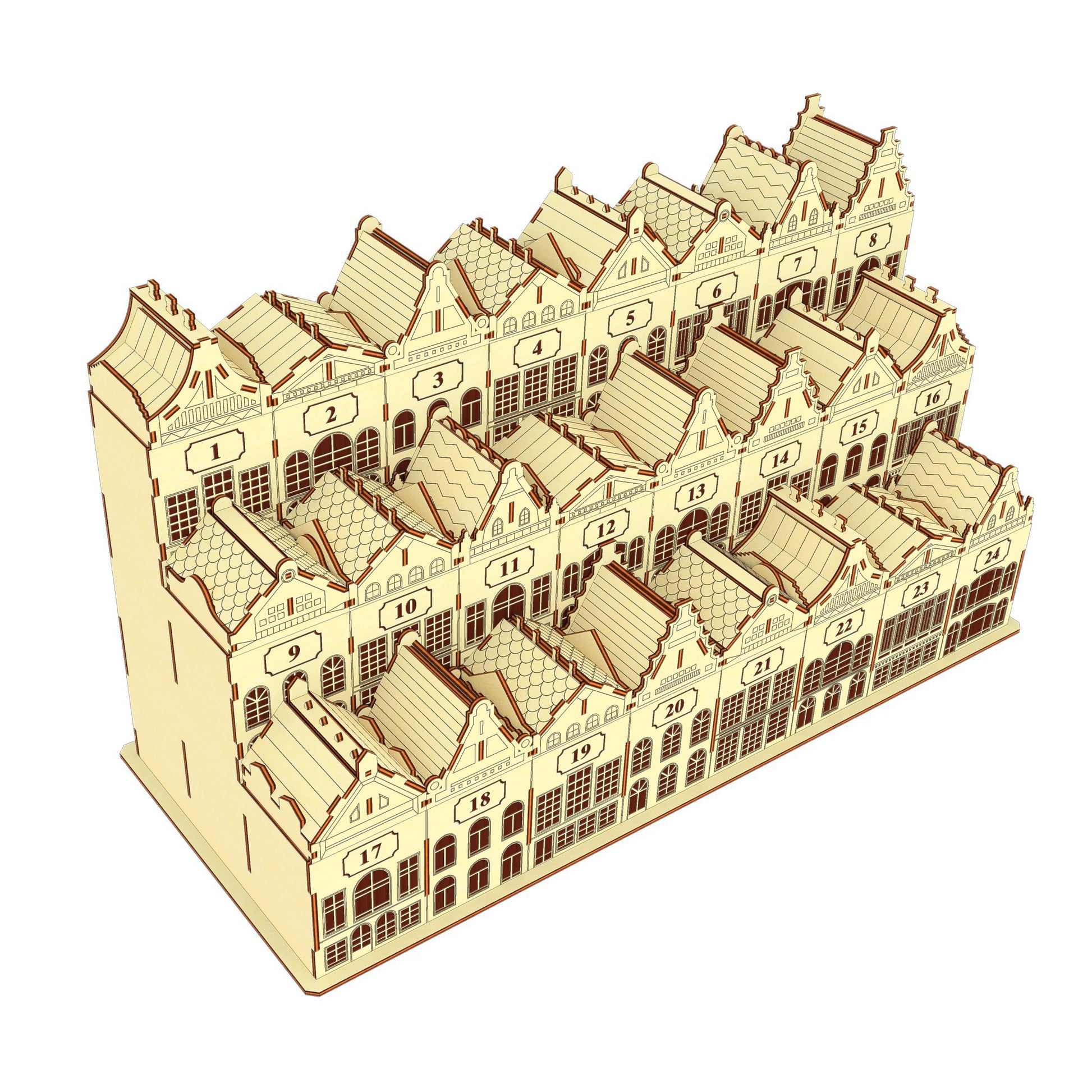 This unique city design is actually an Advent calendar. The city will contain 24 box houses, the roofs of which can be removed and put a small treat or gift. In addition, the calendar can serve as an excellent organizer that can be used throughout the year.