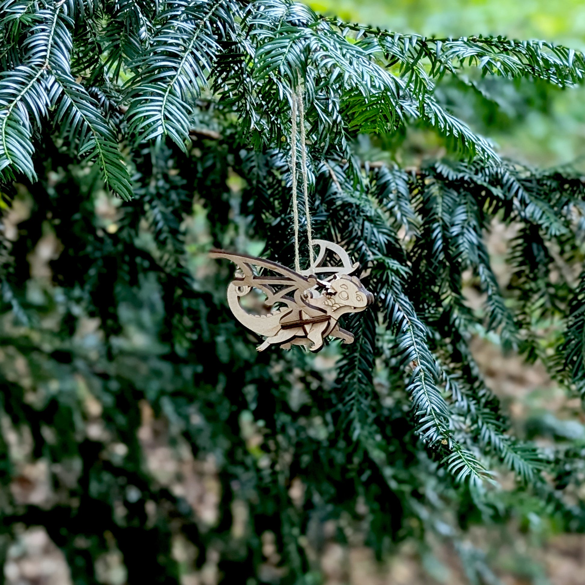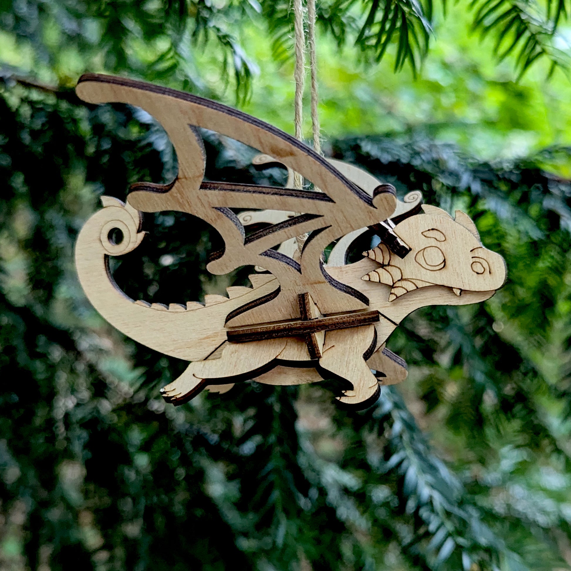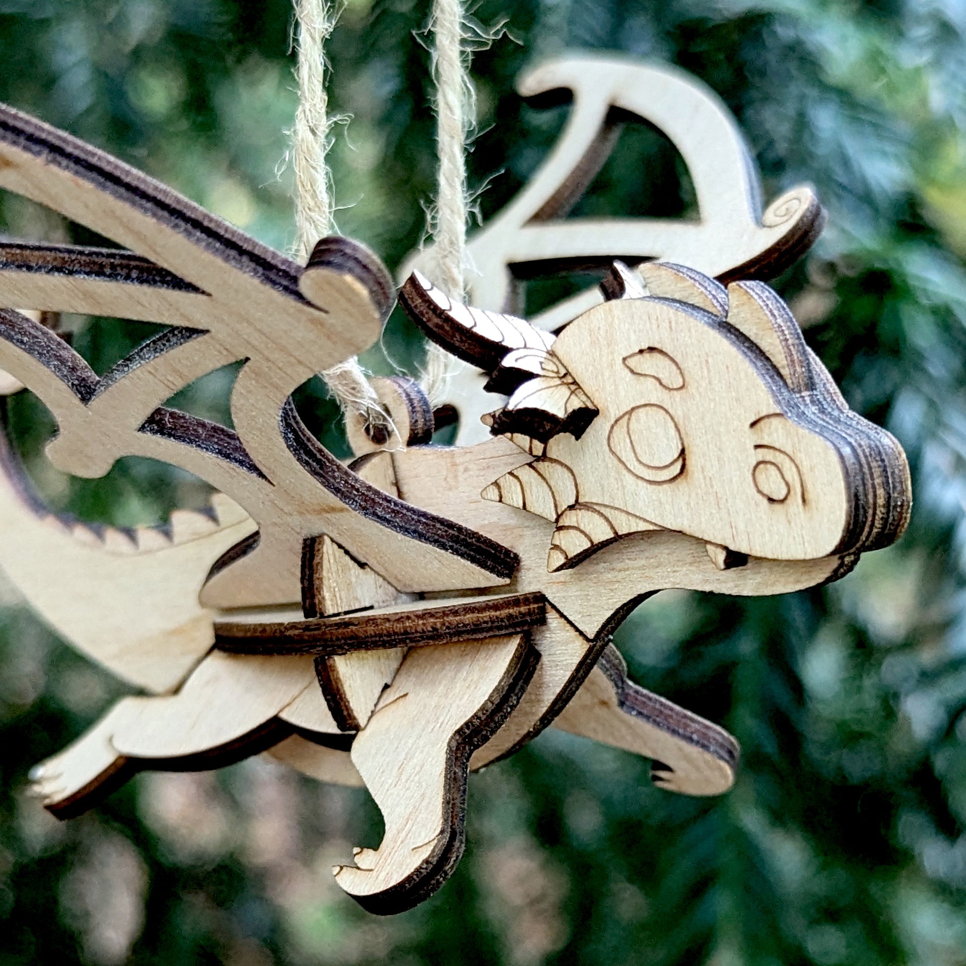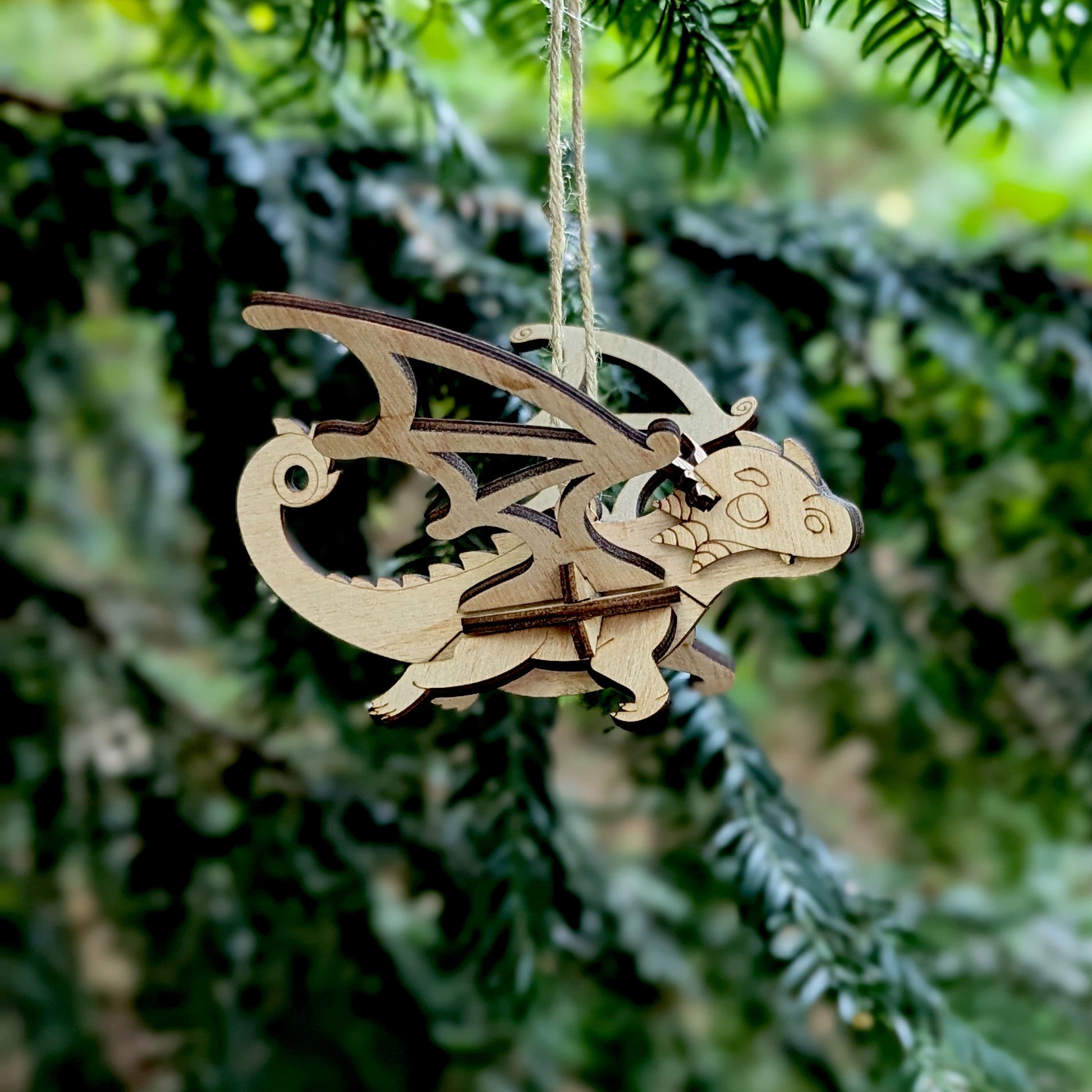 This laser cut design captures the majestic and mystical essence of a dragon, intricately detailing its wings and curved horns. The ornament includes a hole for easy hanging, making it perfect for adding a touch of fantasy to your Christmas tree or any decorative display.