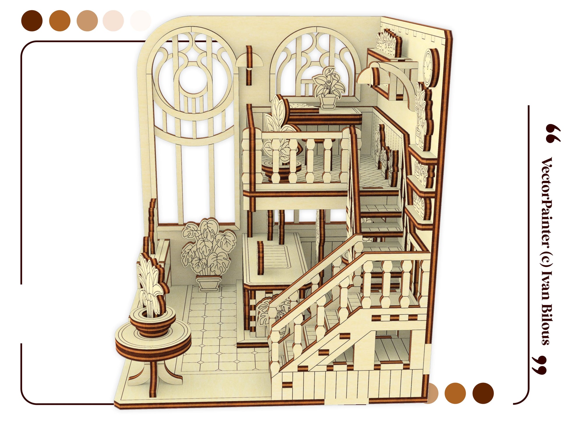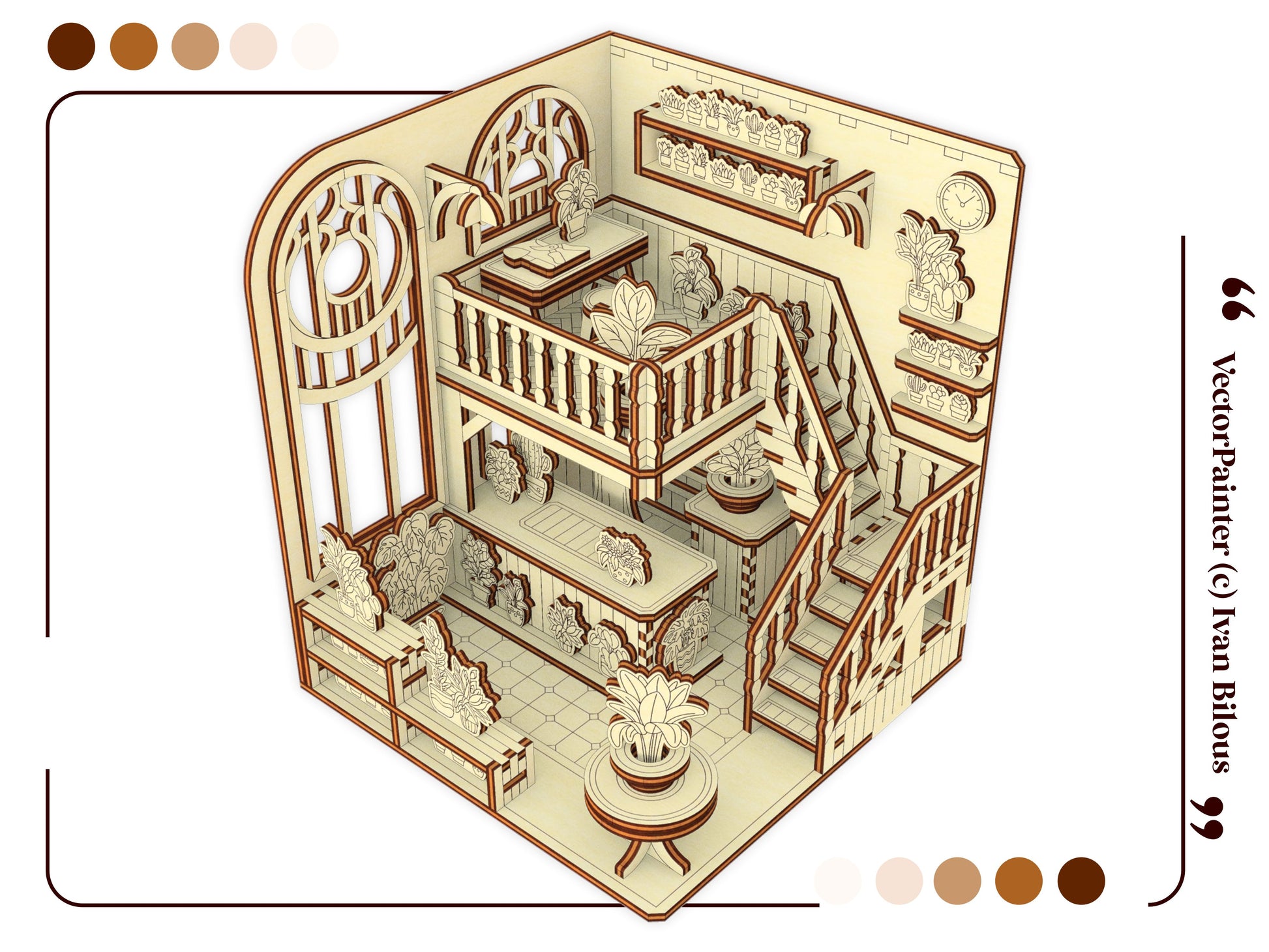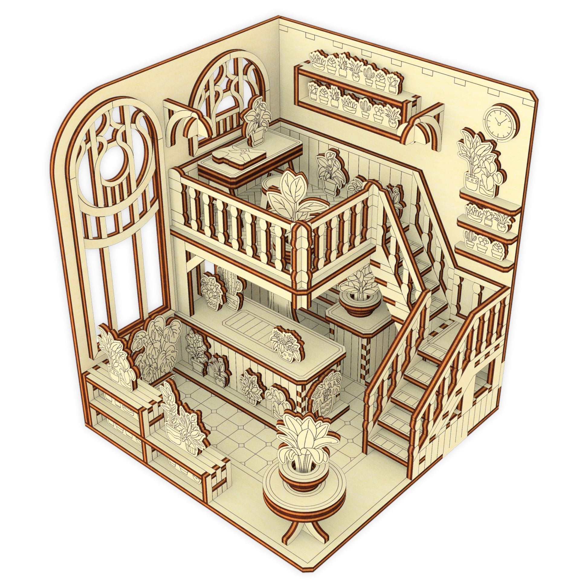 Book Nook laser cut file – Greenhouse miniature SVG design for creating a beautiful, light-filled diorama to place between your favorite books. This detailed project features glass-style panels, shelves with tiny plants, and an inviting walkway. A perfect DIY for book lovers, garden fans, and miniature collectors.