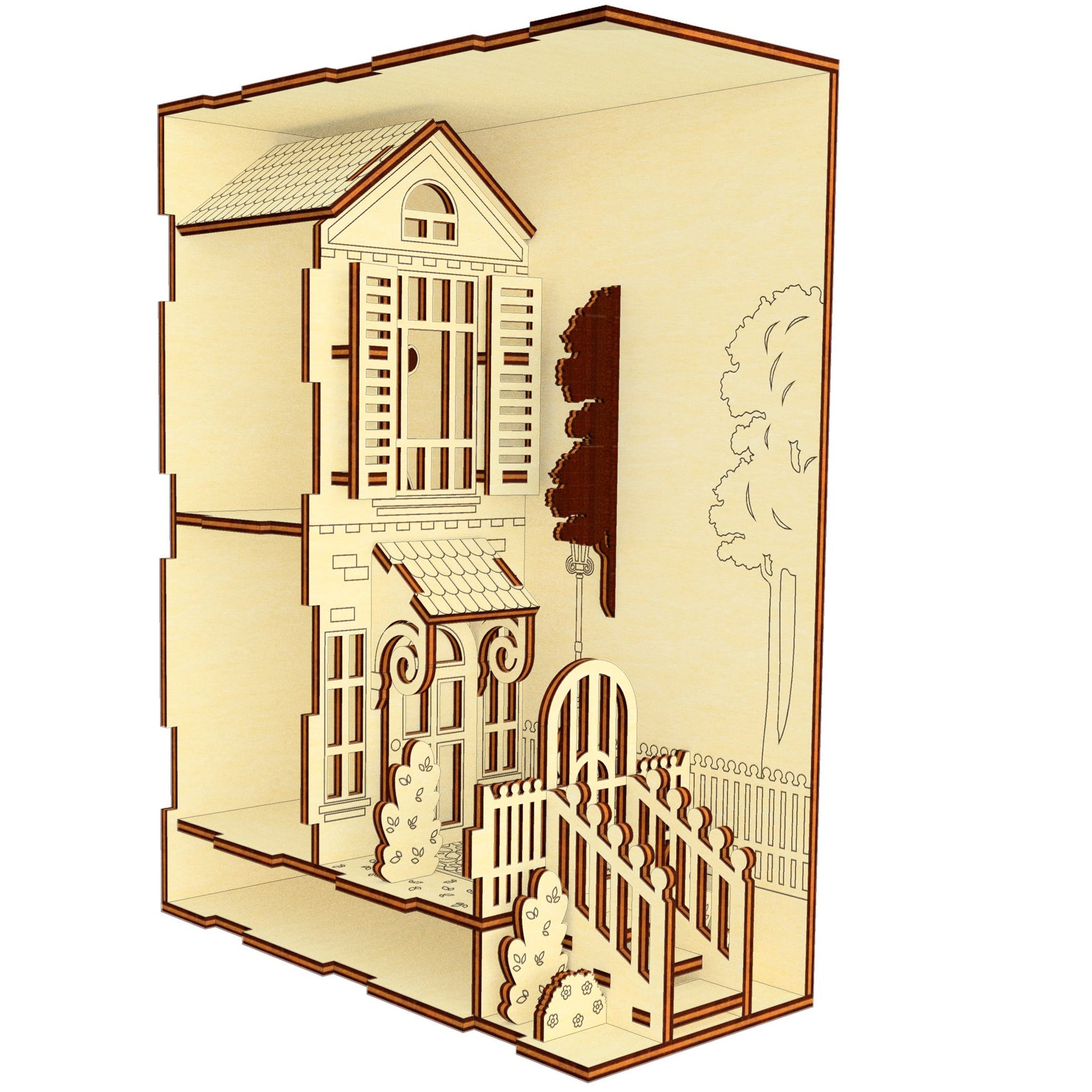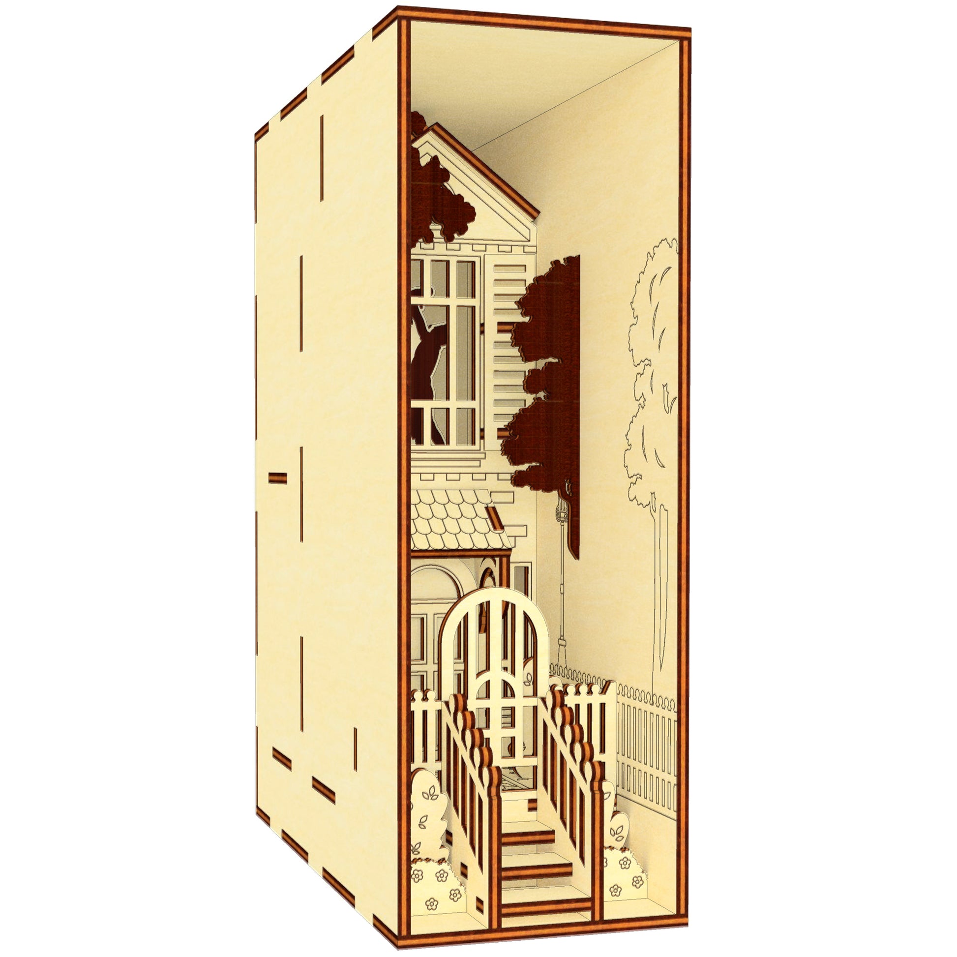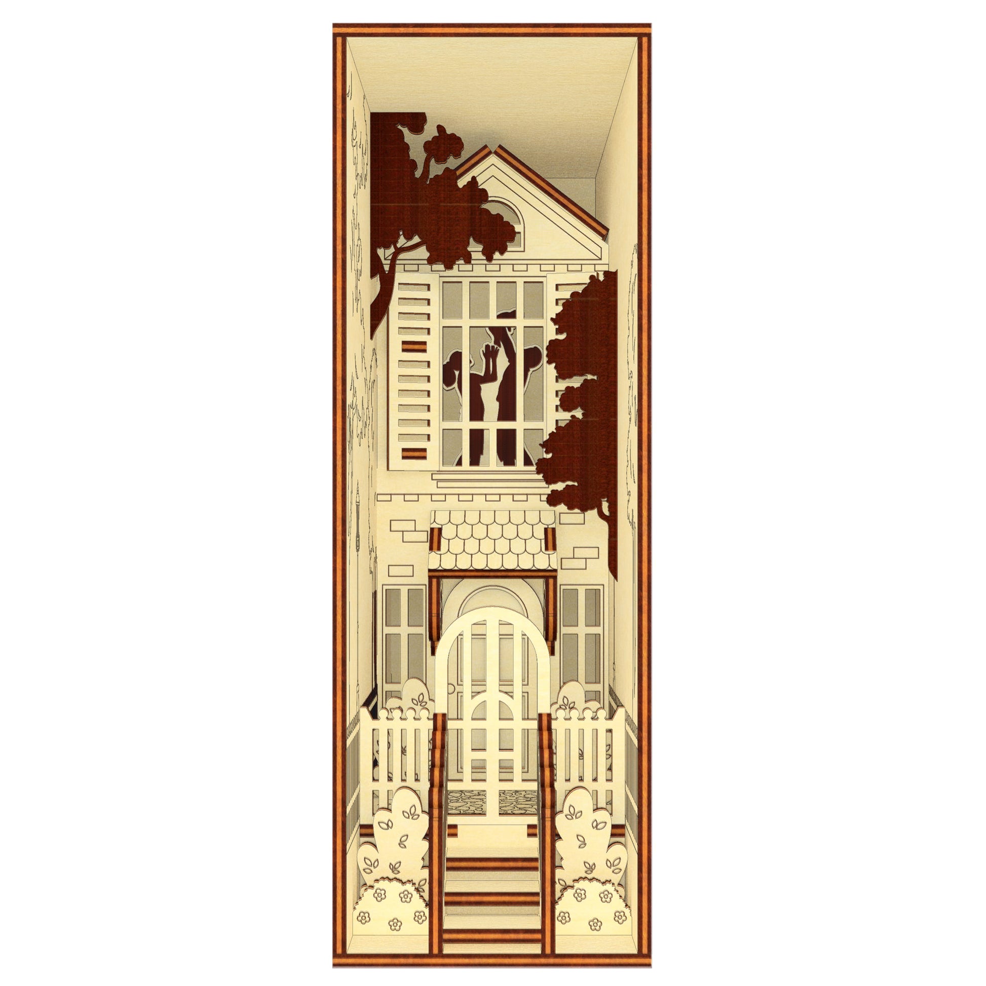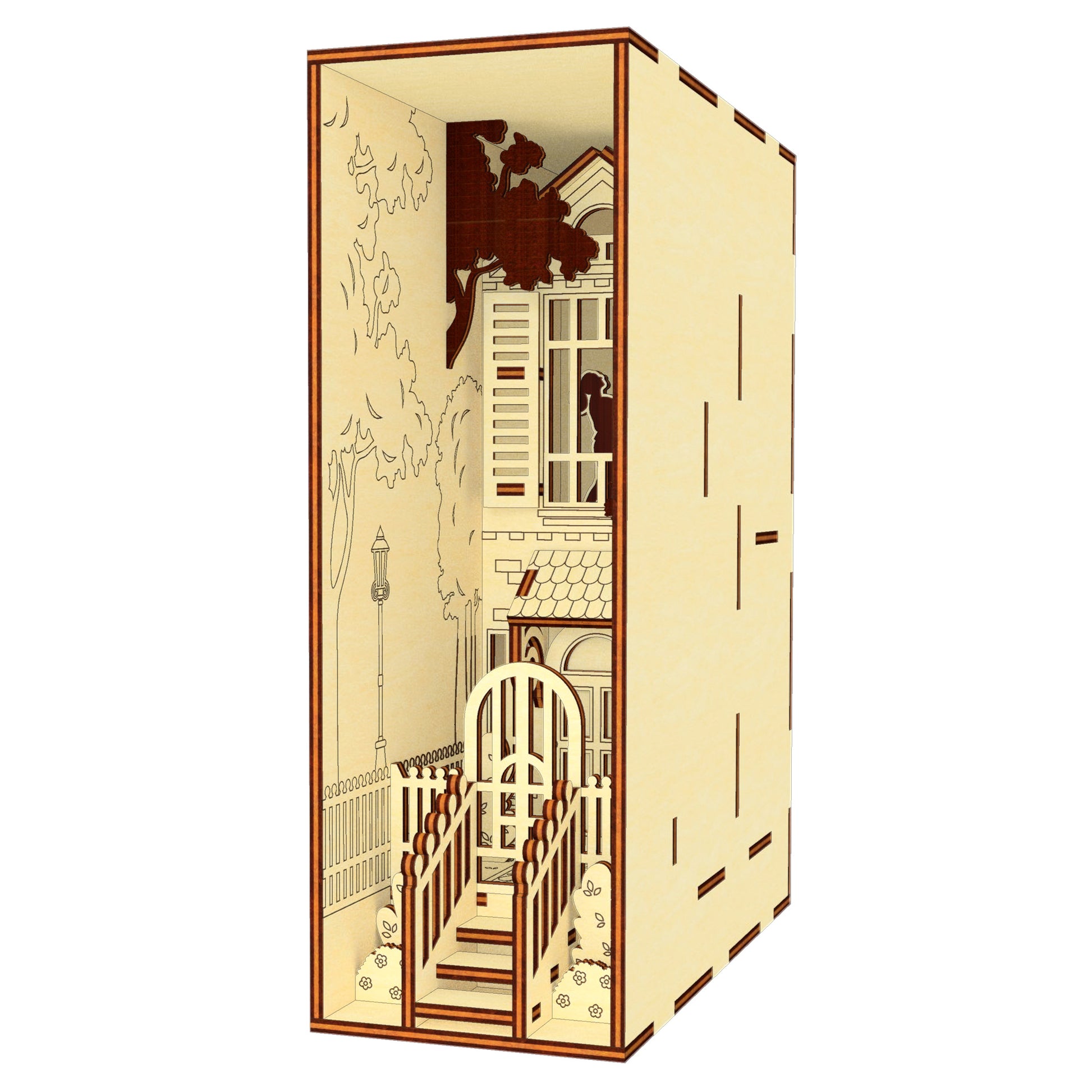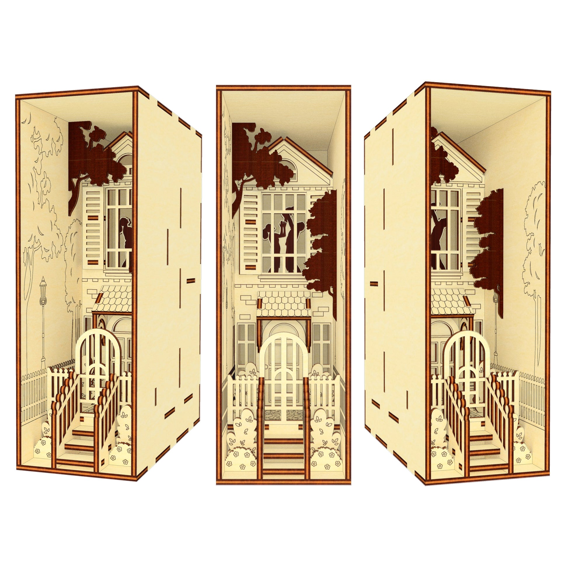 A book nook is a product that fits on a bookshelf between books and visualizes a small world, some scene or history.