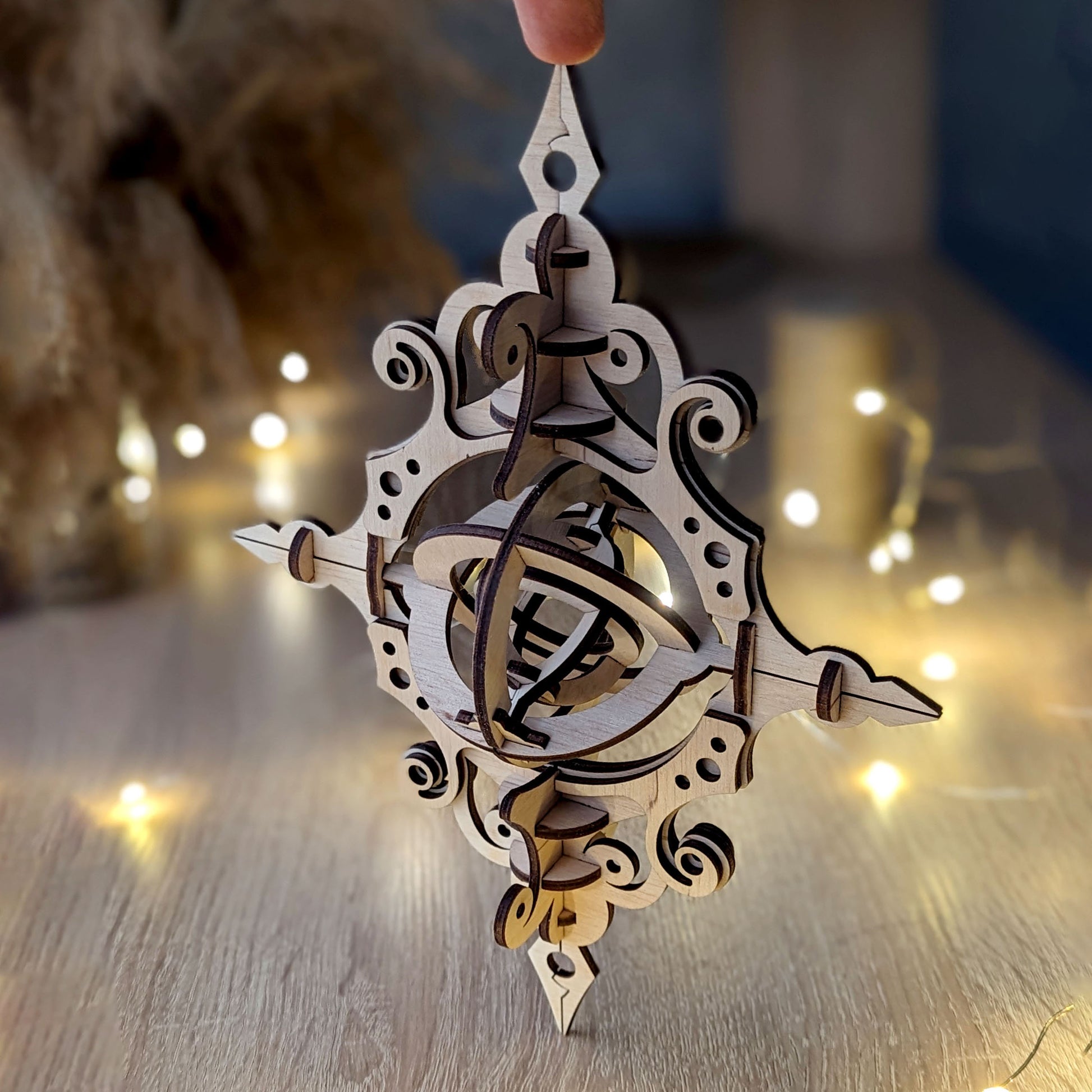 This is not a simple Christmas ornament. You may notice a sphere inside that is inside another bigger sphere. Both spheres rotate in different axes, which makes this ornament incredibly unusual and fabulous. I'm sure this design will make a great decoration for your home during the Christmas holiday season