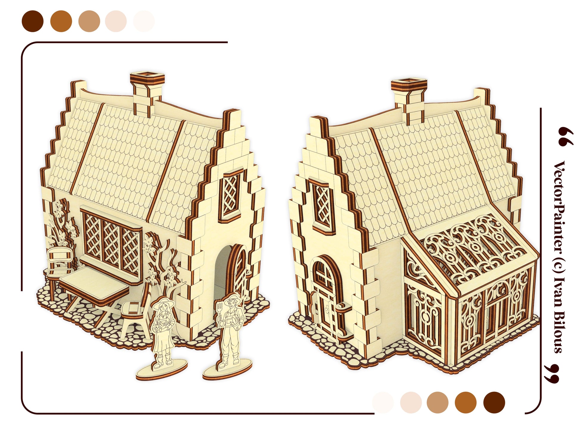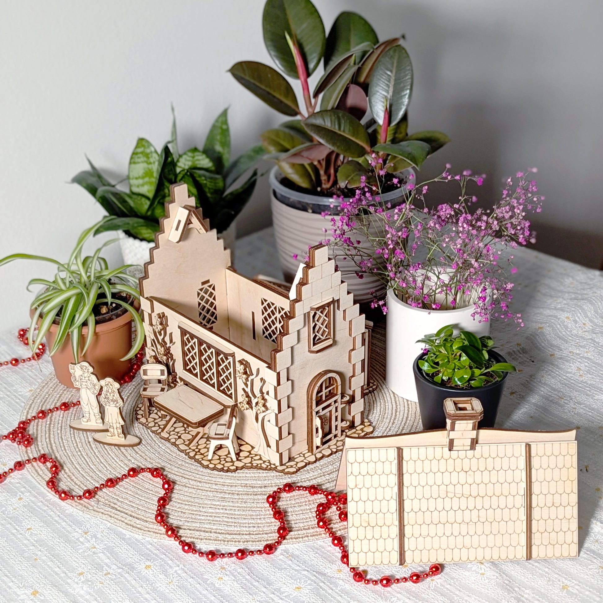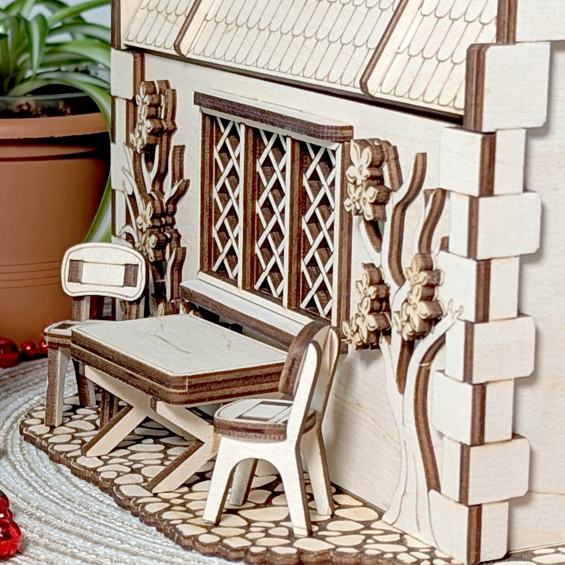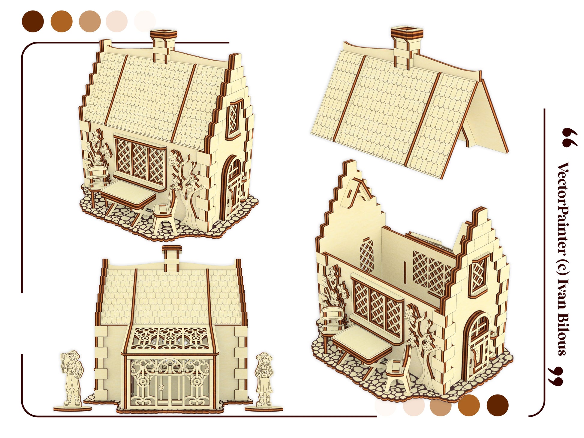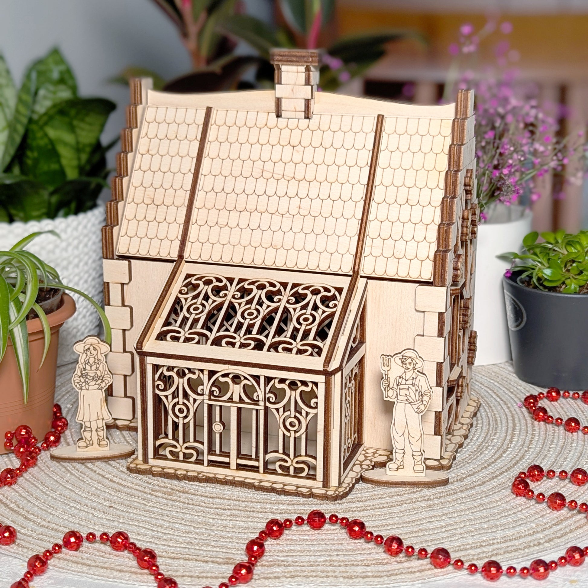 Craft a cozy and functional display piece with this Garden Cottage and Greenhouse Laser Cut File – a detailed SVG design that combines rustic charm with practical creativity. The roof opens for easy access, allowing the cottage to be used as a decorative storage box, while the working front door adds playful interactivity. Included are two standing figures, perfect for storytelling, displays, or dollhouse-style scenes.