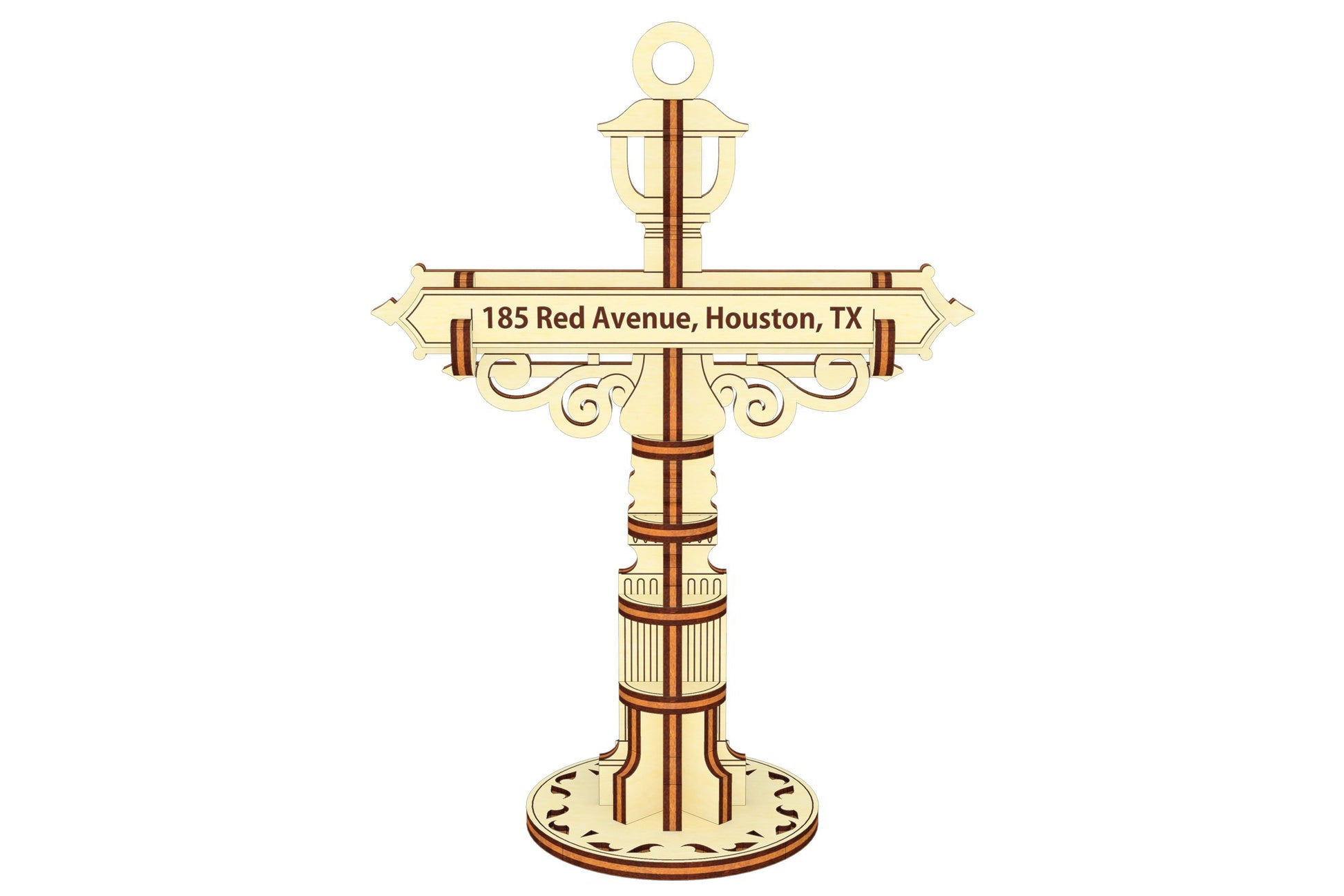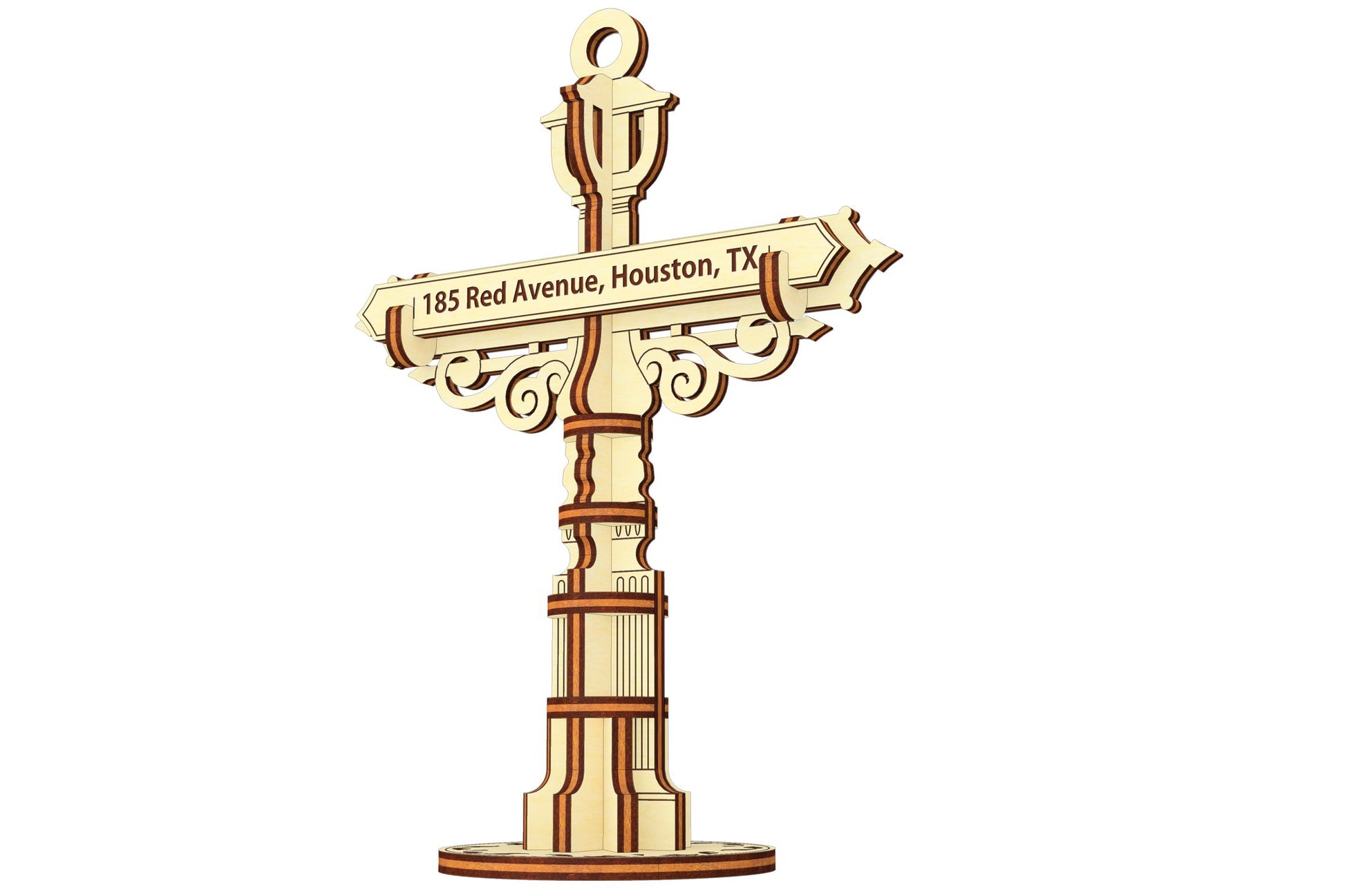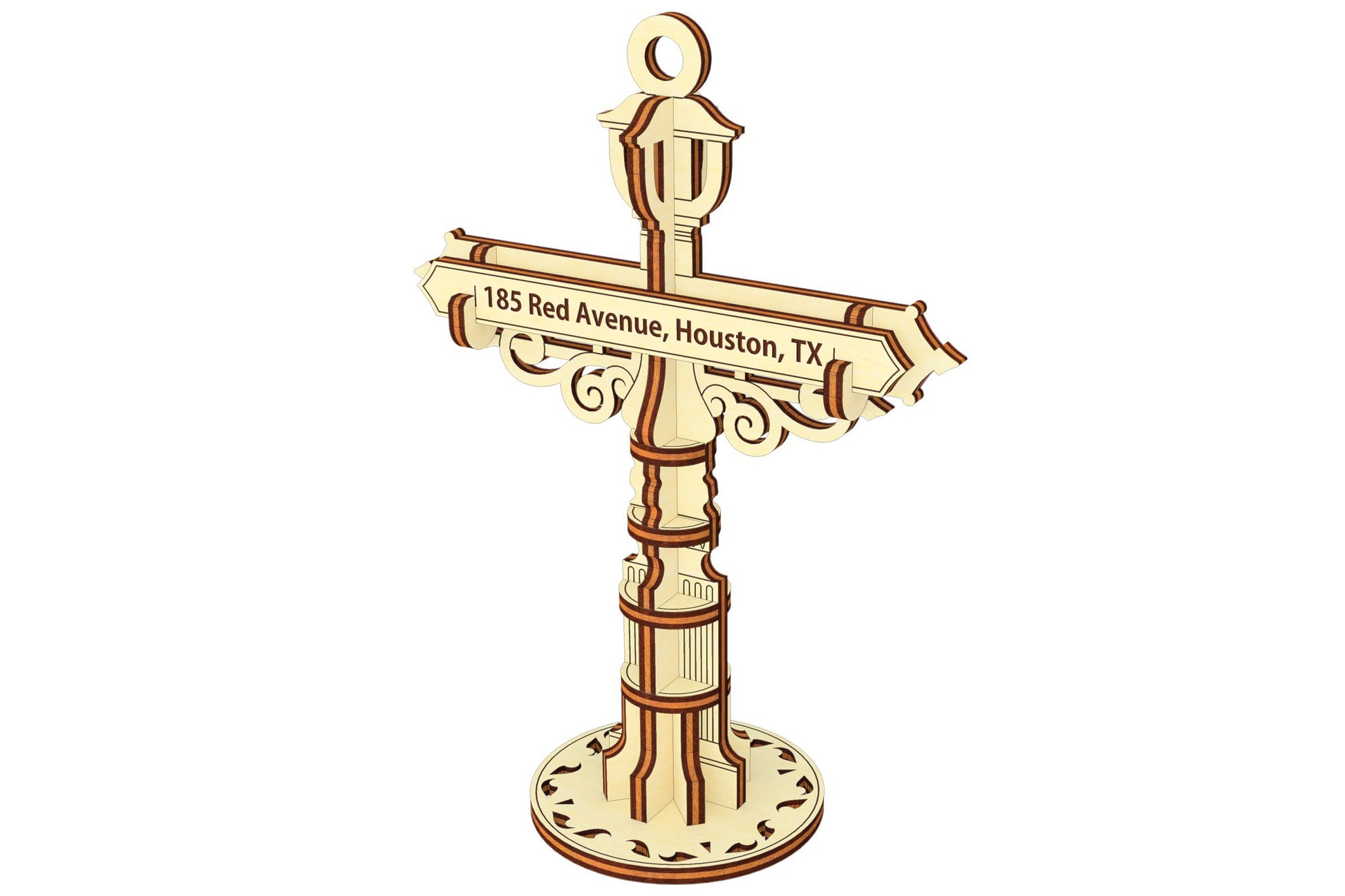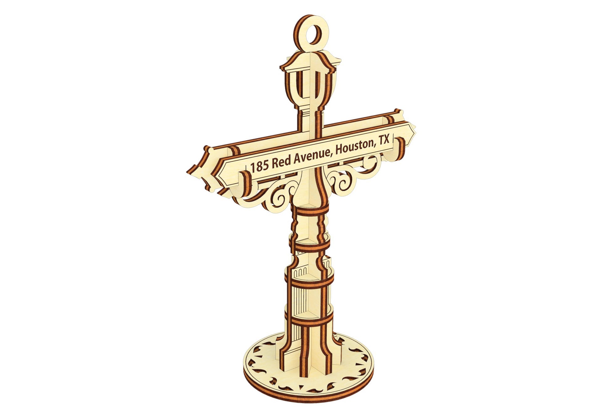 This is a Personalized Road Sign Ornament Laser Cut Design. Add a unique touch to your space with this laser cut design featuring a customizable address panel on a classic road sign ornament. This plan allows you to create a personalized decor piece that reflects your home's location or a special place in your heart.