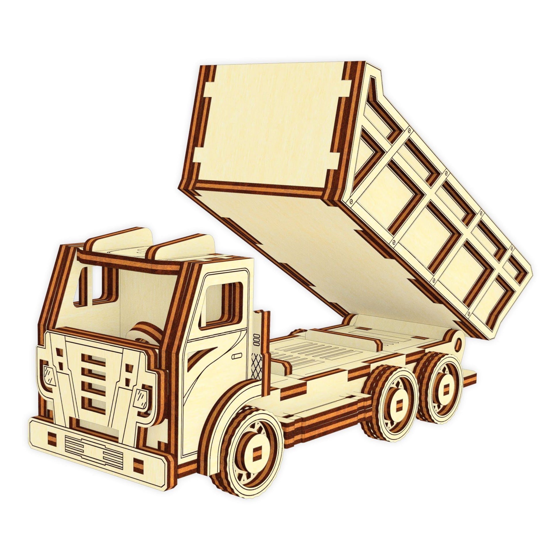 The Laser Cut Dumper Truck is a detailed and sturdy model, reflecting the robust industrial design of real-world dump trucks. This model features a sleek cab, large wheels for stability, and a functional dump bed that tilts to simulate real unloading action. Download the files today to build your own dumper and bring your miniature construction site to life!