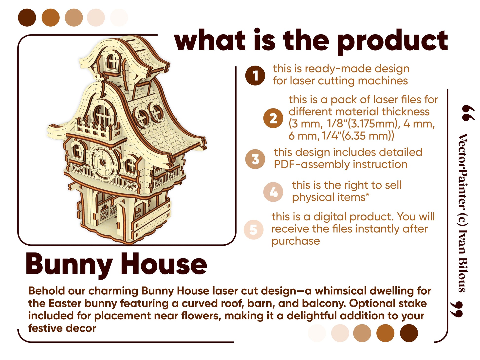 Introducing our Easter Bunny House laser cut design — an enchanting retreat for garden bunnies. This intricately crafted abode features a curved roof, detailed garden elements, and a bunny balcony. The SVG laser cut file, with step-by-step instructions, allows for easy assembly. Secure it near flowers with the optional stake for a whimsical addition to your garden decor. Download the file today and bring joy to your outdoor space with this charming creation.