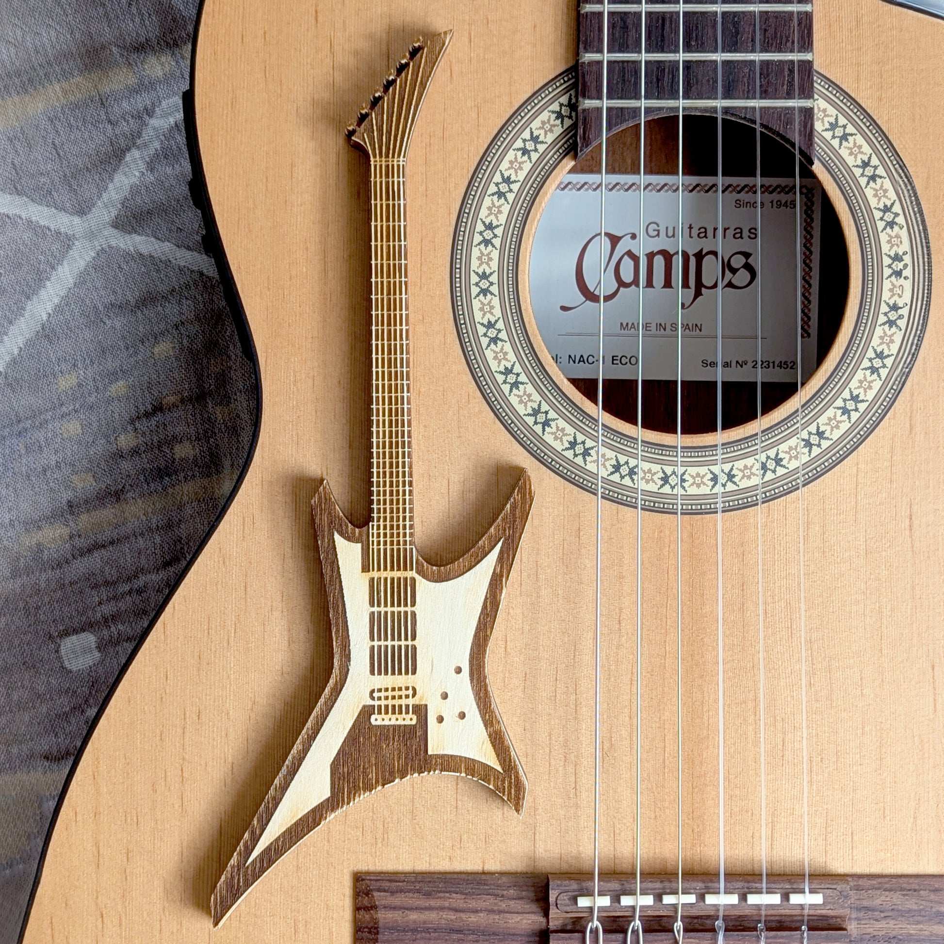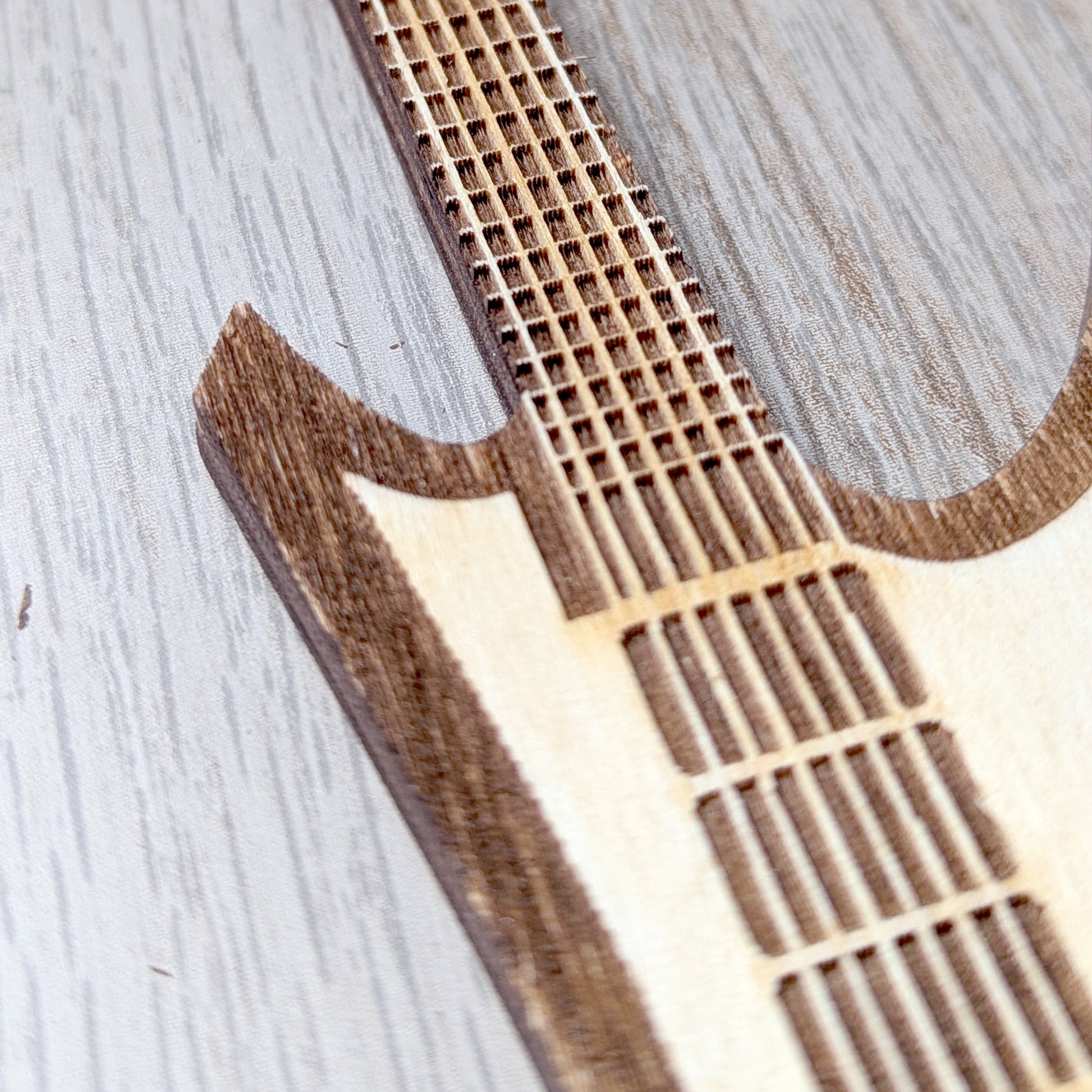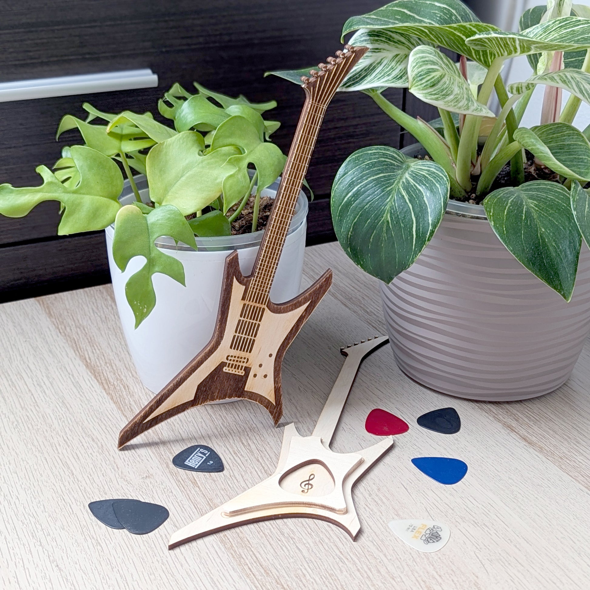 Laser cut file – electric guitar pick holder SVG template. Inspired by the iconic shape of an electric guitar, this fun and functional design keeps your guitar picks organized in a stylish way. Ideal for musicians, music lovers, or as a DIY gift. The file includes vector formats ready for cutting with laser machines using plywood, MDF, or acrylic.