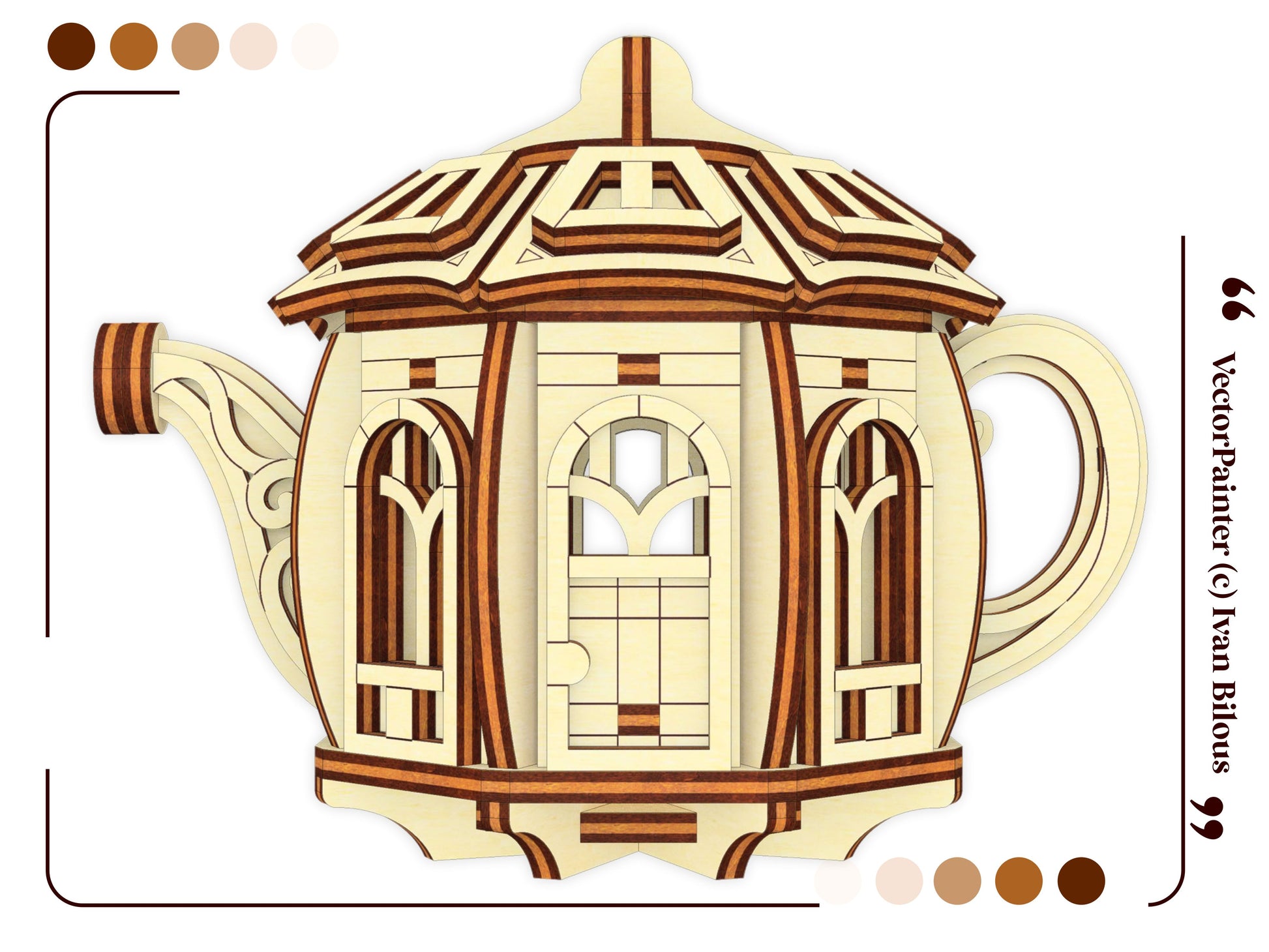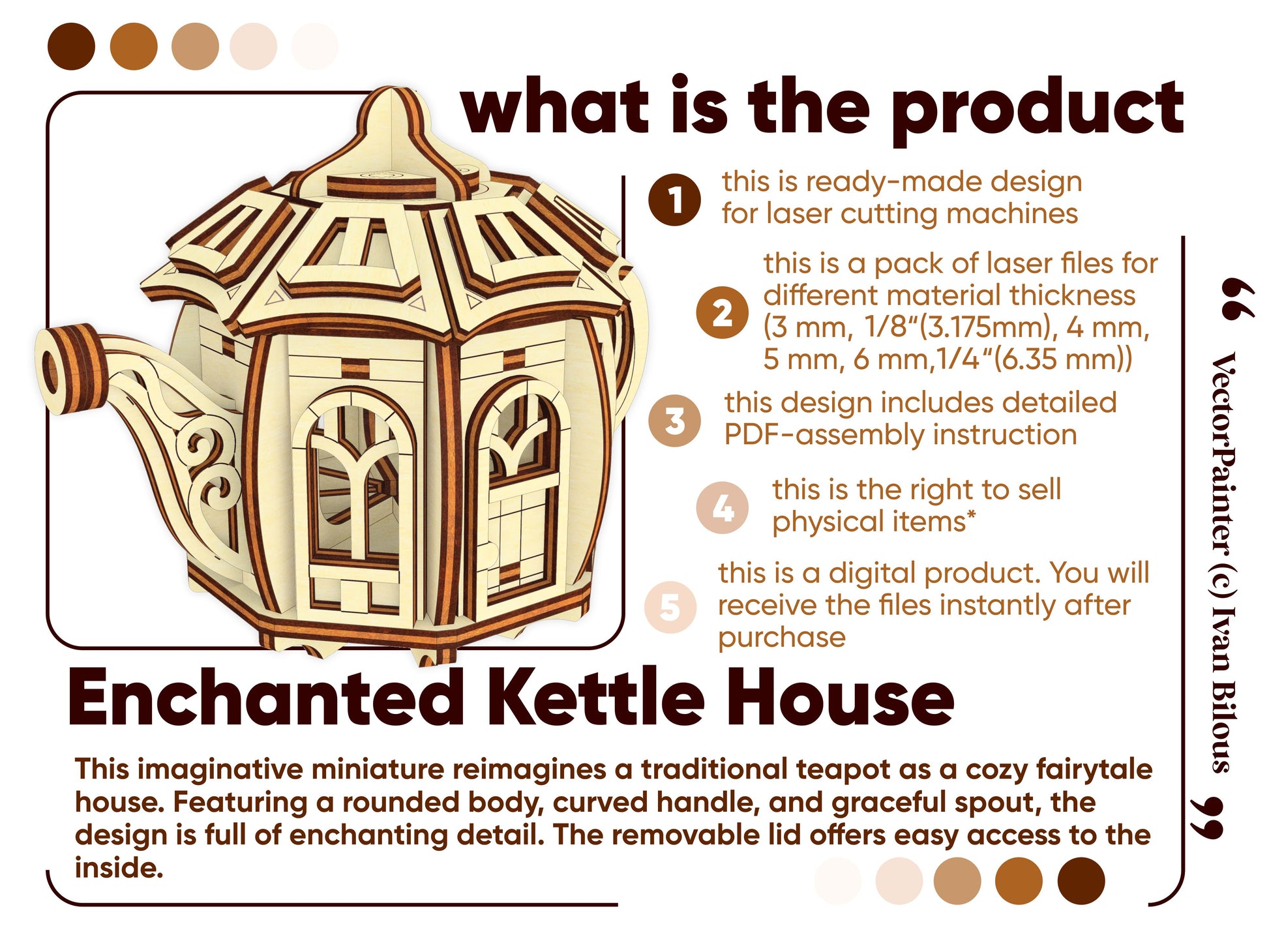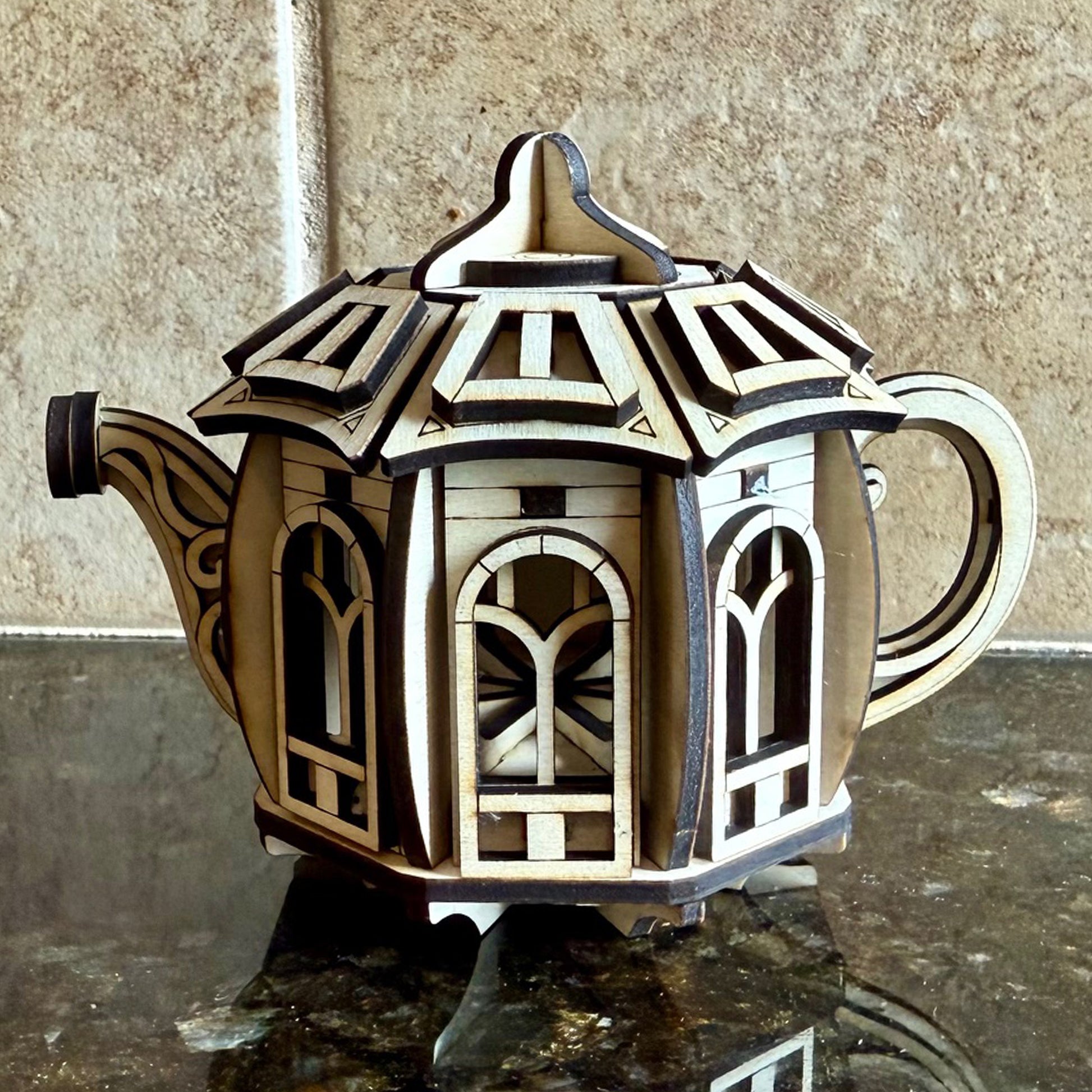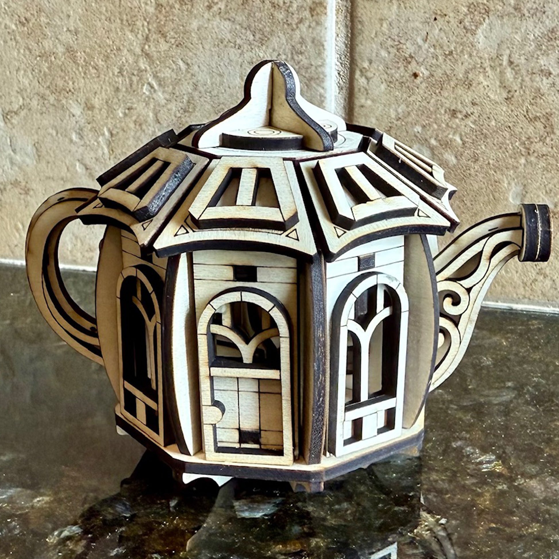 Enchanted Kettle House – Laser Cut File for crafting a whimsical fairy cottage from plywood or MDF. This magical design combines the charm of a teapot with storybook details. Ideal for garden décor, fairy scenes, or imaginative displays, the model includes a removable lid.