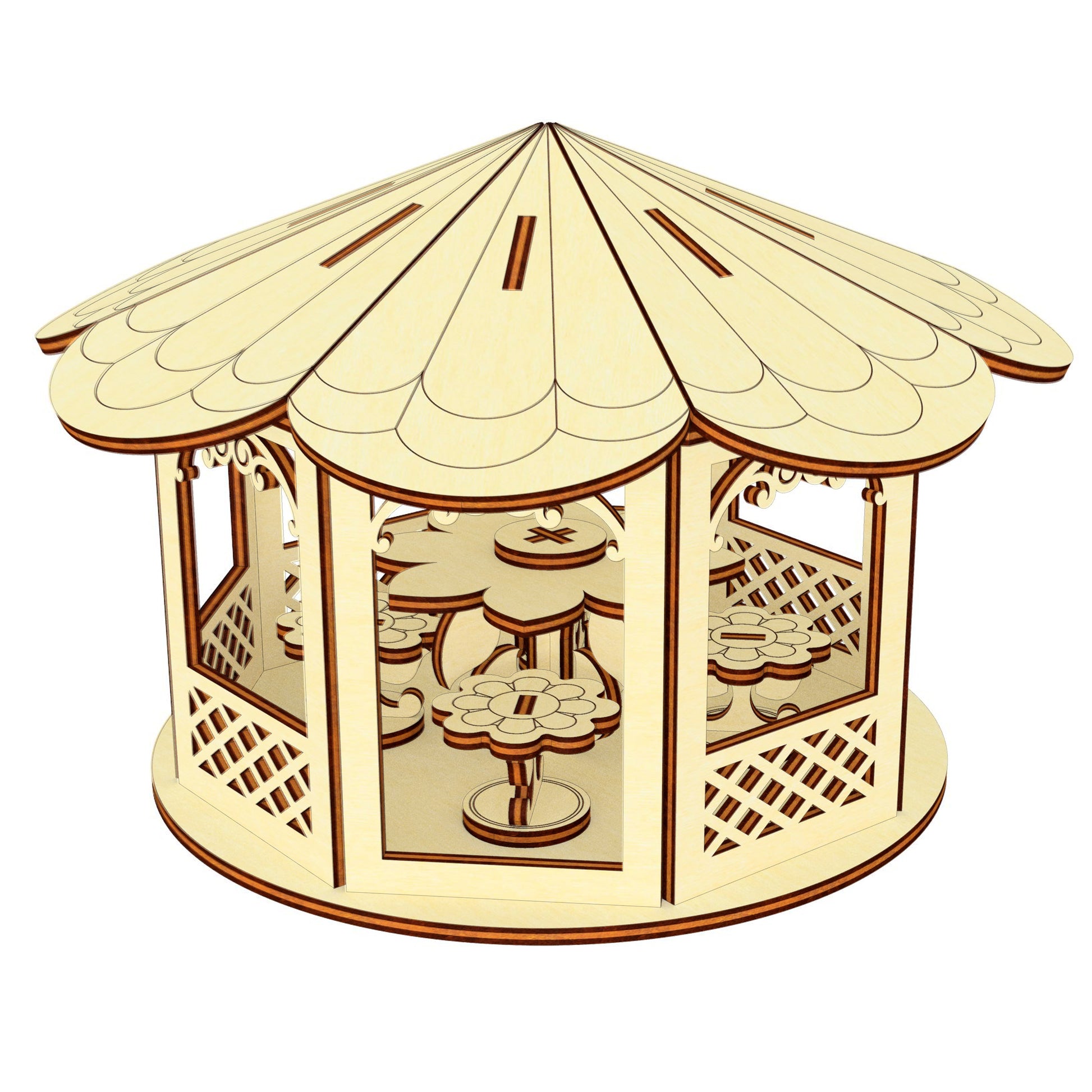 This design is a little forest fairy garden. Here you will find a gazebo, a table, a chair, a well, a couple of large flowers and a fence with a wicket. This set is an addition to the Fairy House, but you can also use this one as a stand-alone design or for your dollhouse.