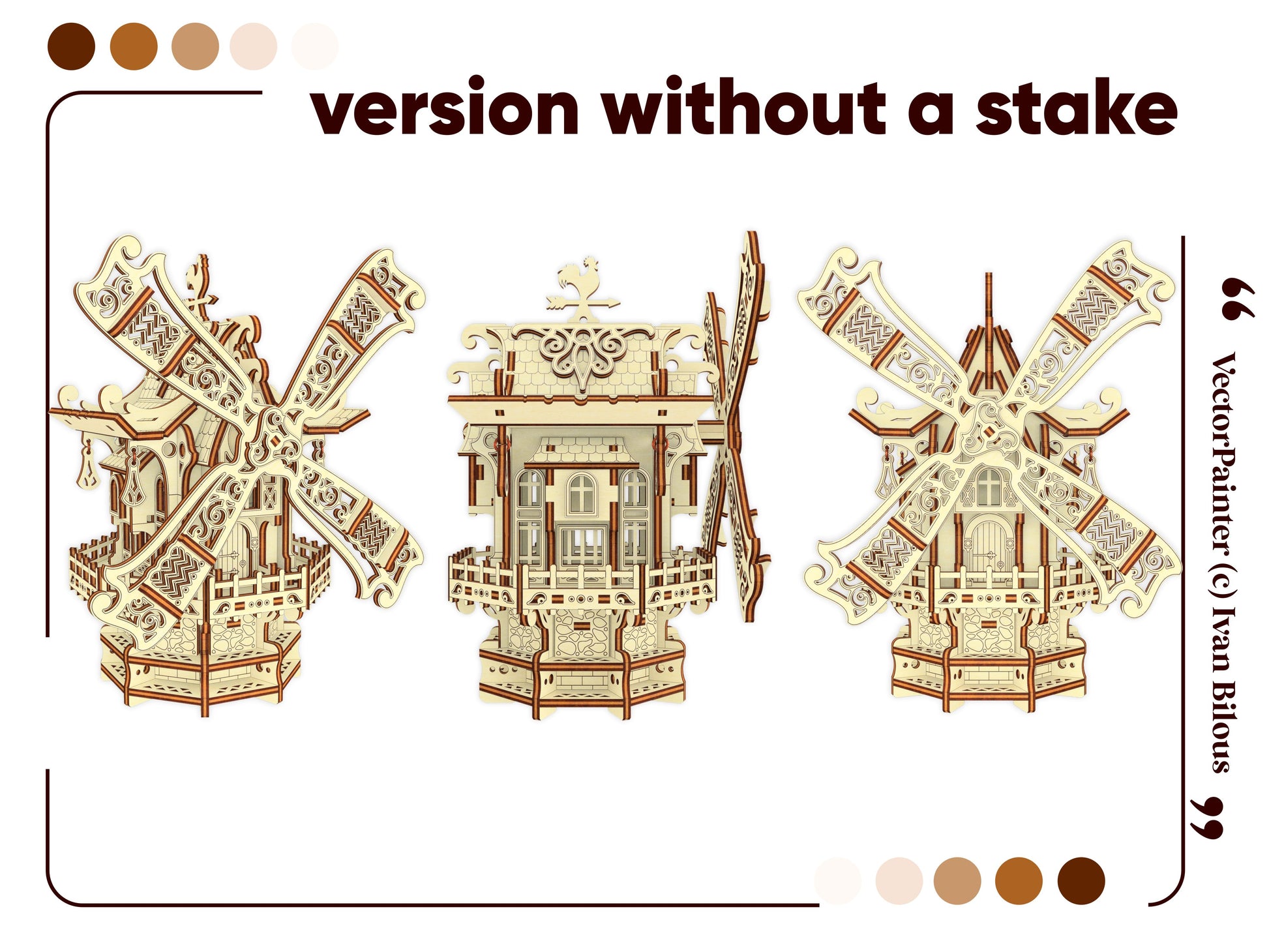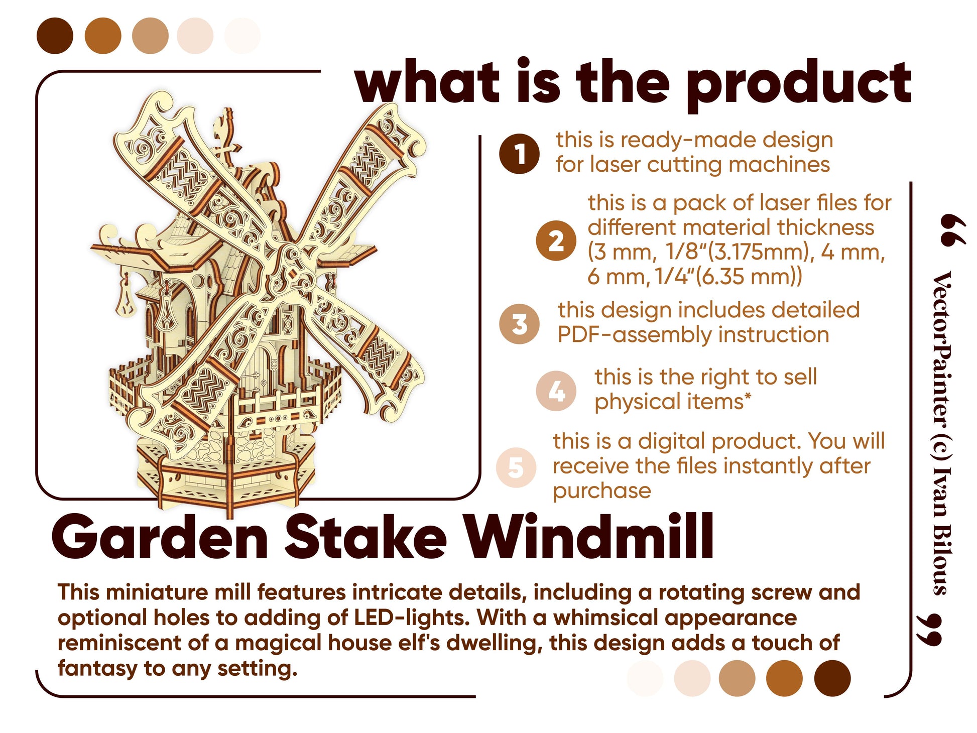 Transform your space with this enchanting Laser Cut Design of a Fantasy Windmill. This miniature mill features intricate details, including a rotating screw and optional holes to adding of LED-lights. With a whimsical appearance reminiscent of a magical house elf's dwelling, this design adds a touch of fantasy to any setting. Whether as a decoration or part of a fairy tale scene, it's sure to captivate your imagination. The design also includes an optional stake, thanks to which you can place the building in a flower pot or in your garden.
