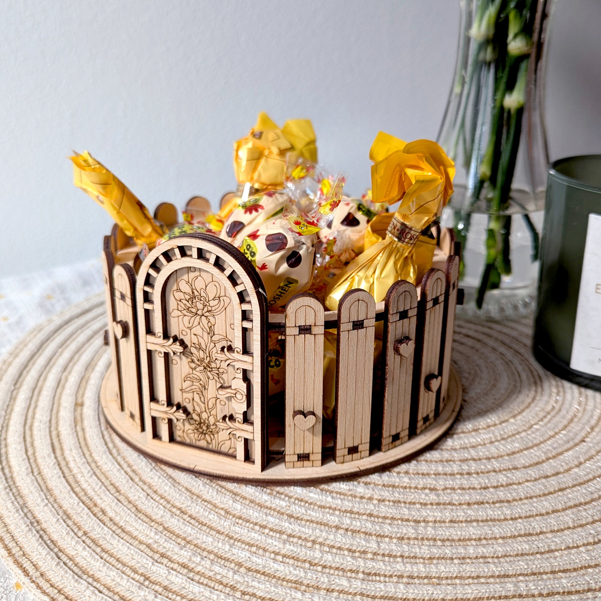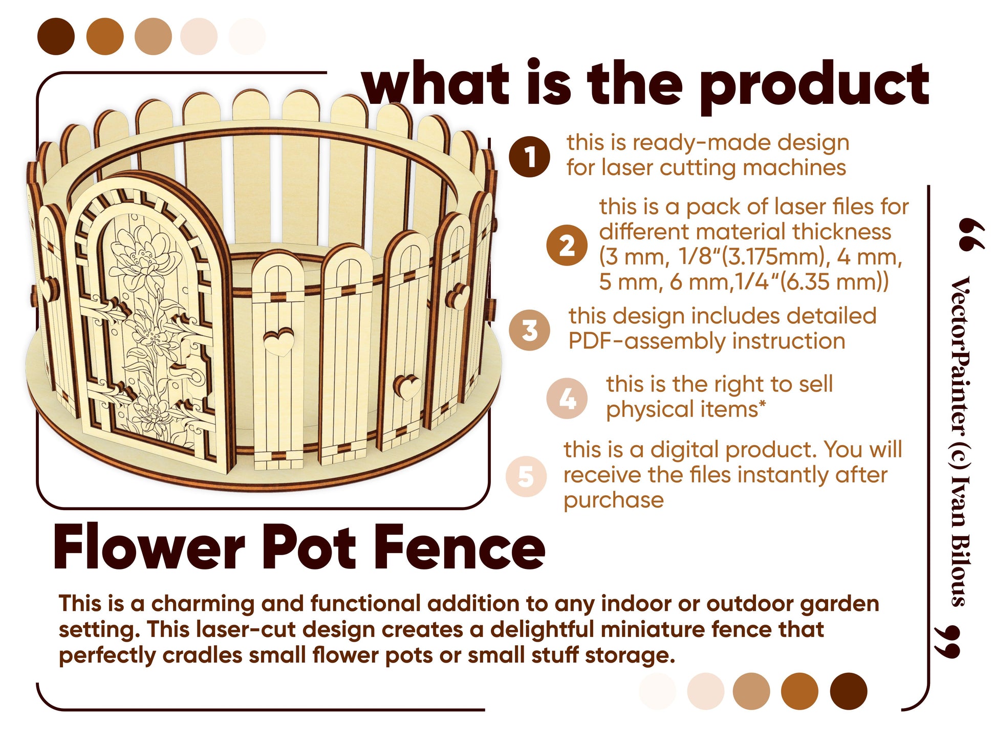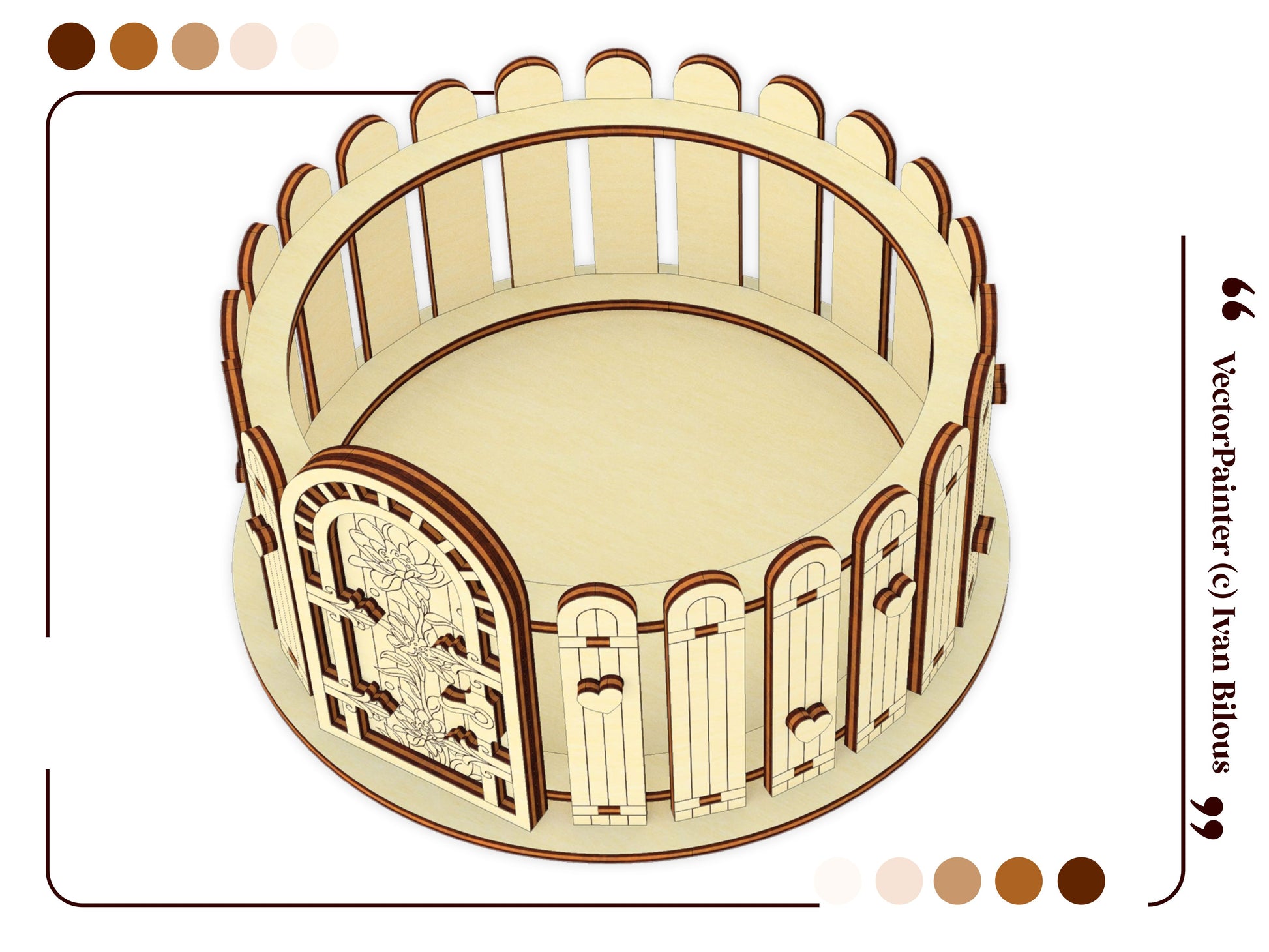 Garden Laser Cut File – Flower Pot Holder and Open Box Fence Design with a charming mini door. This SVG and DXF template is perfect for crafting a decorative wooden planter stand shaped like a picket fence, ideal for small flower pots, candy gifts, or garden-themed storage. Designed for use with Glowforge, xTool, this project adds a rustic, handcrafted touch to your garden decor, gift table, or home display.