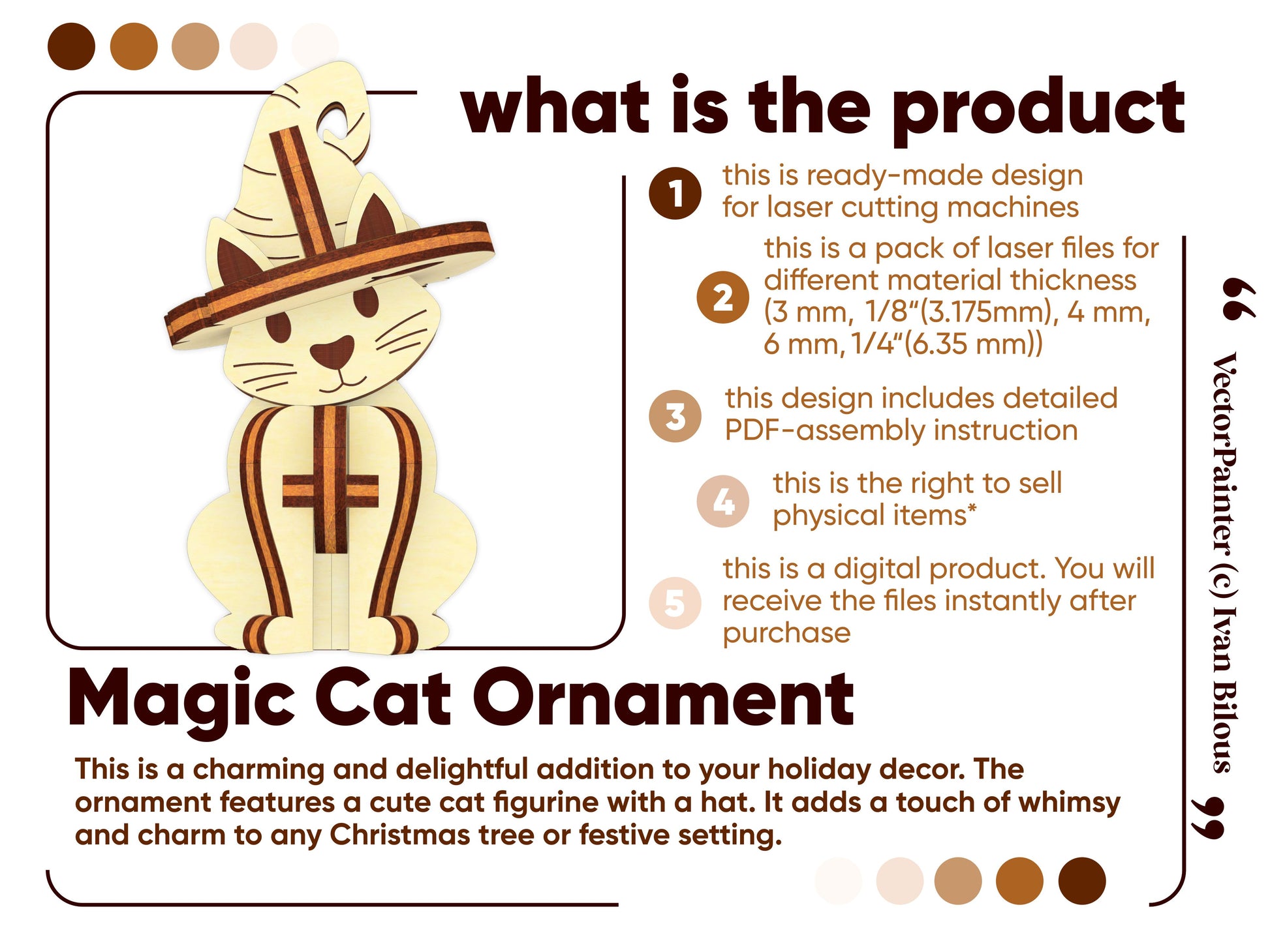 Introducing the Halloween Magic Cat in a Hat Laser Cut Ornament, a charming and whimsical creation that features a plywood cat nestled within a mystical magic hat. This delightful ornament captures the essence of enchantment and playfulness, making it a perfect addition to your holiday decor and beyond. Crafted with precision, the intricate plywood design showcases the elegance of laser cuts. The provided laser cut files in SVG, DXF, AI, and CDR formats enable easy replication of this enchanting piece. Elevate your decorations with the "Magic Cat in a Hat" ornament, blending magic and charm in a single piece. Embrace the joy of this playful cat in a magical hat, bringing wonder and smiles to your home throughout the year.