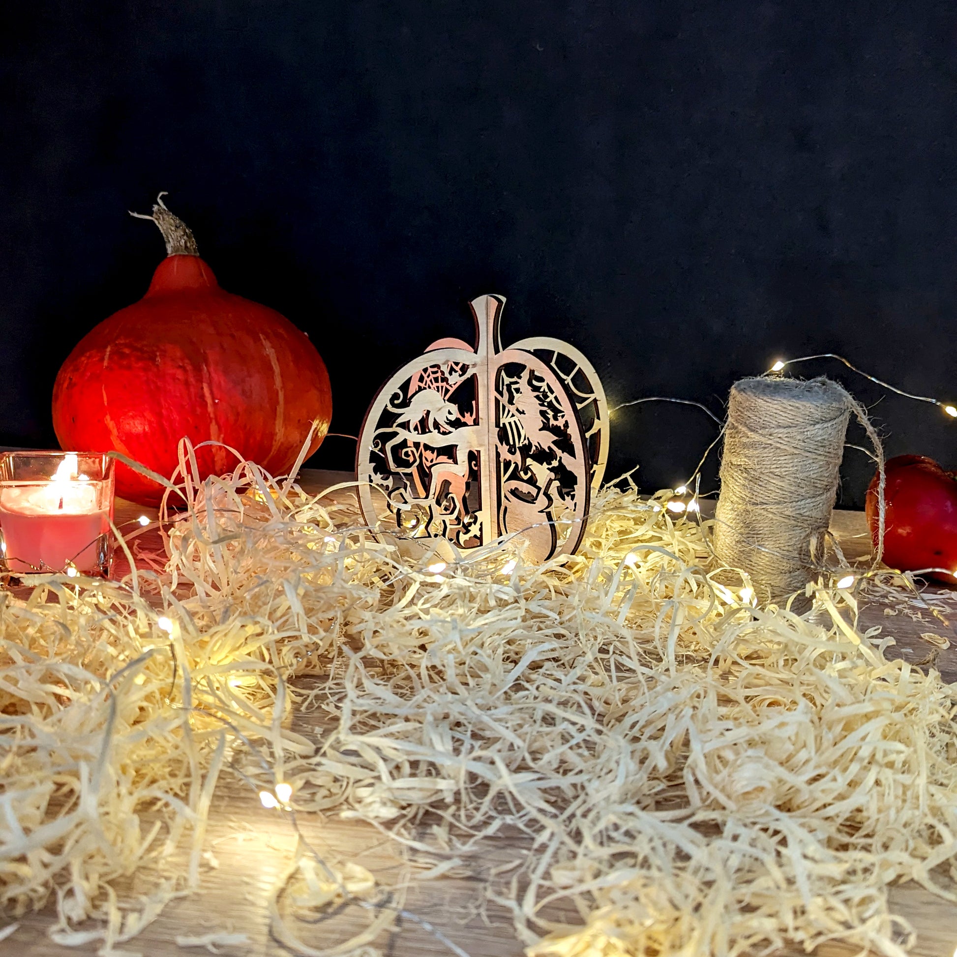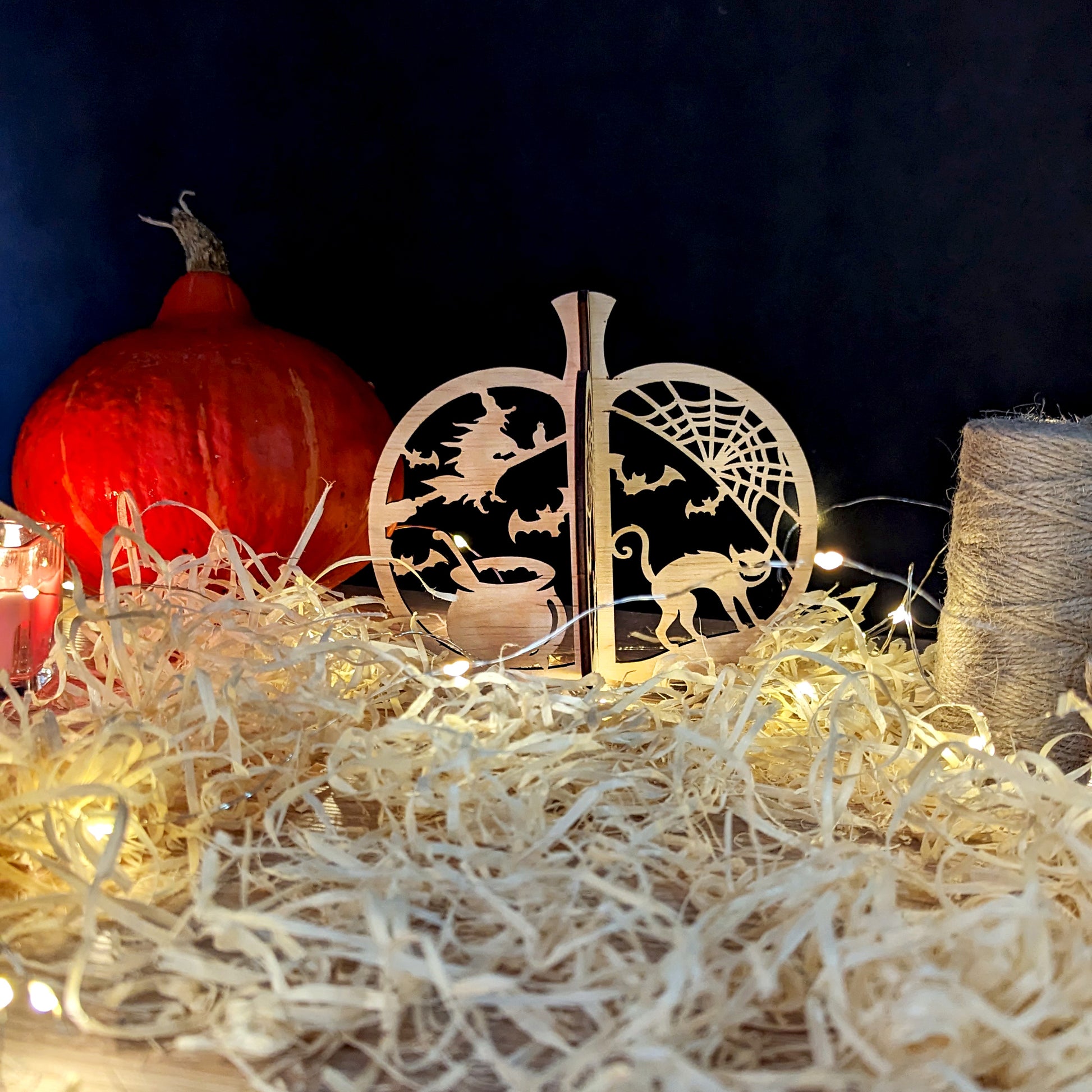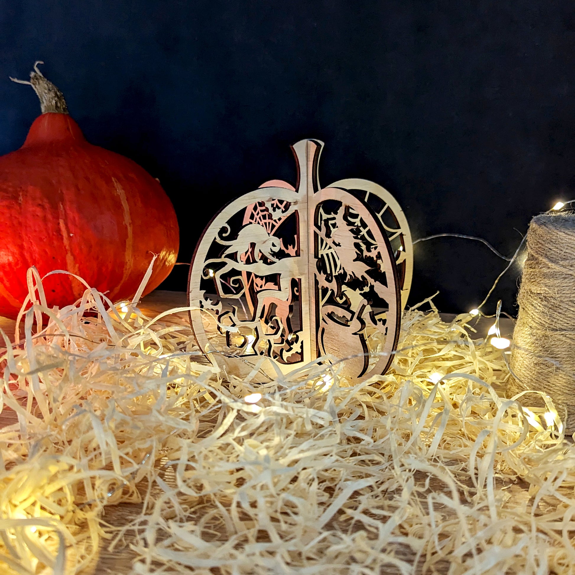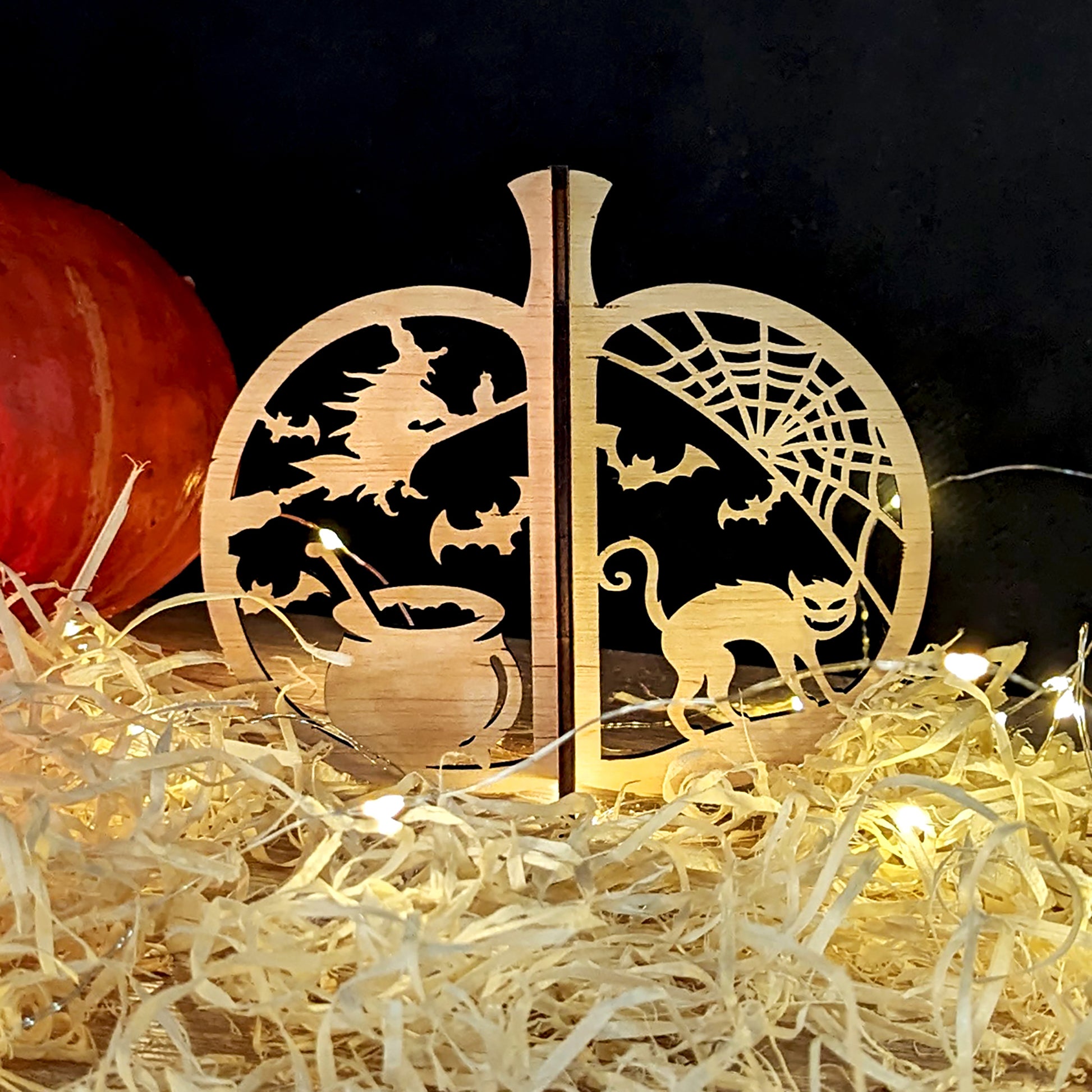 Spooky 3D Halloween Pumpkin Laser Cut File - Unleash your creativity with this 3D laser cut Pumpkin design with a witch, a cauldron, a spider web, and a mischievous black cat. Craft a bewitching masterpiece that captures the essence of Halloween in intricate detail. This laser cut file allows you to create a dimensional pumpkin ornament that will haunt your decor with spooky charm. Get ready to cast a spell on your Halloween celebrations! 🧙♀️🕷️🐱🎃