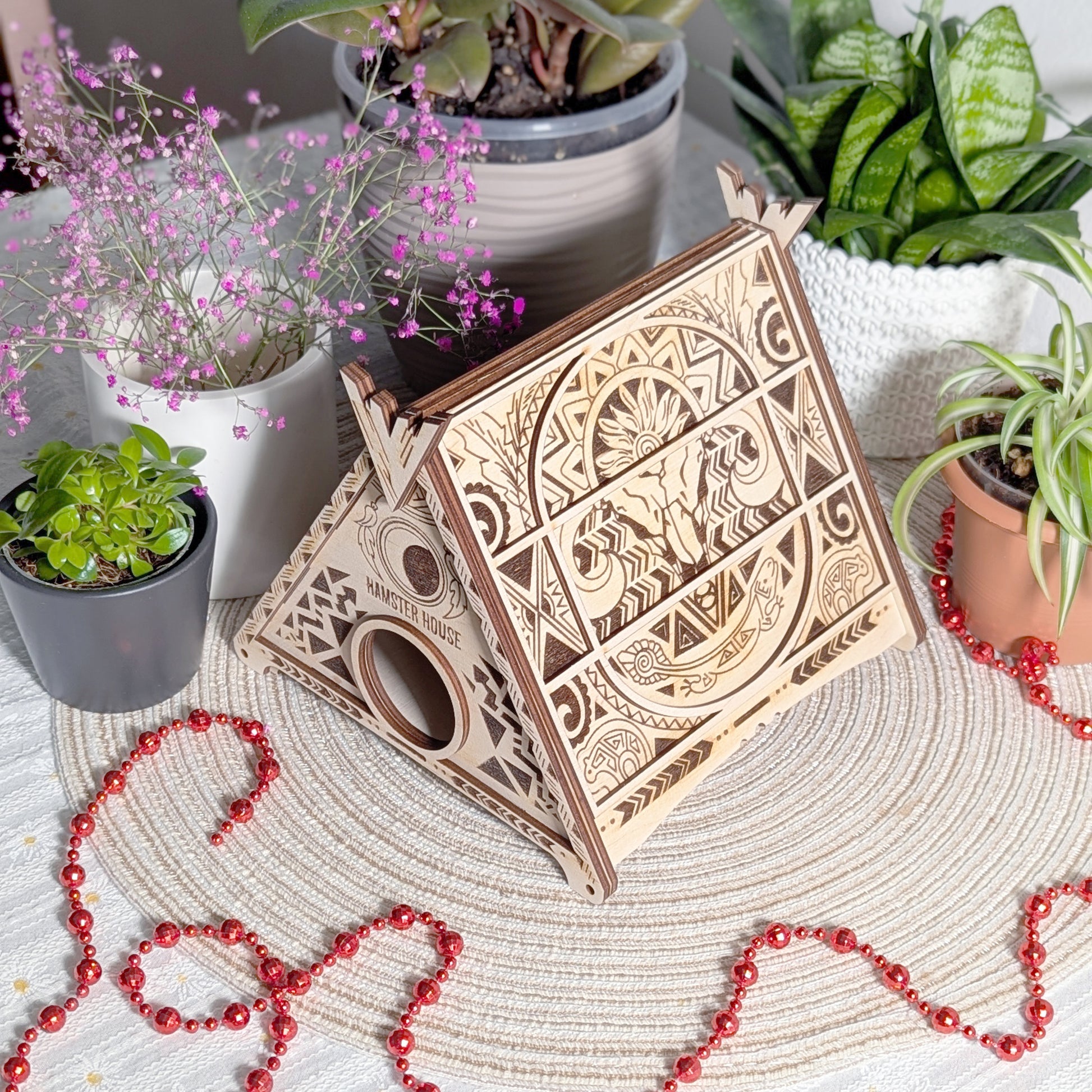 Laser cut plywood hamster house designed for cozy comfort and playful exploration. Designed with precision, this miniature habitat captures the essence of a charming retreat for your furry friend.
