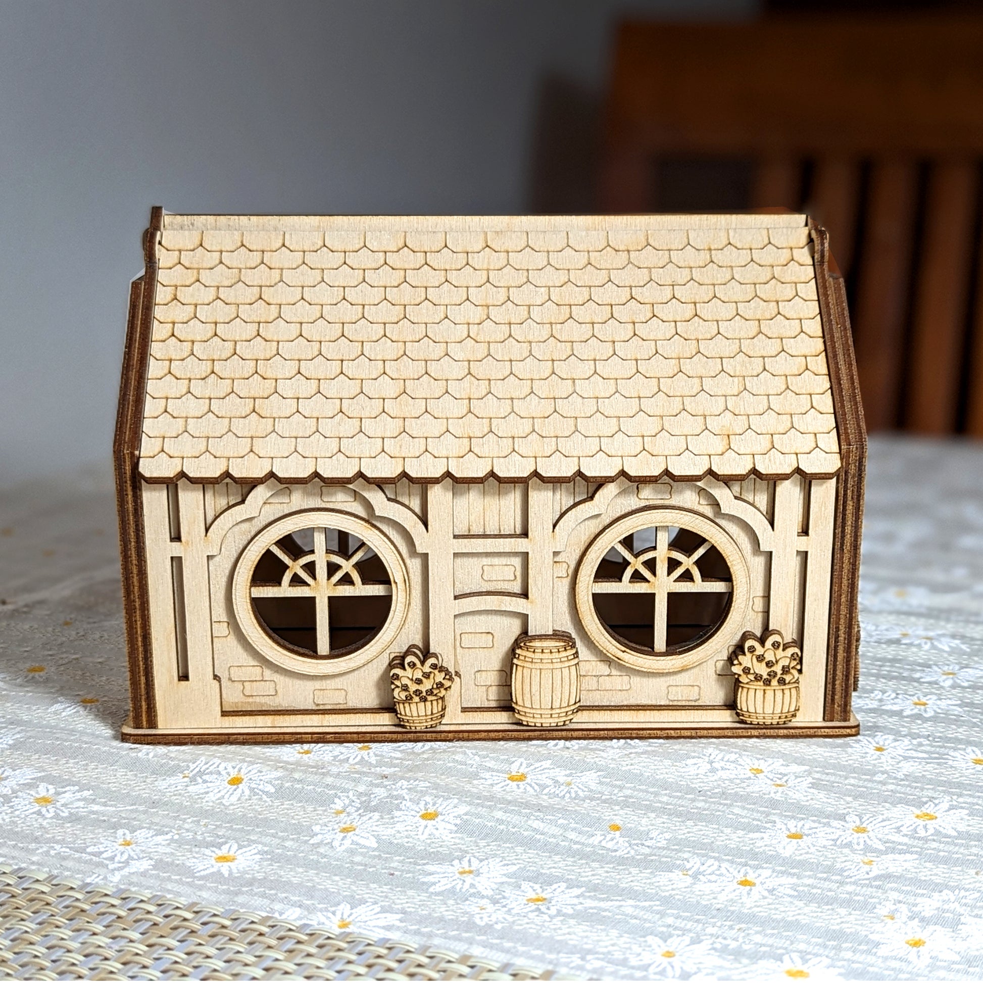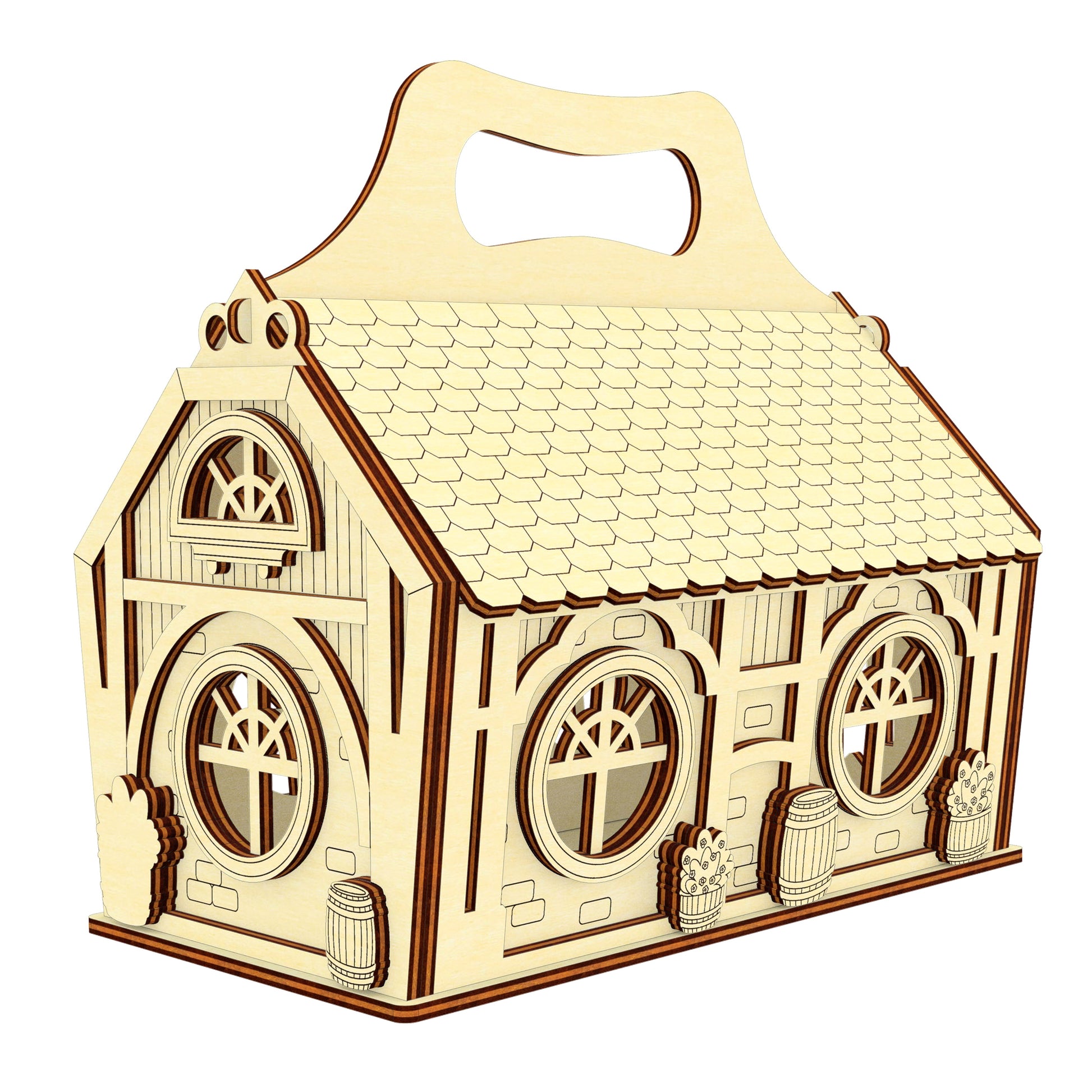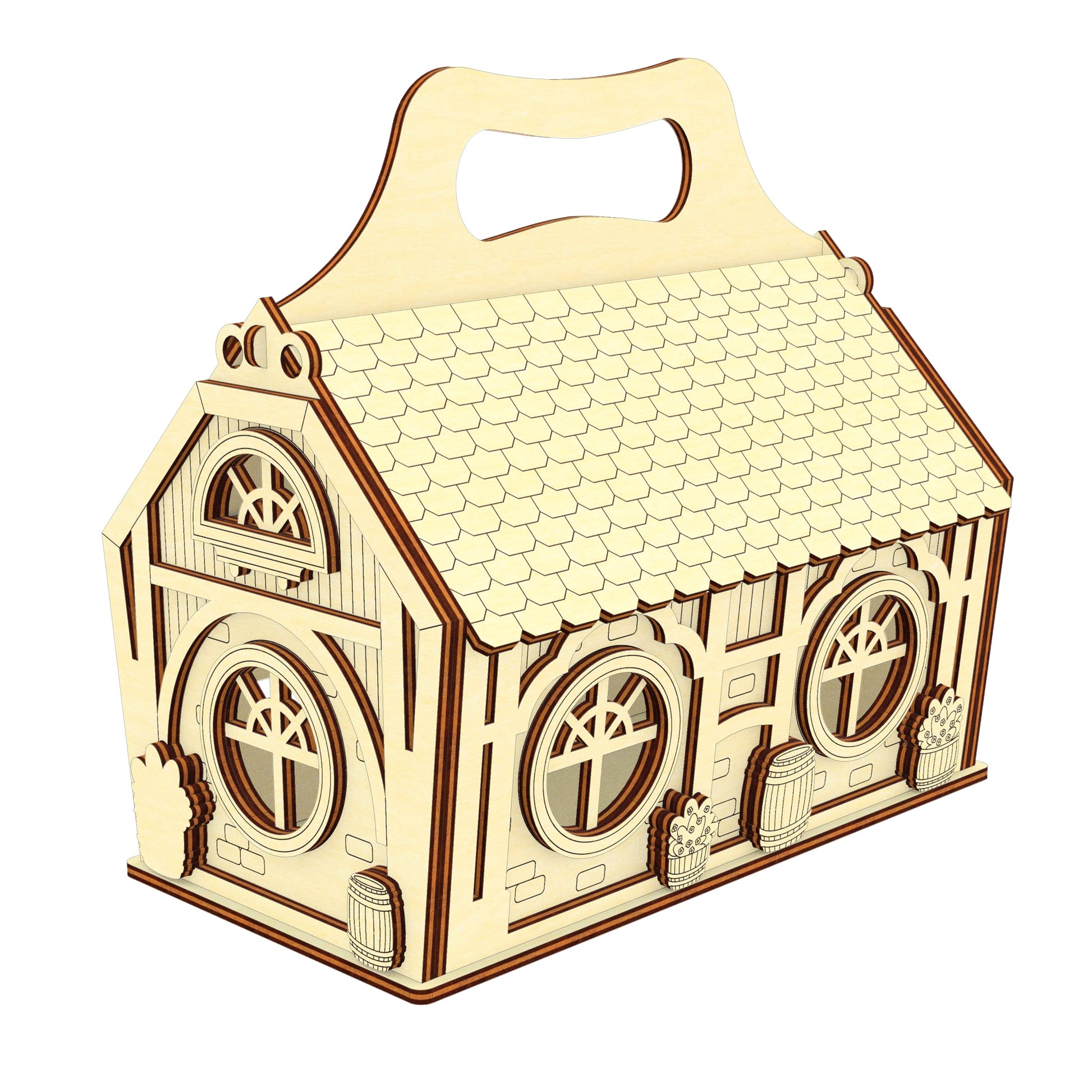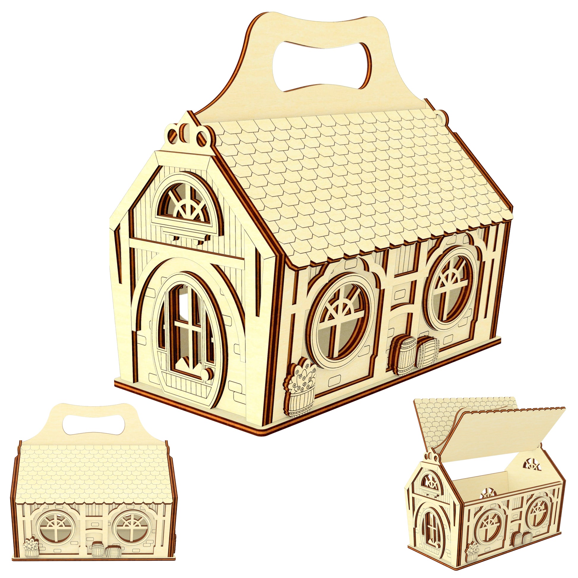 Introducing our laser cut design for a stunning sweets box in the shape of a fantastic house. This design features round windows, giving it a whimsical and enchanting look. The roof of the house opens like a box lid, and there is a handle on top for easy carrying (The handle is included in the design, but there is also a version without handle included in the file). The joints have been expertly hidden, giving the box a seamless appearance. This design is perfect for anyone who loves fantasy, architecture, and design.