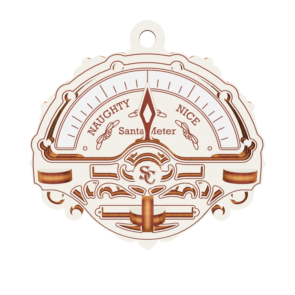 Get into the holiday spirit with this charming Laser Cut Design of Santa Meter ornament! This laser cut design features an interactive device that lets you determine whether you're on Santa's Naughty or Nice list. Move the lever to adjust the arrow on the scale. This delightful ornament is not only a fun holiday decoration but also a reminder of the magic of the season. Hang it on your tree, in your home, or give it as a whimsical gift to share the joy of Christmas. Make your holidays merry and bright with this unique Santa Meter ornament!