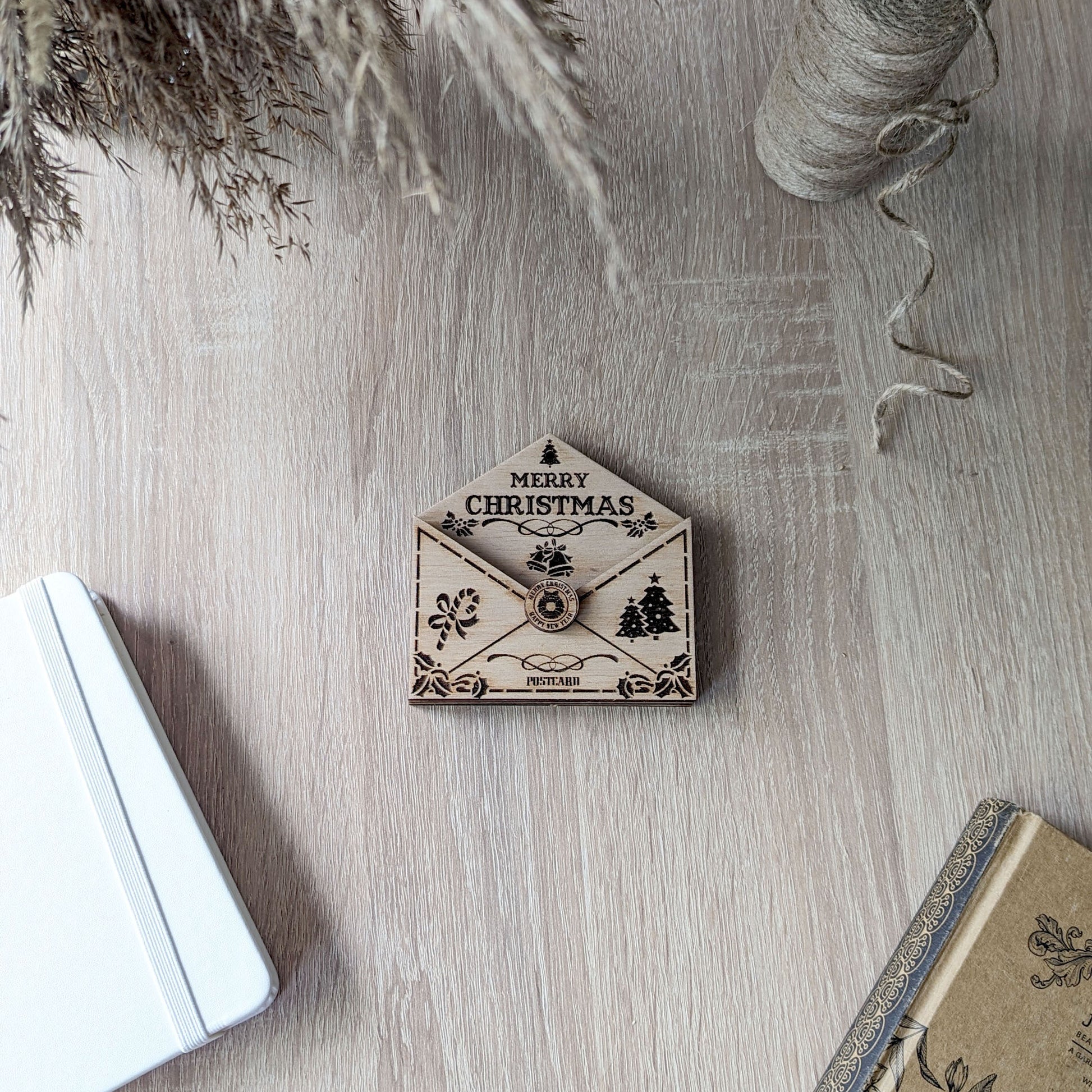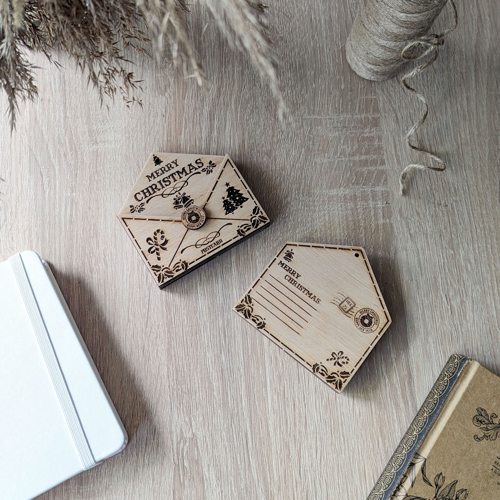 These are small ornaments in the form of a letter to Santa Claus. They are made up of several layers, allowing you to slip a small note or letter inside. There is a special hole at the top for hanging. Also, since this is a vector file, you can change the layout as you like.