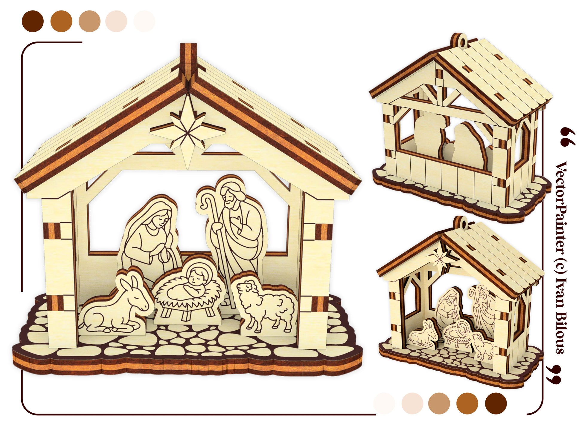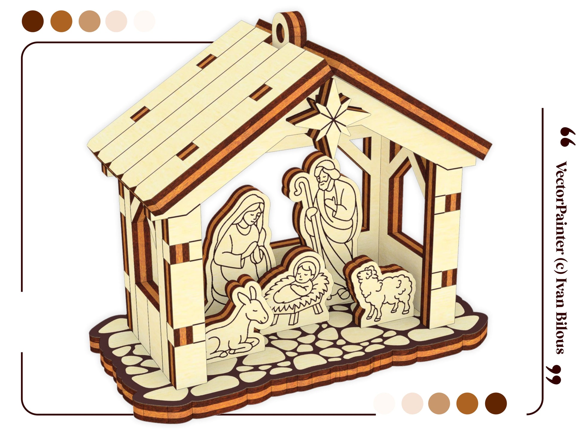 Nativity Scene laser cut file – 3D ornament SVG design to create a heartwarming Christmas decoration featuring Baby Jesus, Mary, Joseph, and the barn. This detailed digital pattern brings the spirit of the season into your home. Ideal for plywood or MDF, it's perfect for Glowforge and other laser cutting machines.
