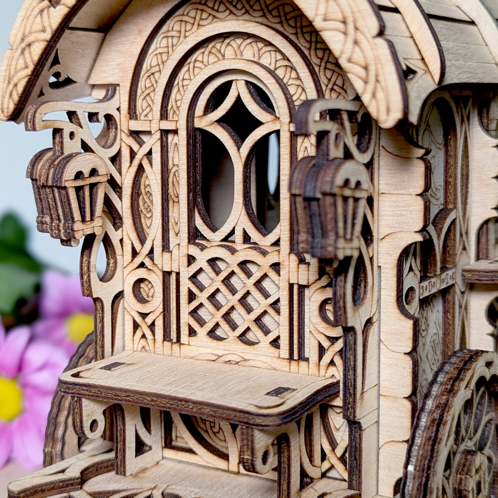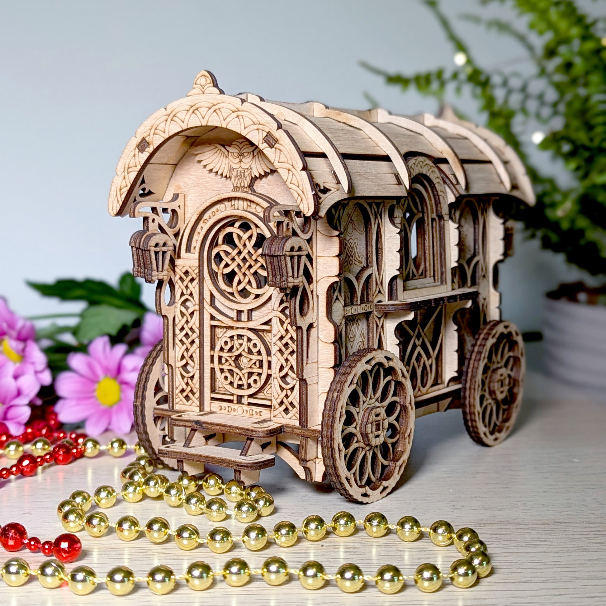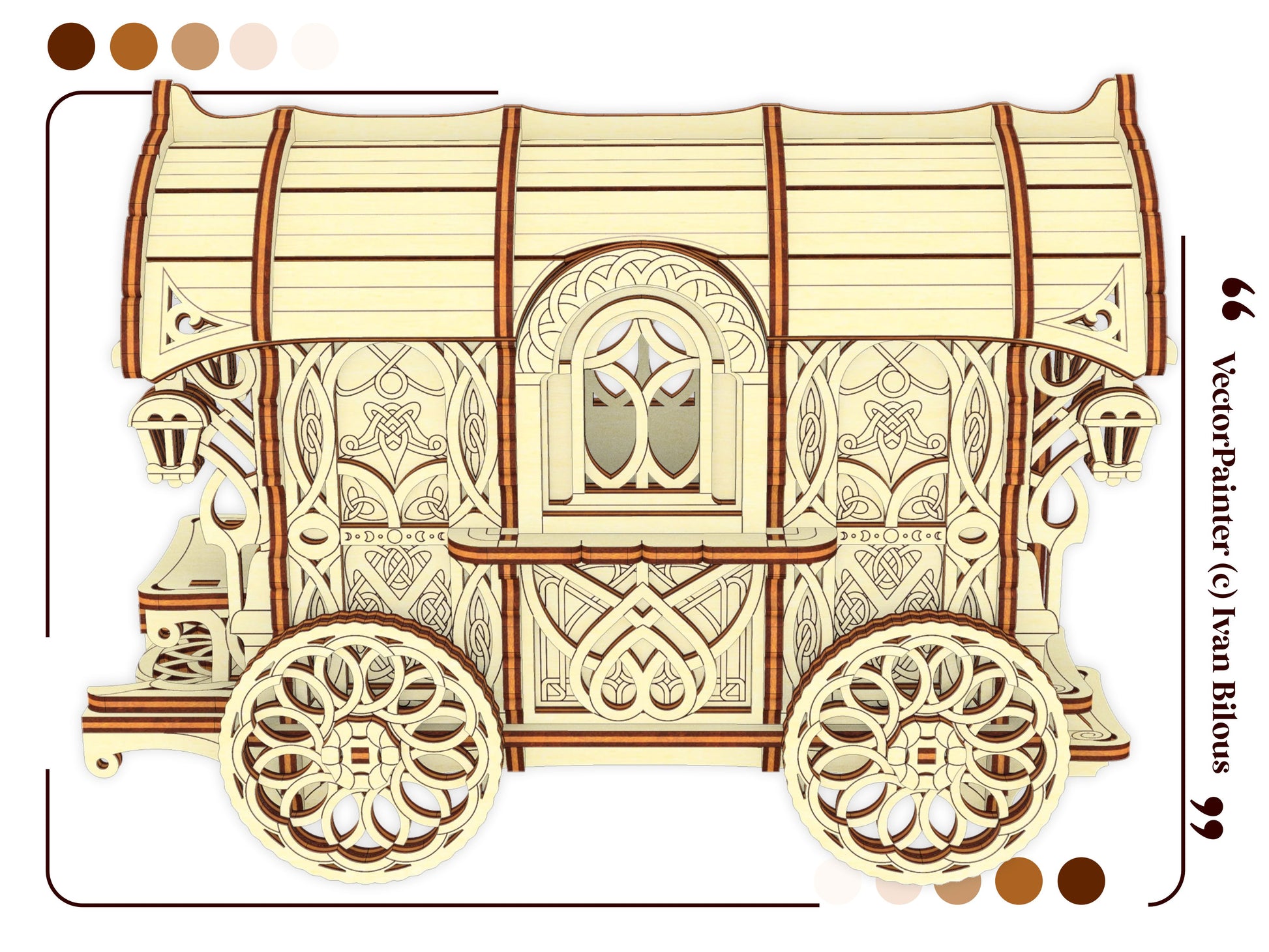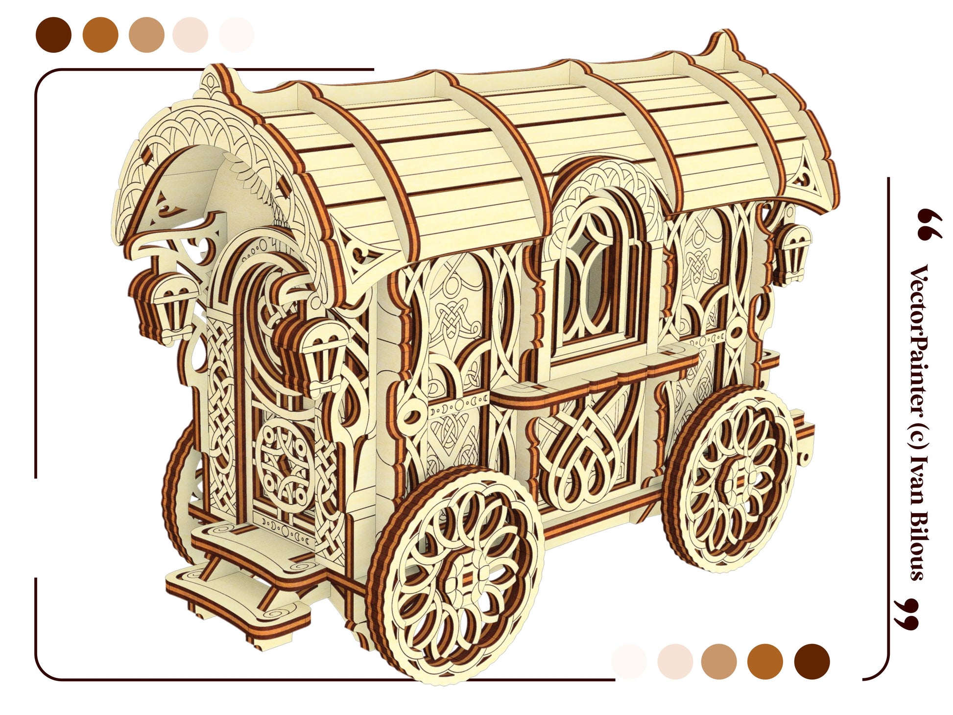 The laser cut design of the Nomad Caravan Wagon is a stunning representation of fantasy artistry. This intricate design features precise patterns and motifs that highlight the craftsmanship and attention to detail, as well as the moving wheels.