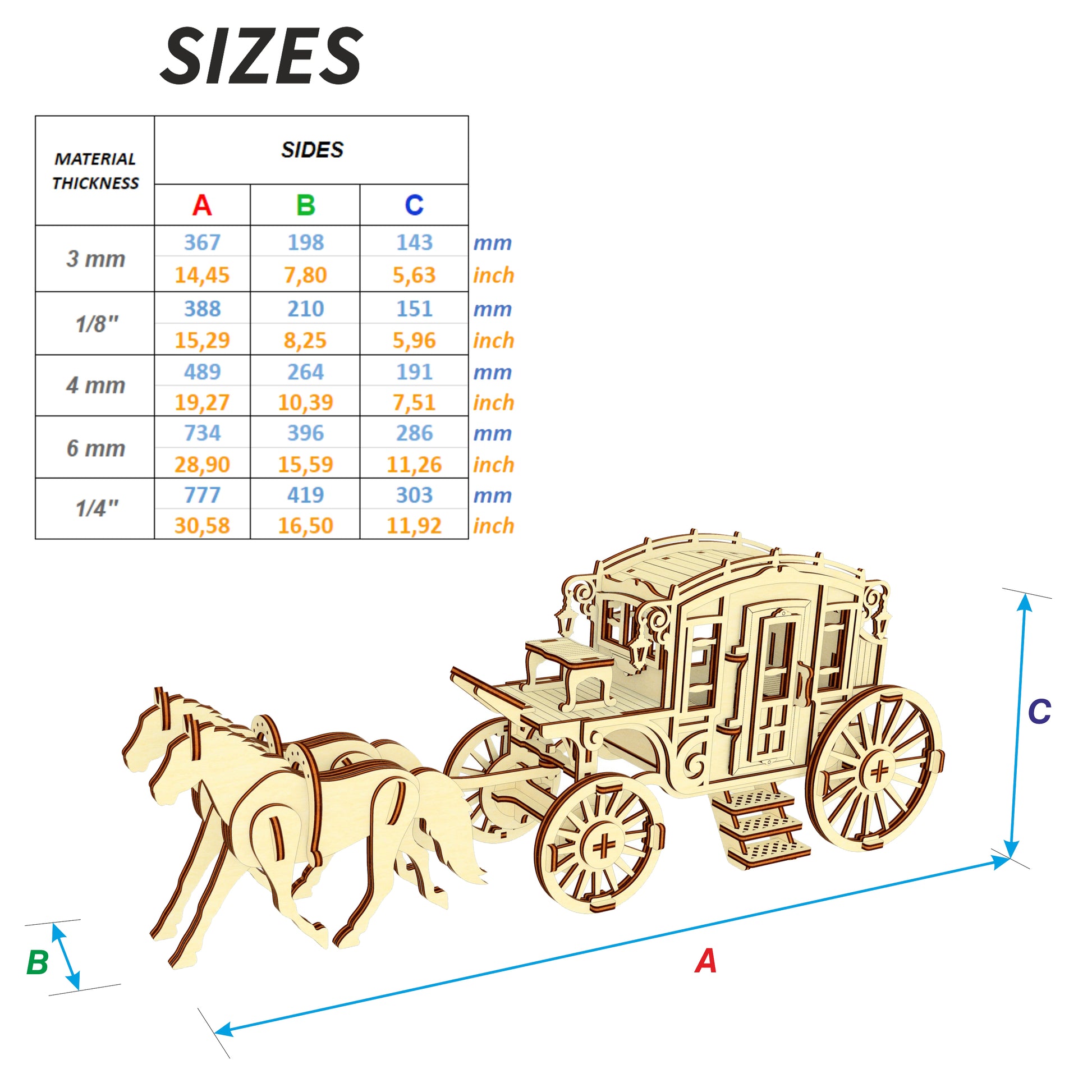 In addition to the detailed design, the product includes files in multiple formats (SVG, DXF, CDR, AI) that can be used with laser cutting software or other design tools. These files ensure that users have the necessary tools to bring their vintage carriage to life.
