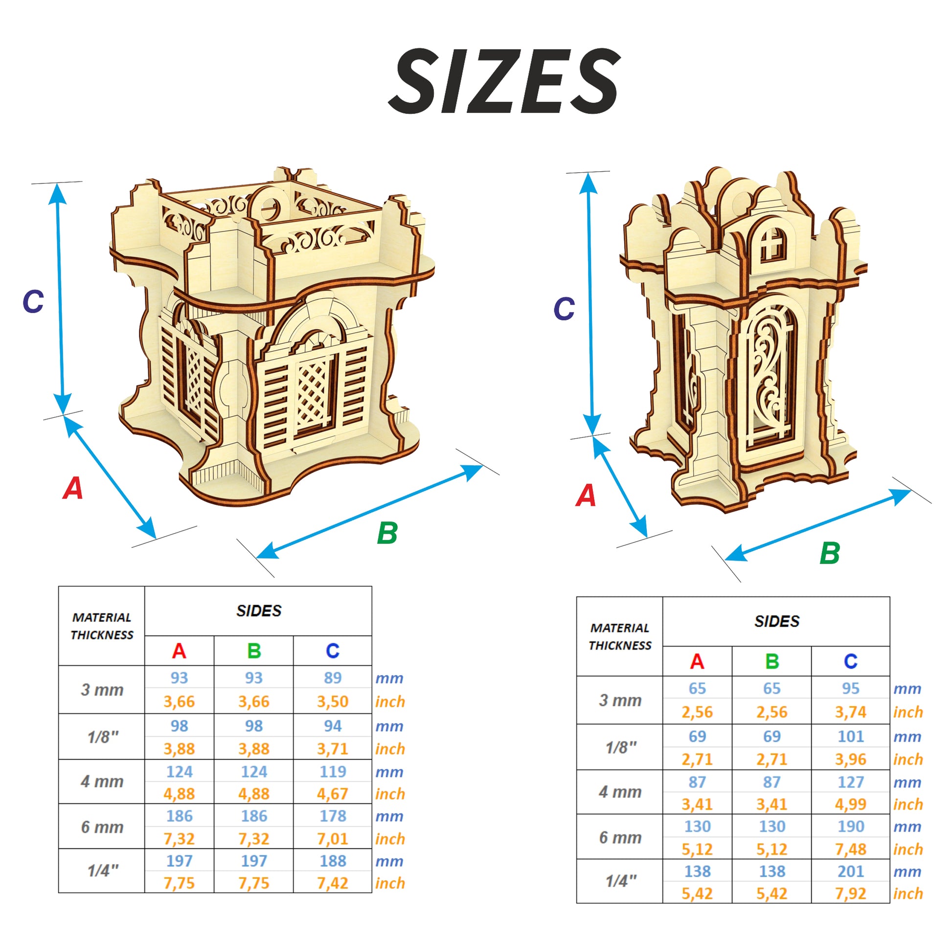 🤏Material thickness (versions of the files): 3mm, 1/8''(3.175mm), 4mm, 6mm, 1/4''(6.35mm)