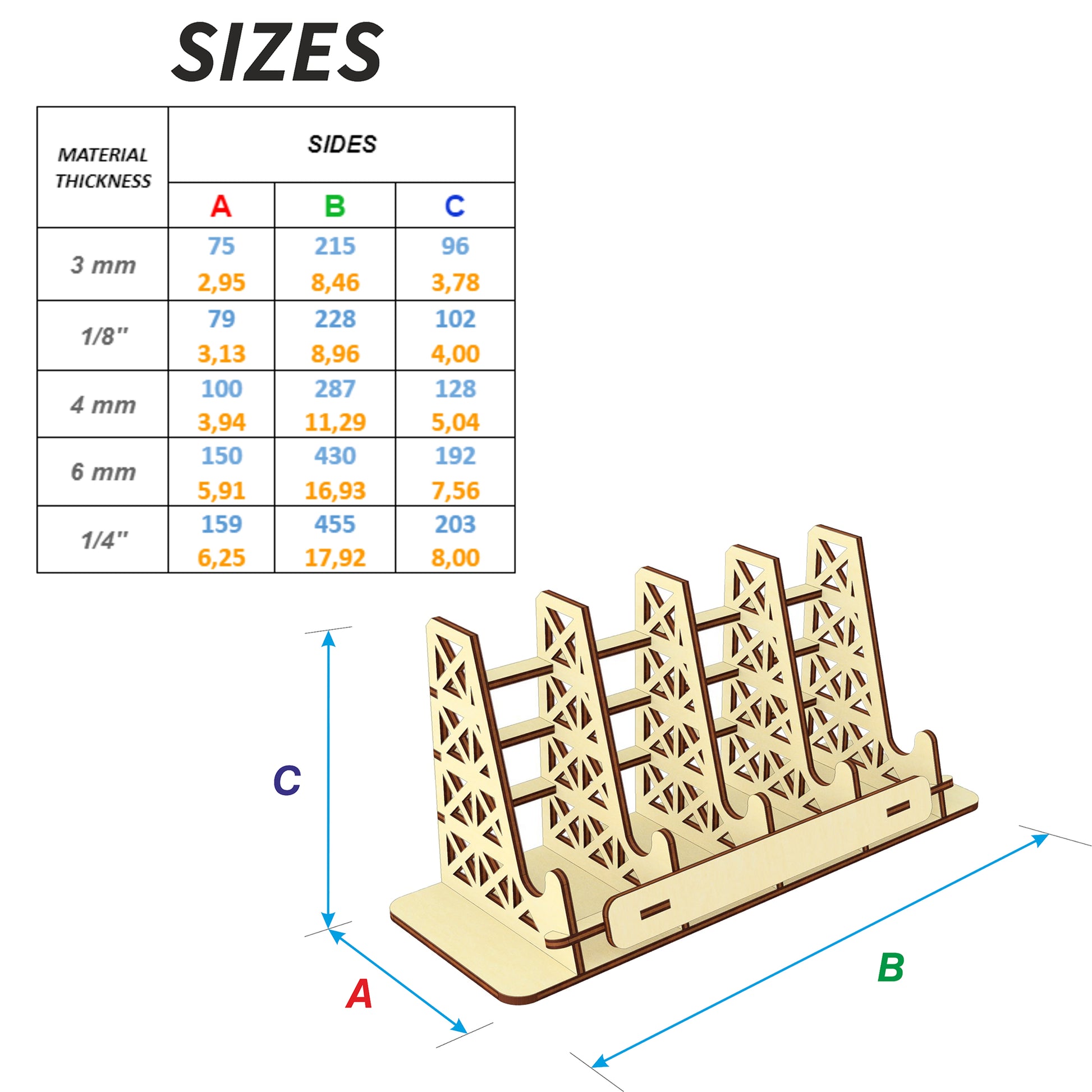 🤏Material thickness (versions of the files): 3mm, 1/8''(3.175mm), 4mm, 6mm, 1/4''(6.35mm)