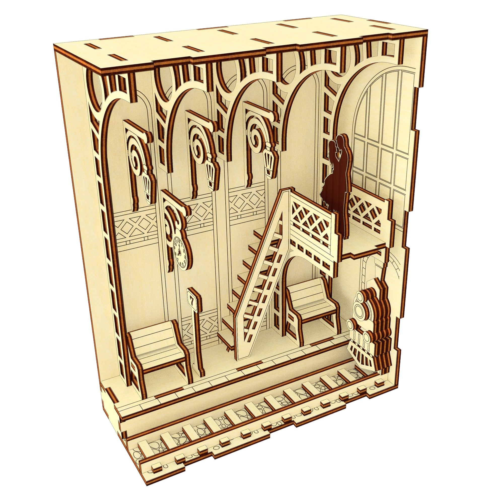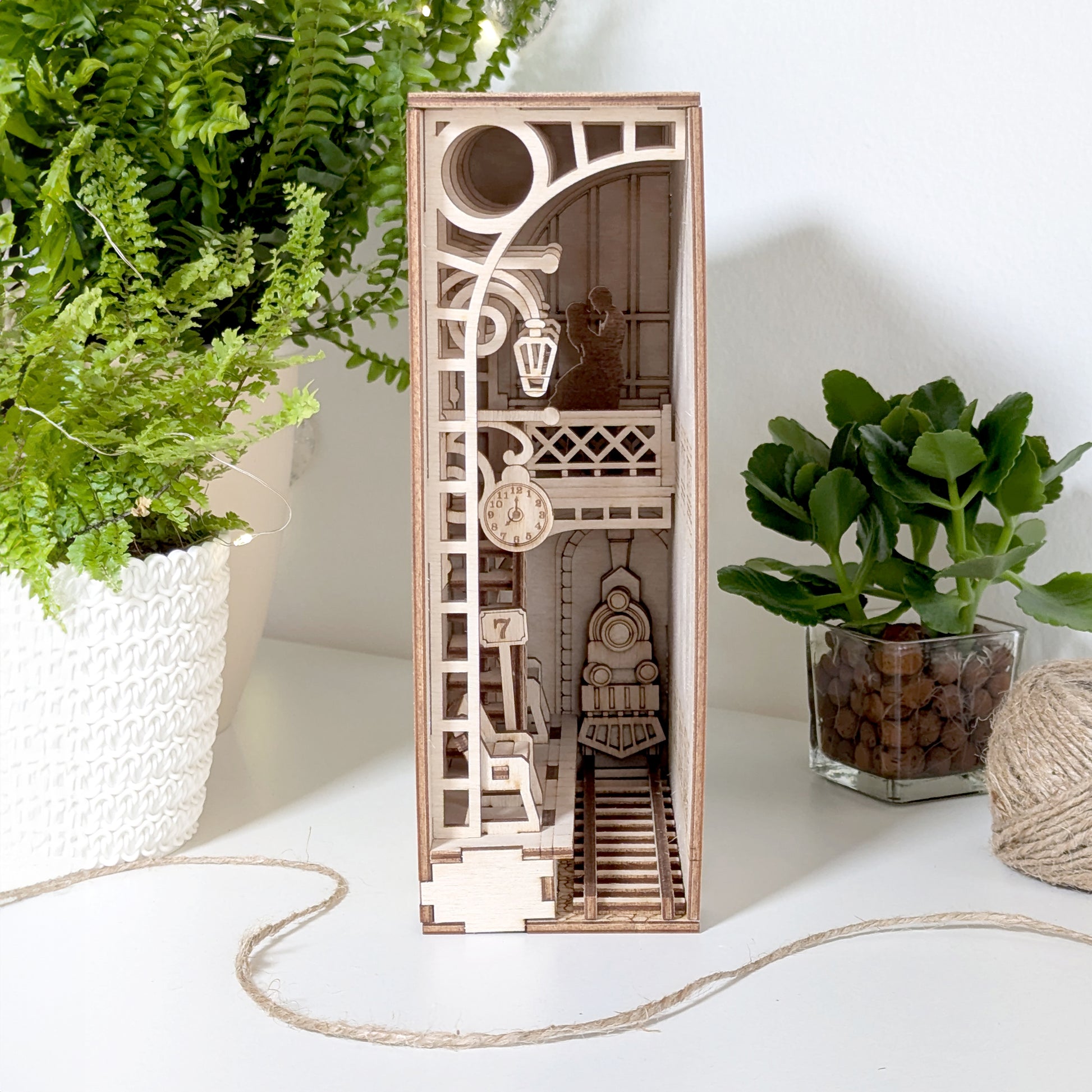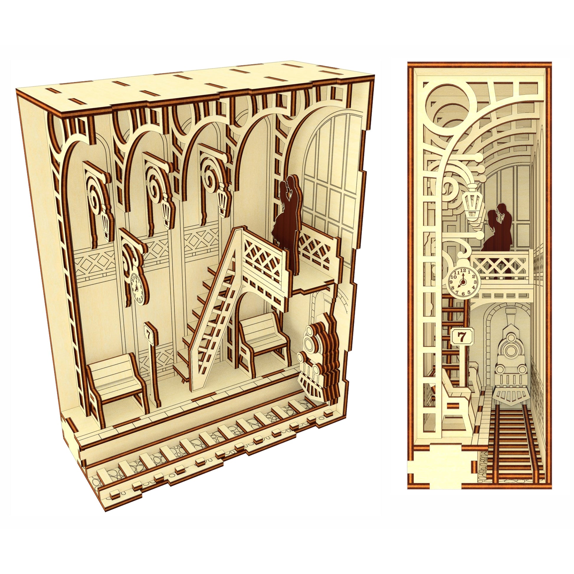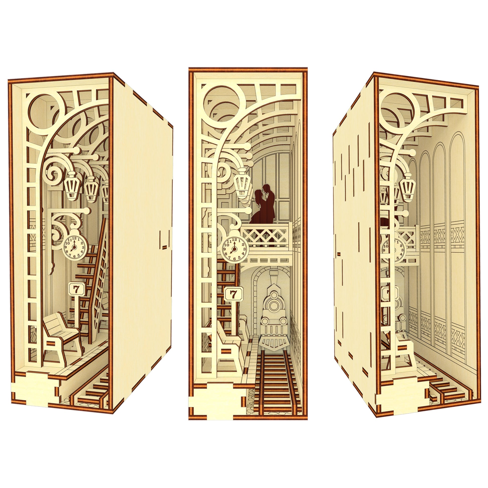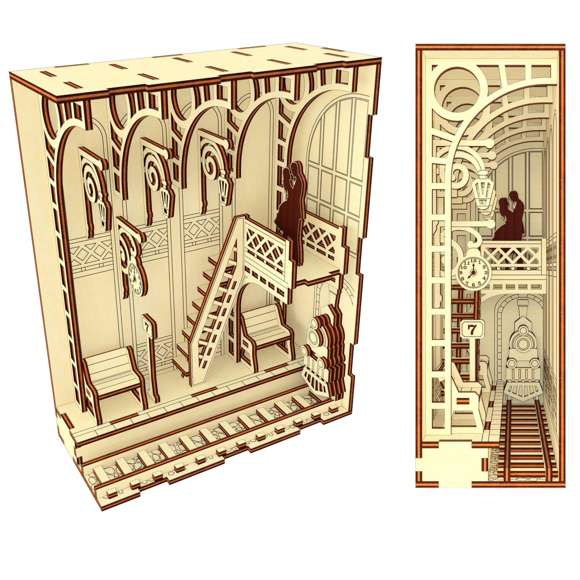 Create a captivating miniature world with our Laser Cut Files for a Book Nook featuring a railway station scene. This intricate design includes a detailed platform, a train, and a romantic couple, capturing a moment of love and travel. Perfect for adding charm and storytelling to your bookshelf, this unique book nook will bring a touch of nostalgia and wonder to your décor. Ideal for book lovers and crafters alike!