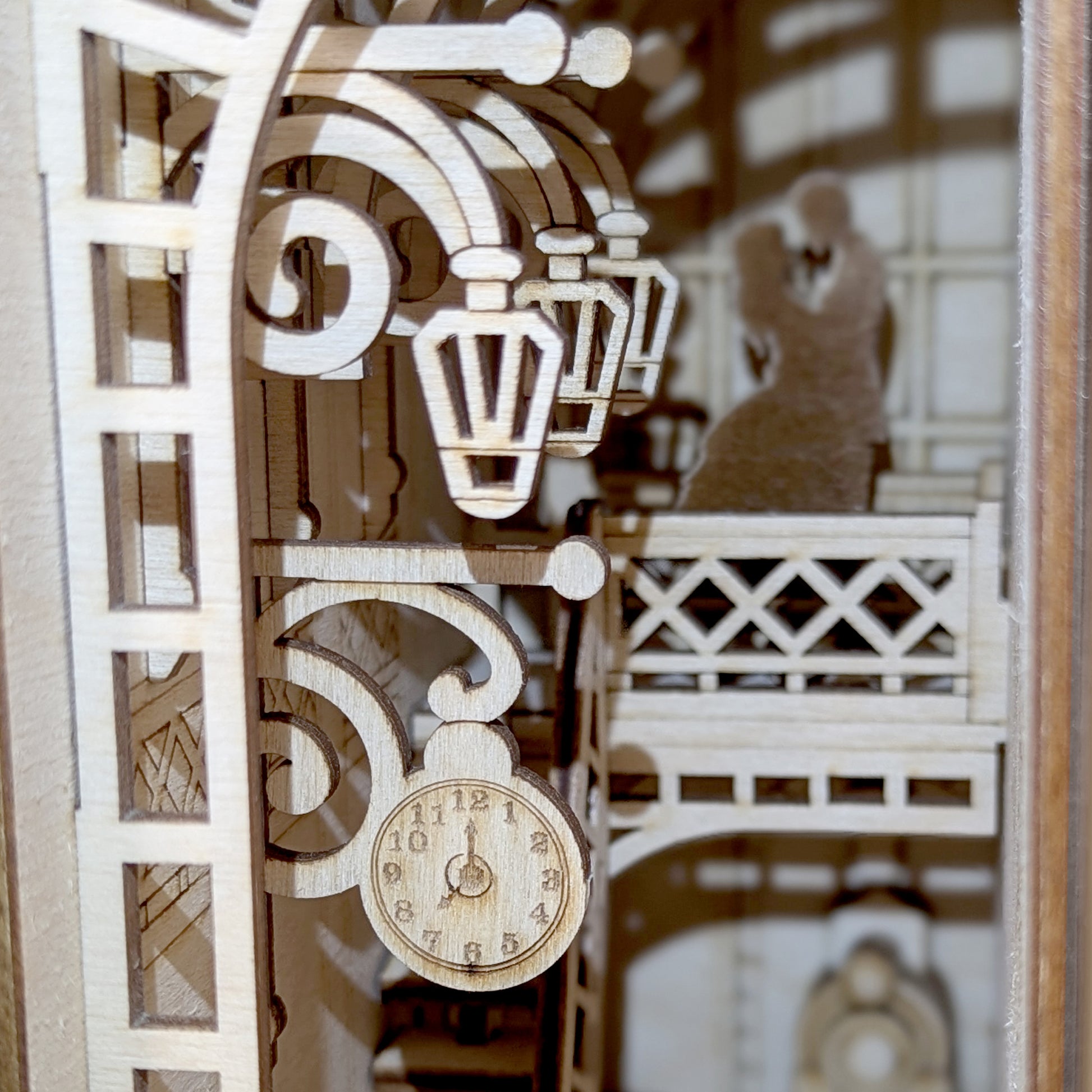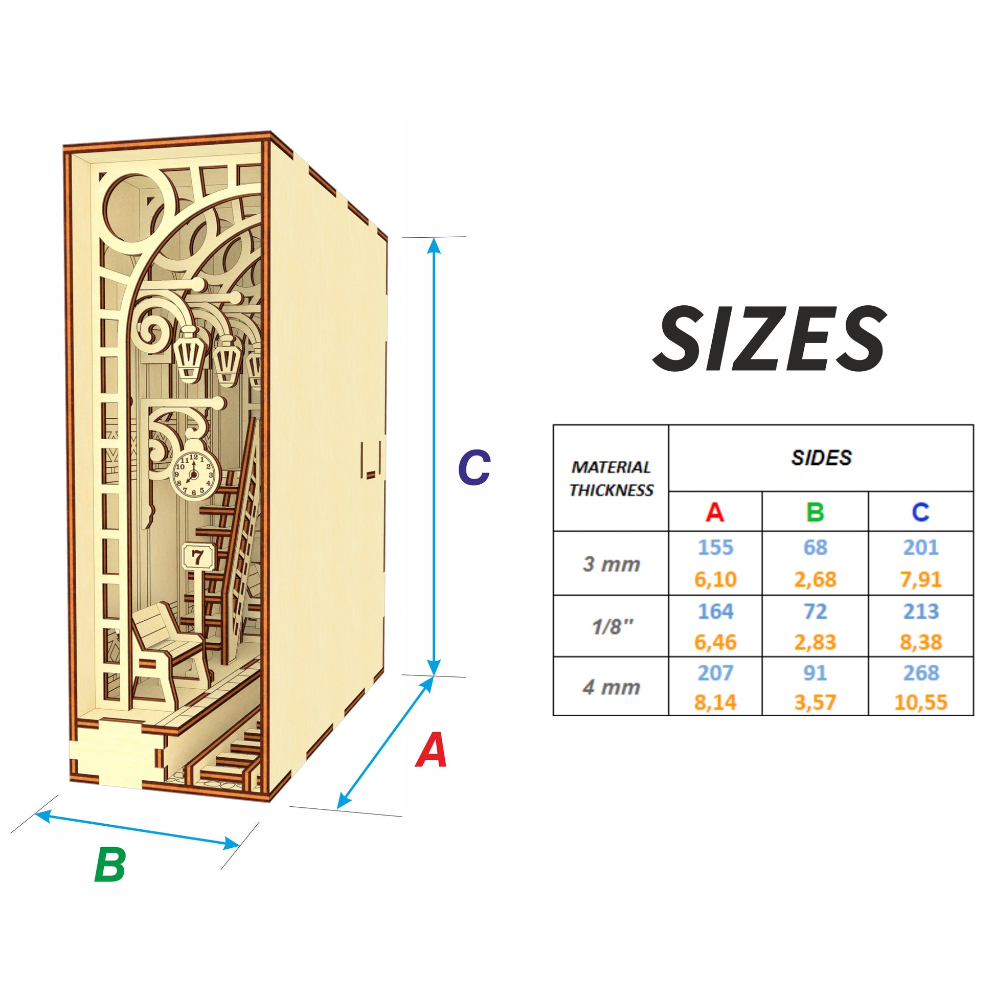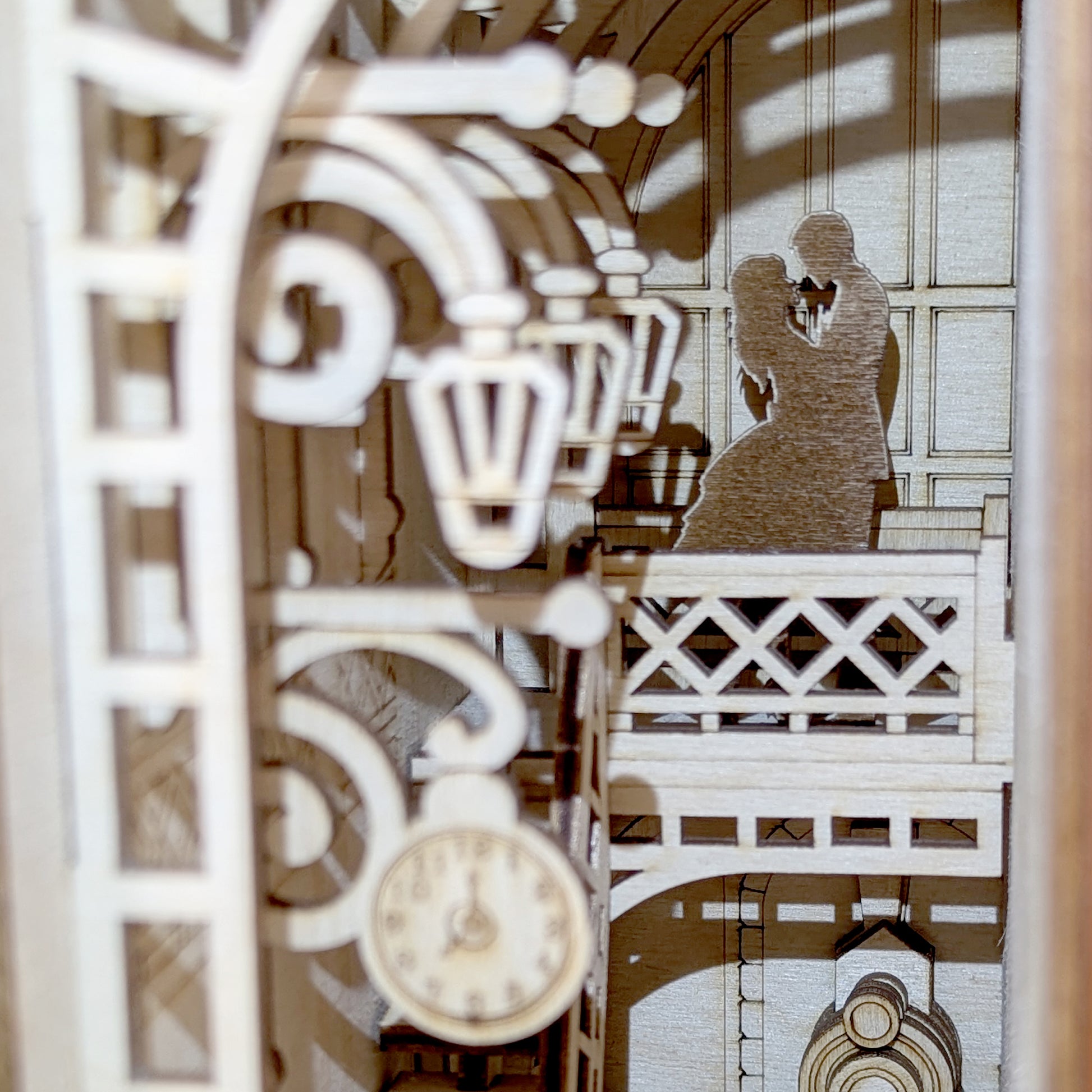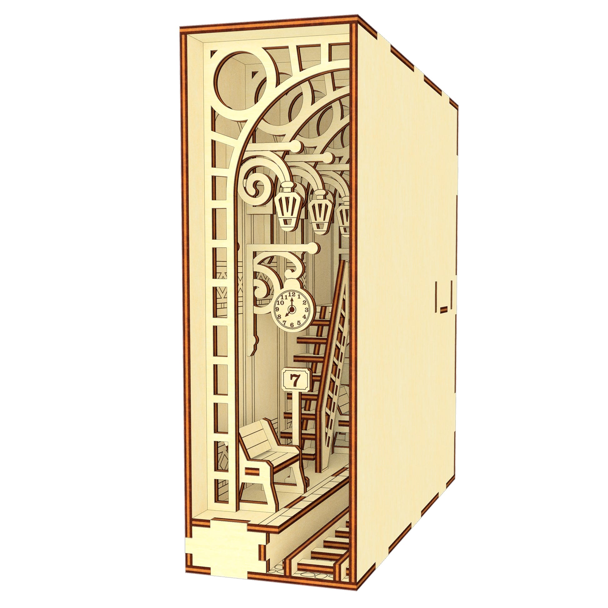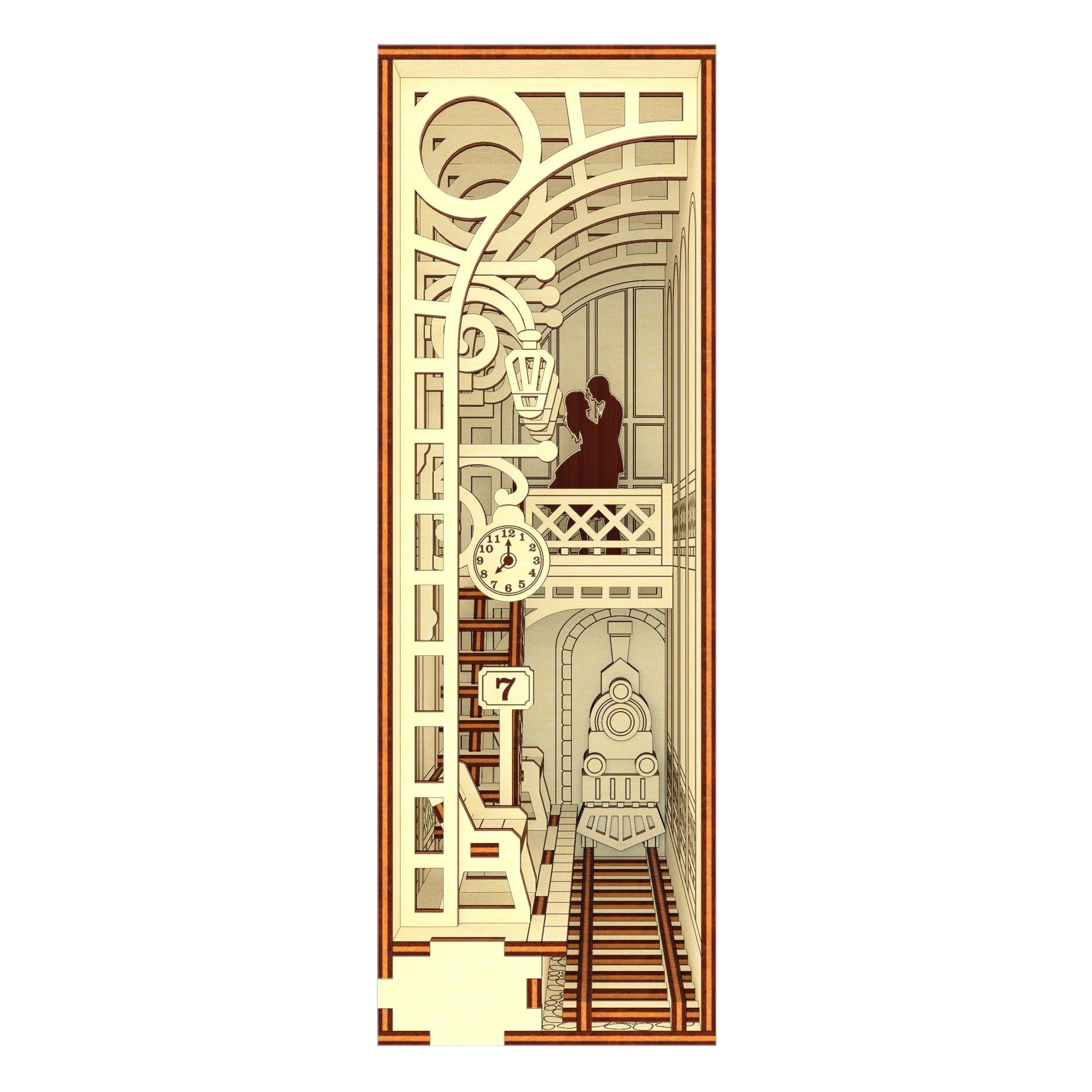 Create a captivating miniature world with our Laser Cut Files for a Book Nook featuring a railway station scene. This intricate design includes a detailed platform, a train, and a romantic couple, capturing a moment of love and travel. Perfect for adding charm and storytelling to your bookshelf, this unique book nook will bring a touch of nostalgia and wonder to your décor. Ideal for book lovers and crafters alike!