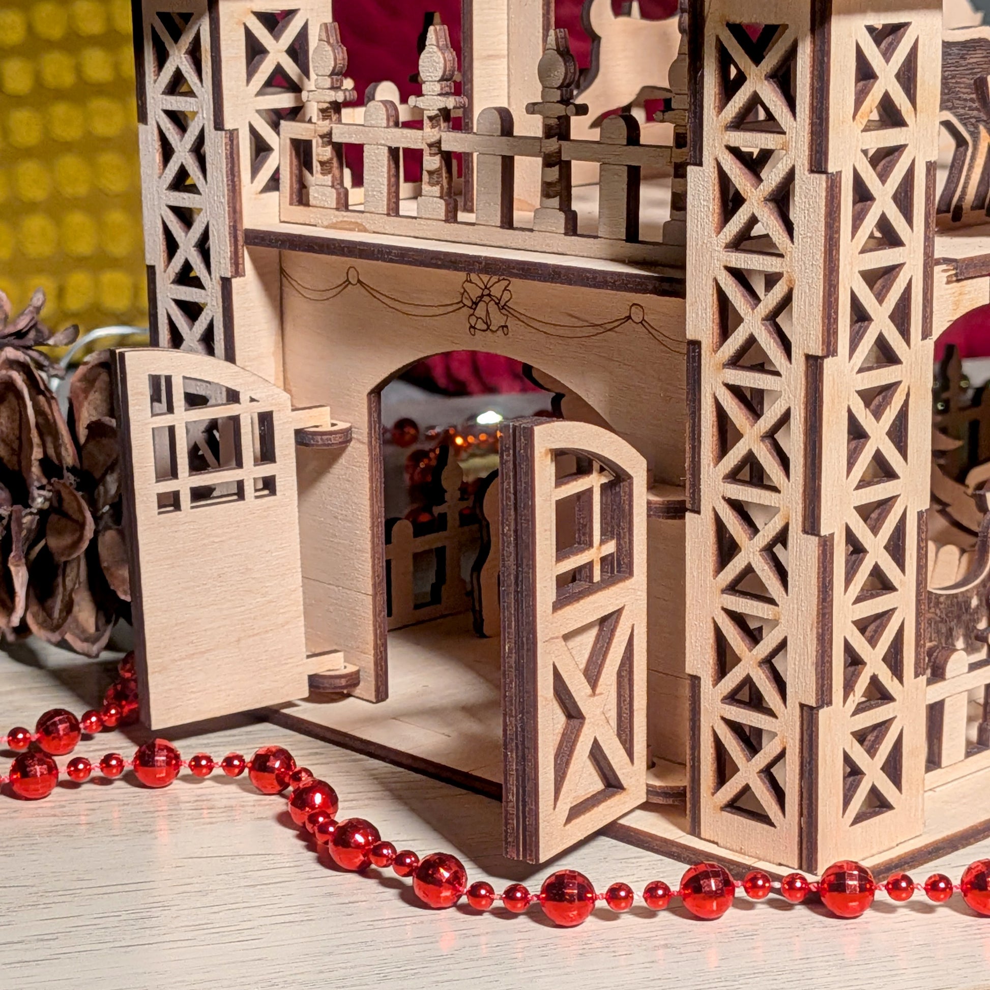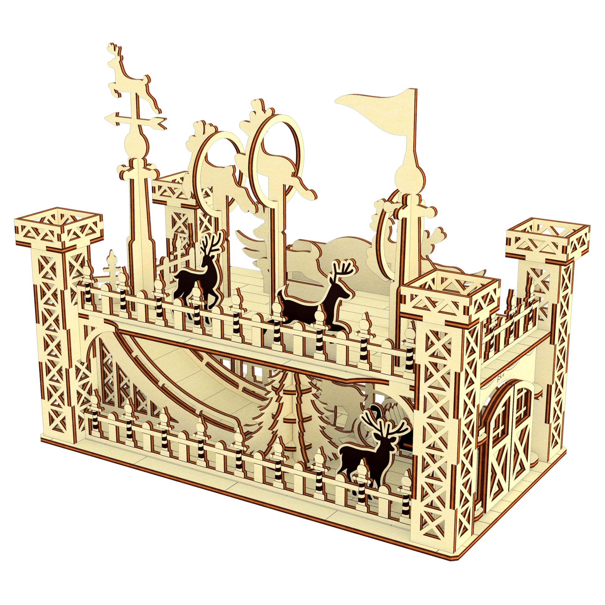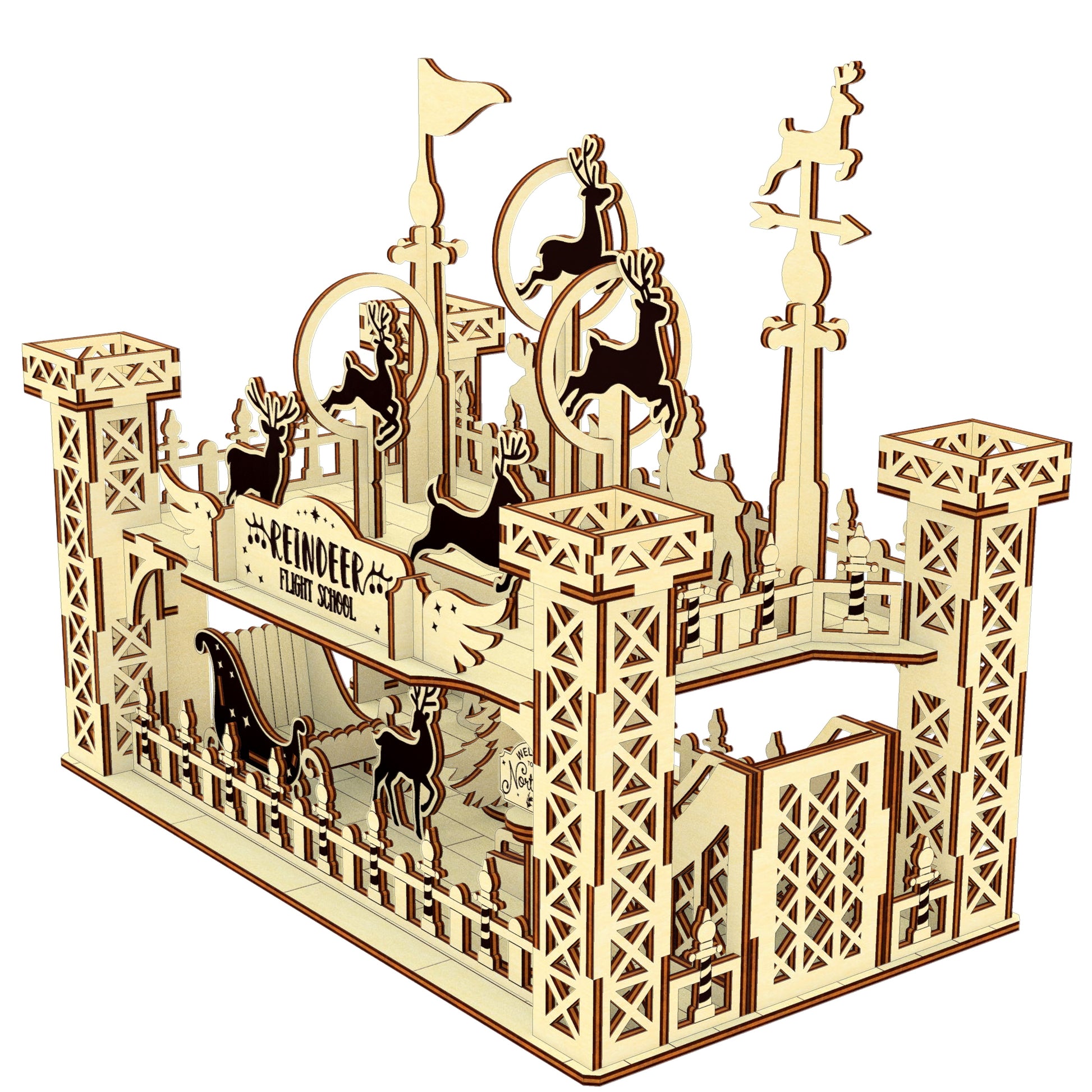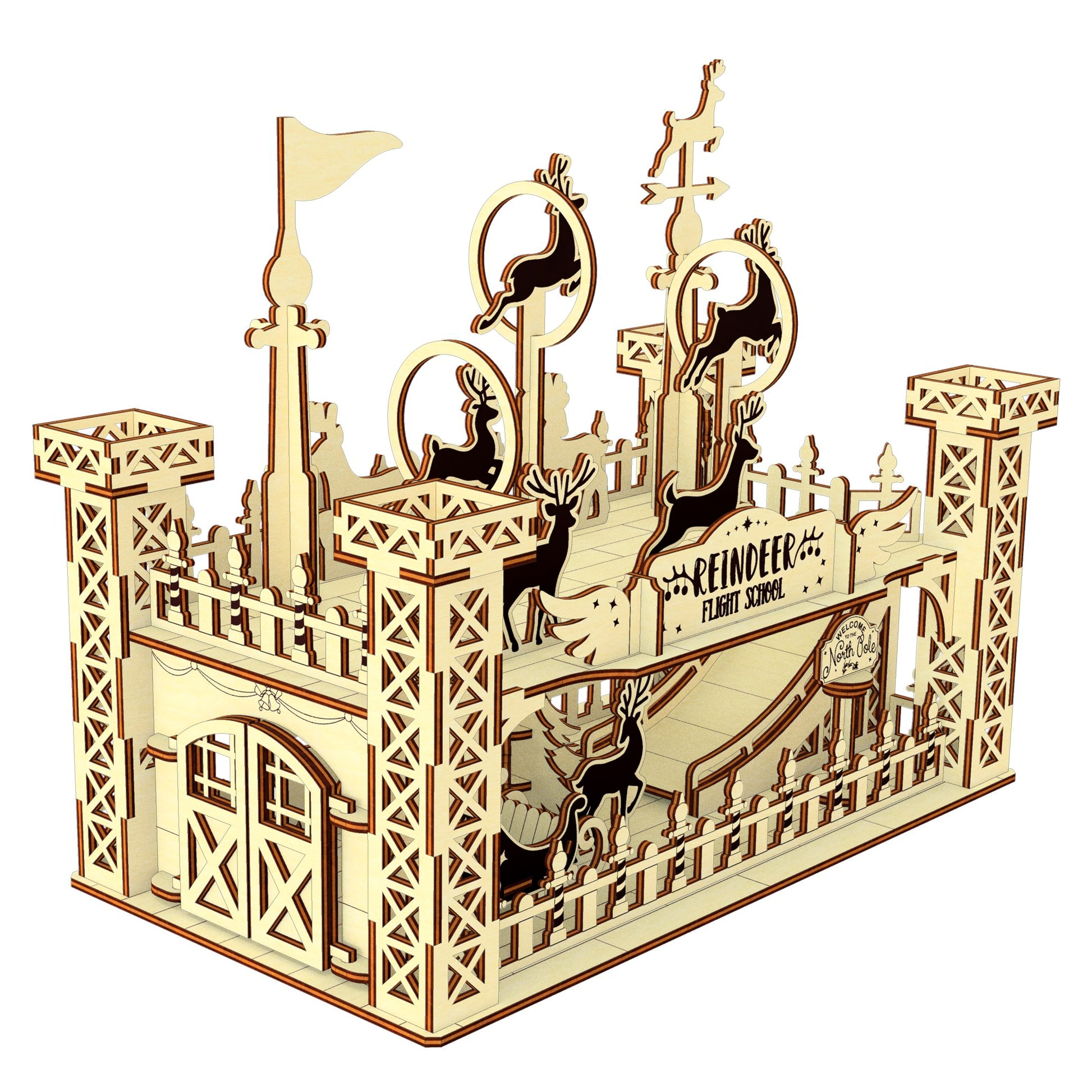 This is a miniature of the Reindeer flight school. This is where they exercise and learn to fly. You can see reindeer, practice rings, Santa Claus' sleigh, a trampoline, a Christmas tree, and a weathervane here. The design includes detailed assembly instructions. I'm sure you'll have a great time putting this design together.