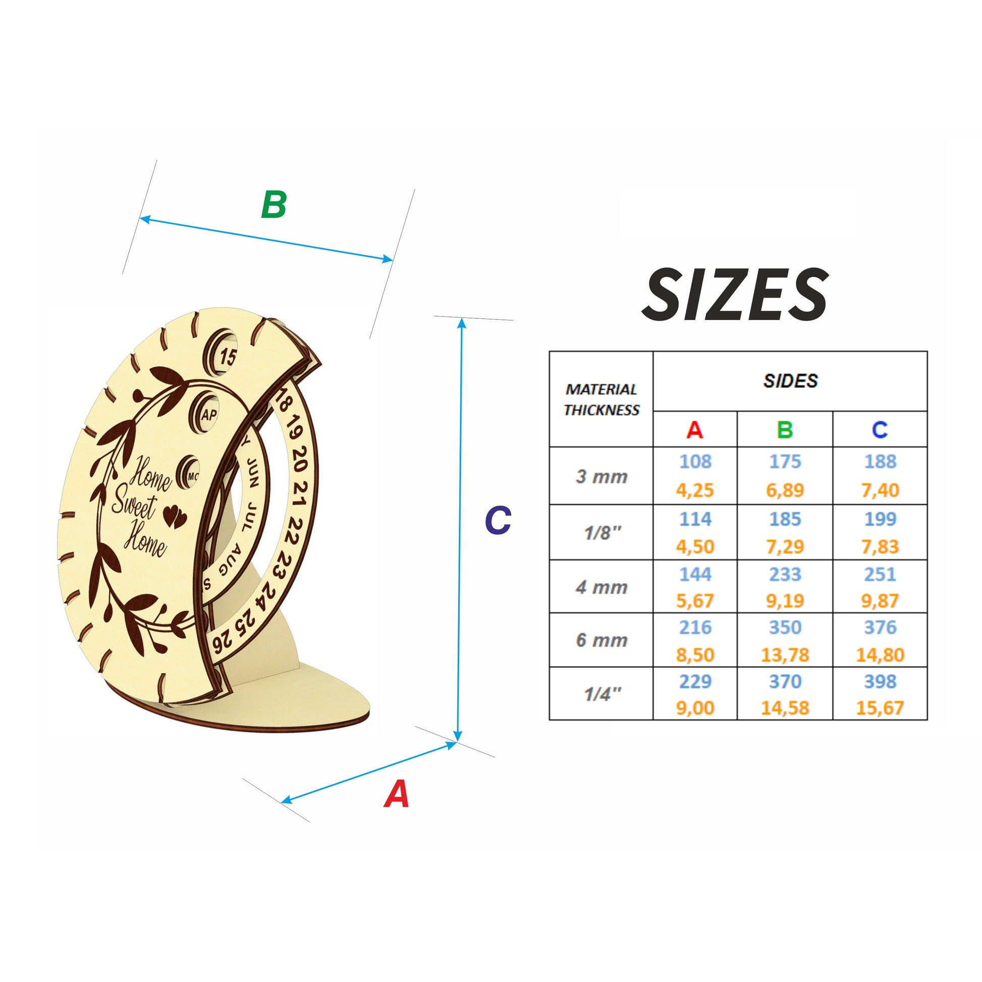 🤏Material thickness (versions of the files): 3mm, 1/8''(3.175mm), 4mm, 6mm, 1/4''(6.35mm)