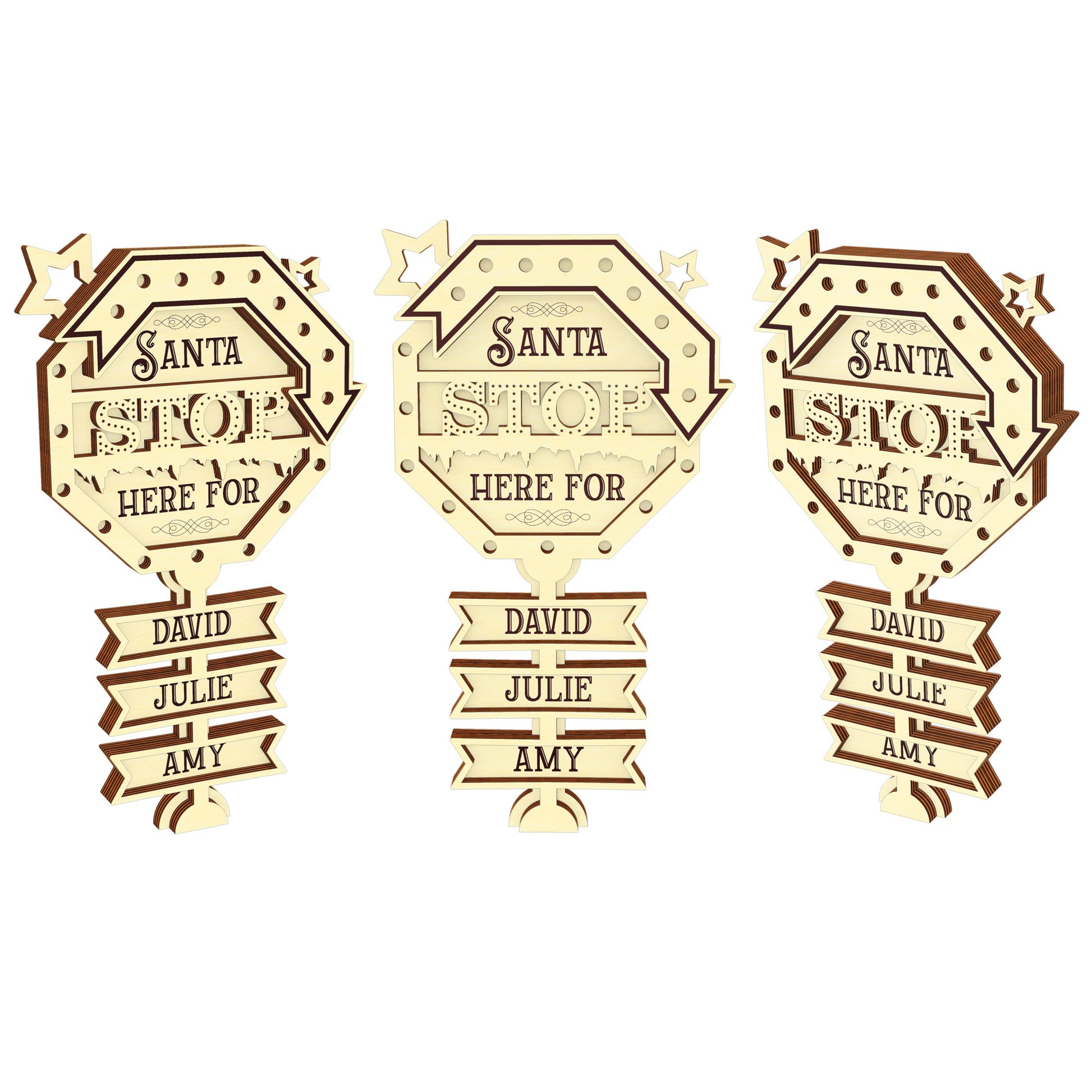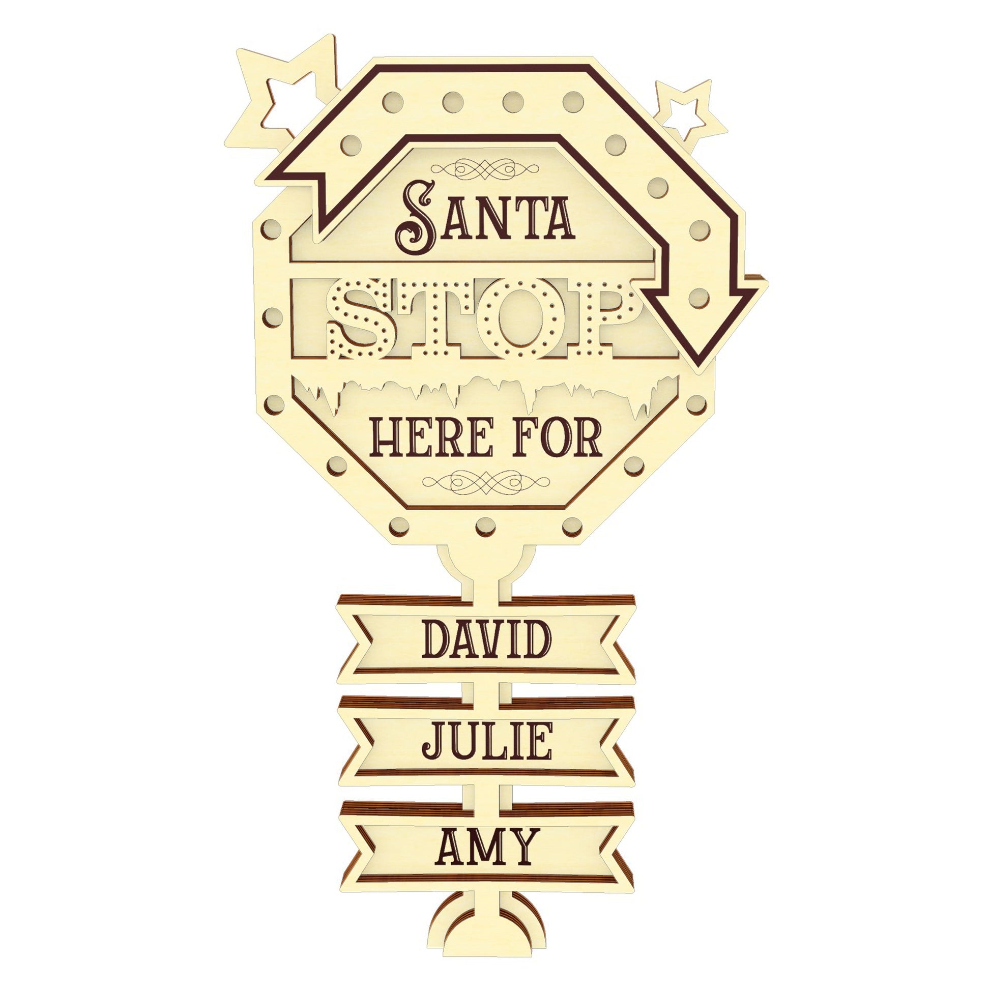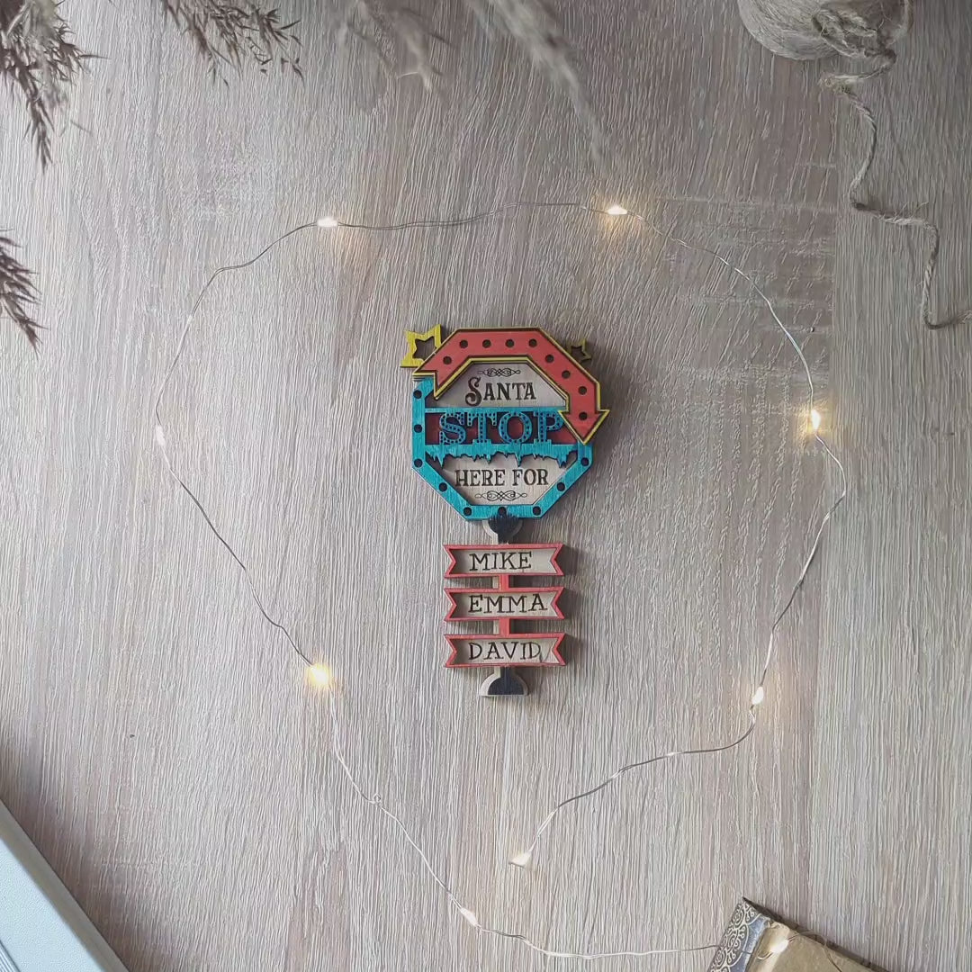 This is a Christmas ornament in the form of a Stop sign with the inscription "Santa Stop here for ...". You will be able to add your own names. The design includes versions for 1-9 names.