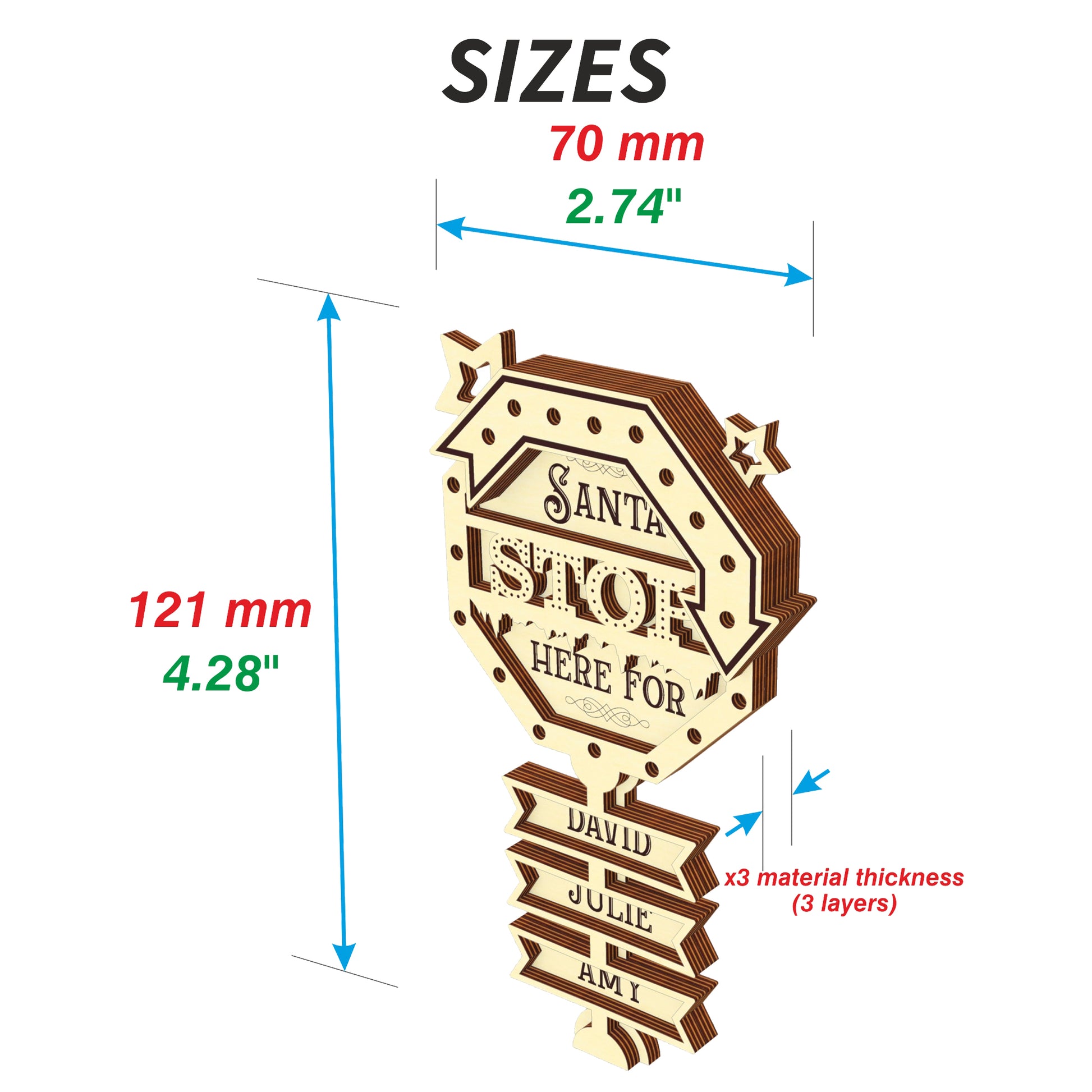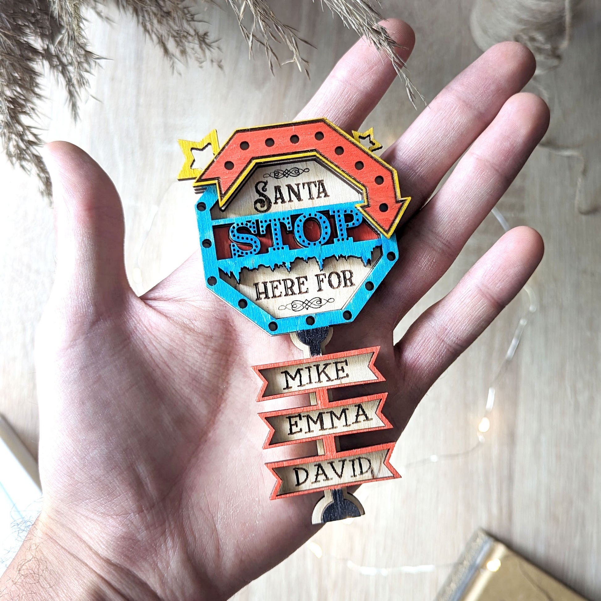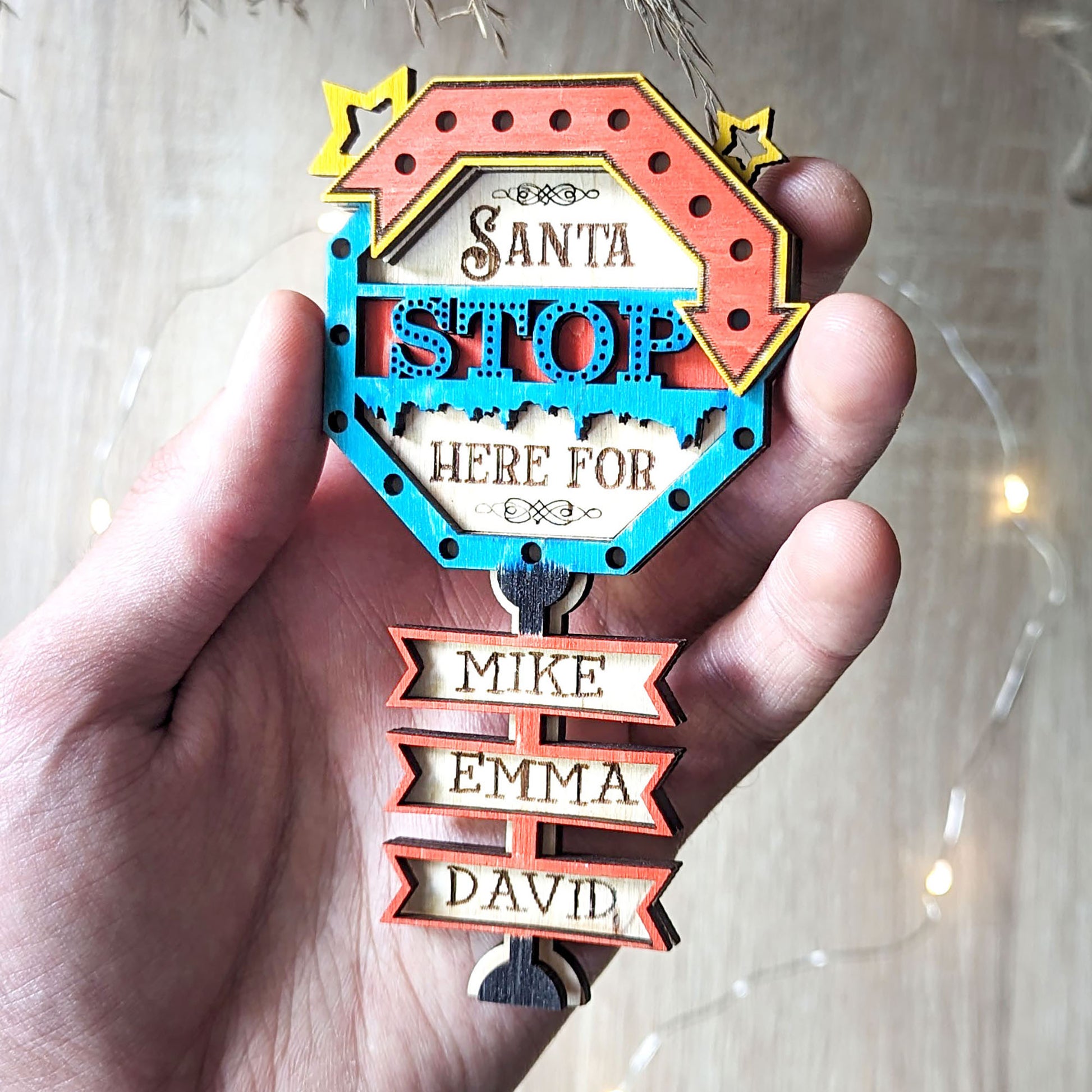 This is a Christmas ornament in the form of a Stop sign with the inscription "Santa Stop here for ...". You will be able to add your own names. The design includes versions for 1-9 names.