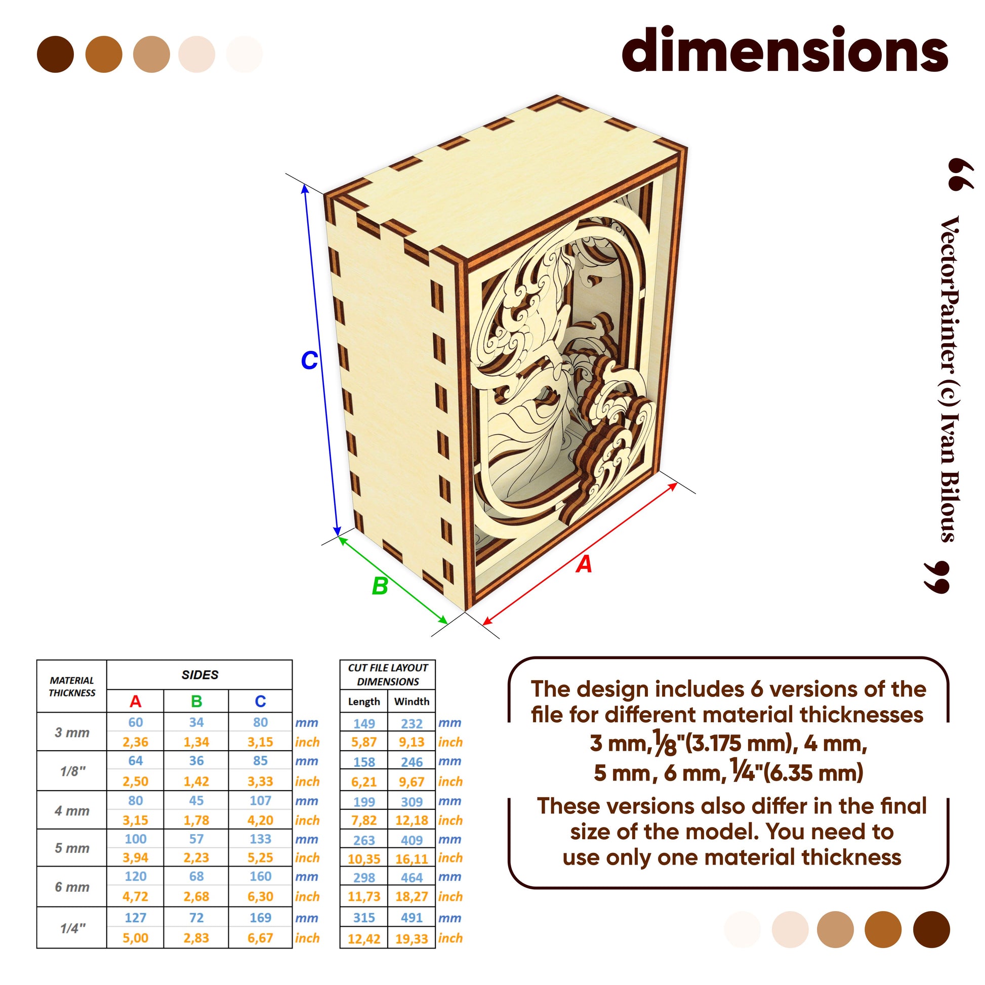🤏Material thickness (versions of the files): 3 mm, 1/8'' (3.175 mm), 4 mm, 5 mm, 6 mm, 1/4'' (6.35 mm)