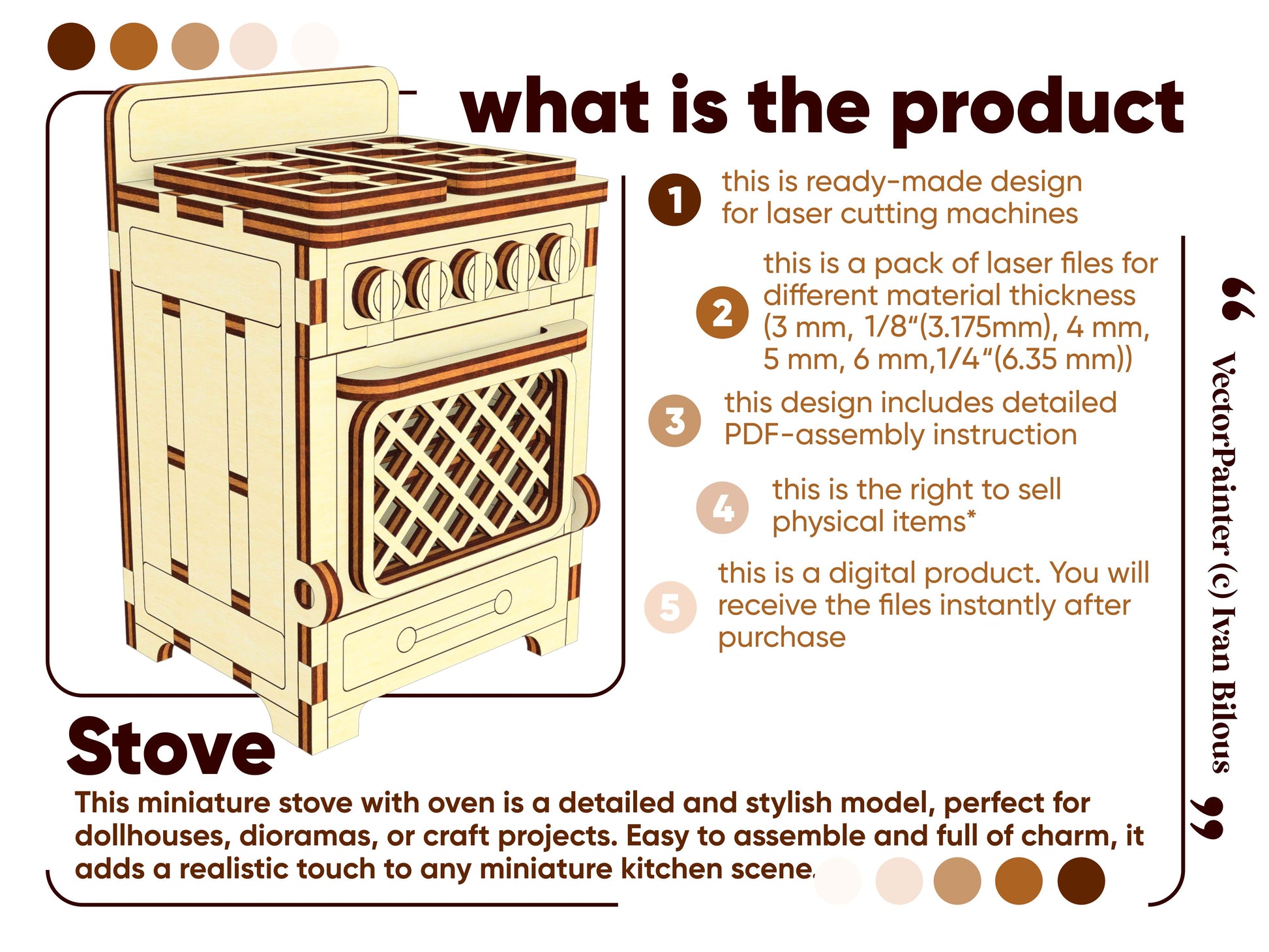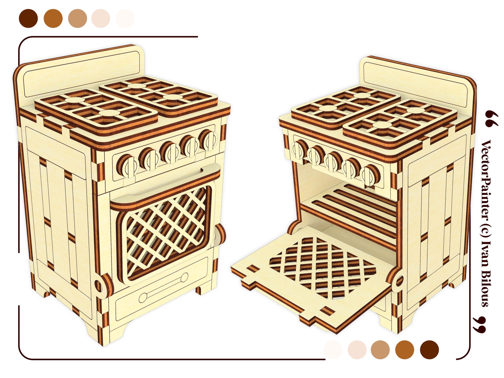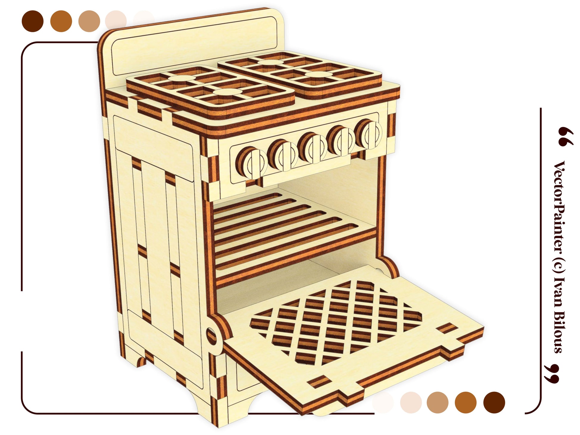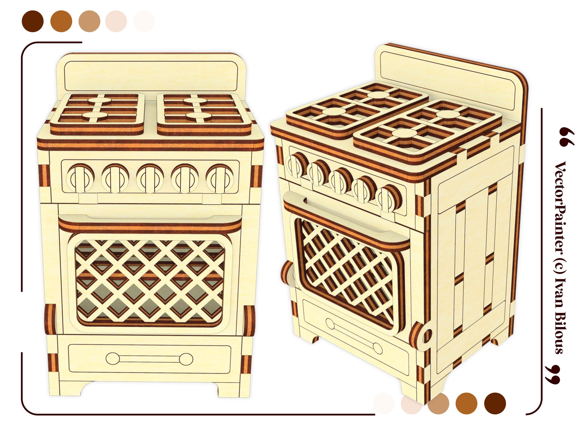 Stove Miniature Laser Cut File – Vector Design for crafting a charming vintage-style stove from plywood. This miniature laser project features detailed burners, an opening oven door, and classic elements, perfect for dollhouses, decorative scenes, or creative DIY enthusiasts.