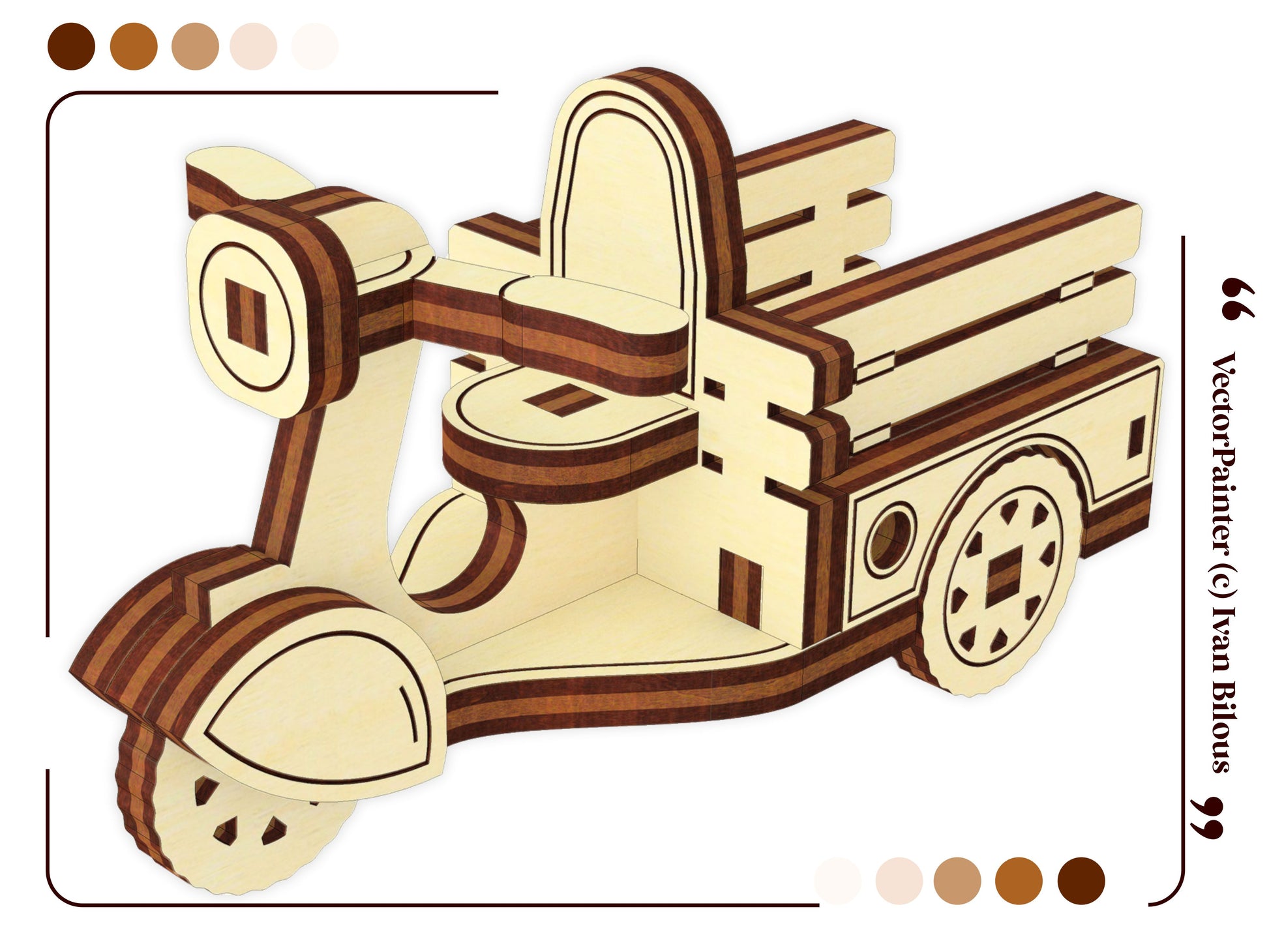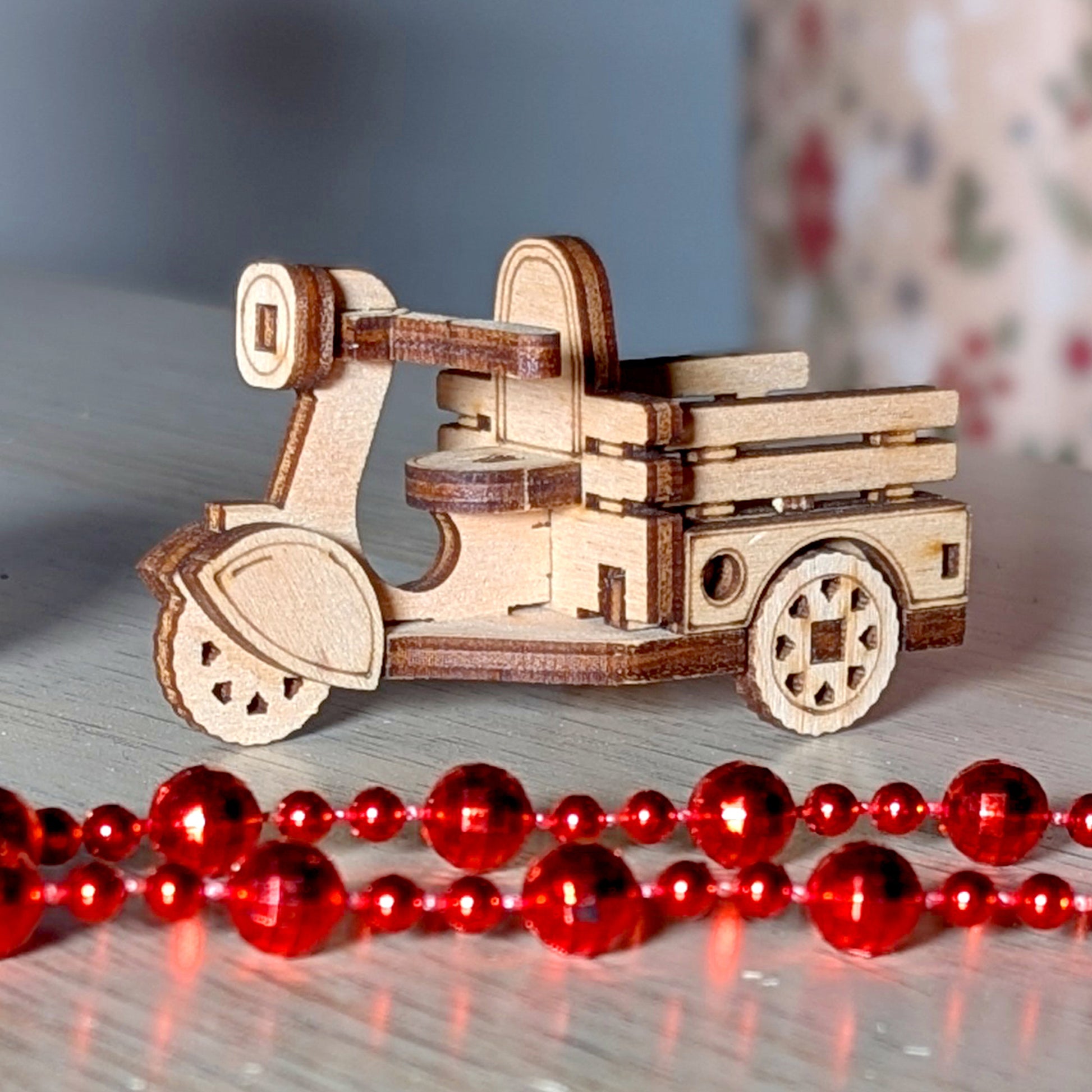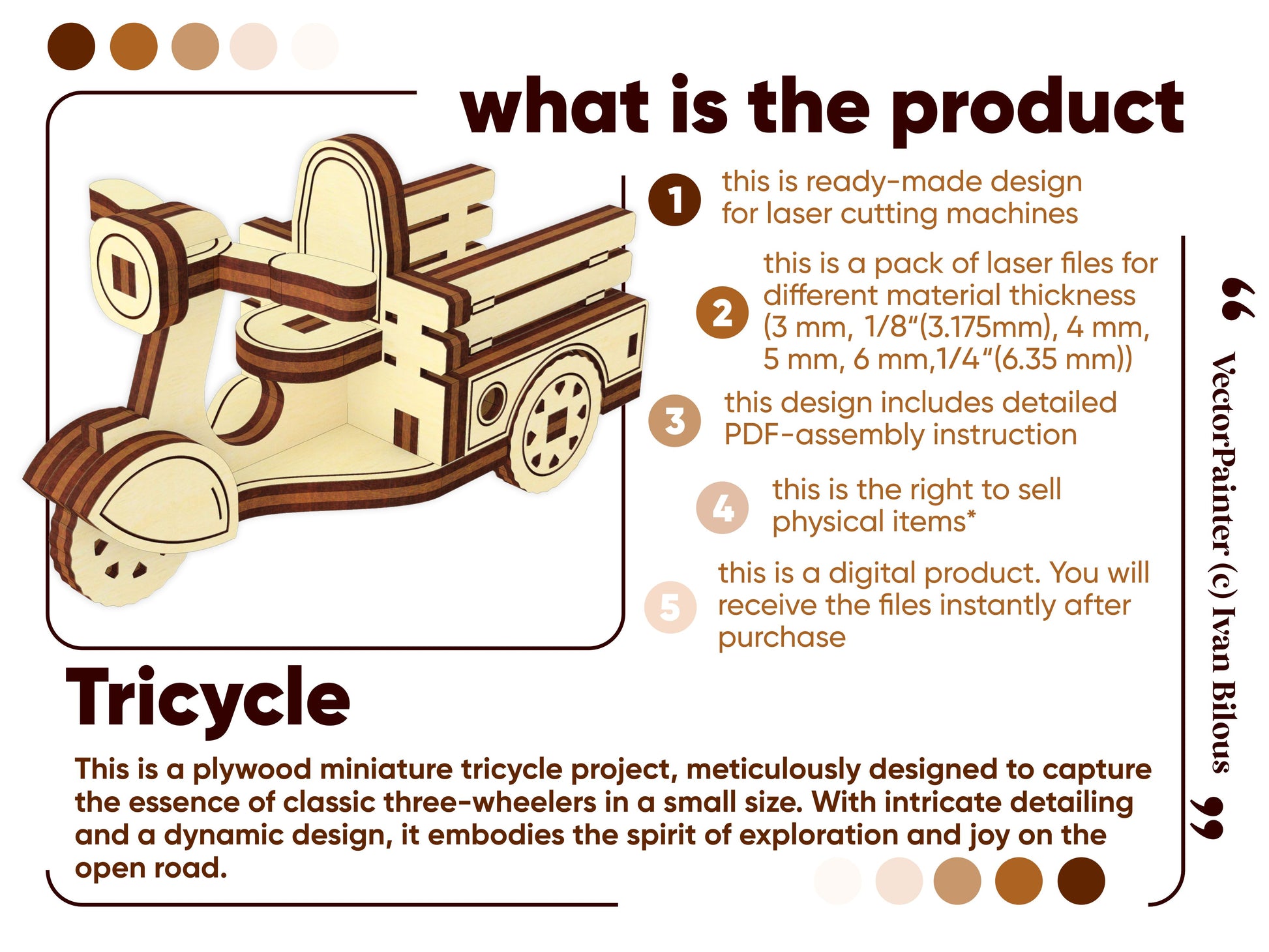 Laser cut file for a 3D tricycle model—perfect for retro decor & DIY projects. Works with Glowforge, xTool & CNC. Includes SVG, DXF formats.