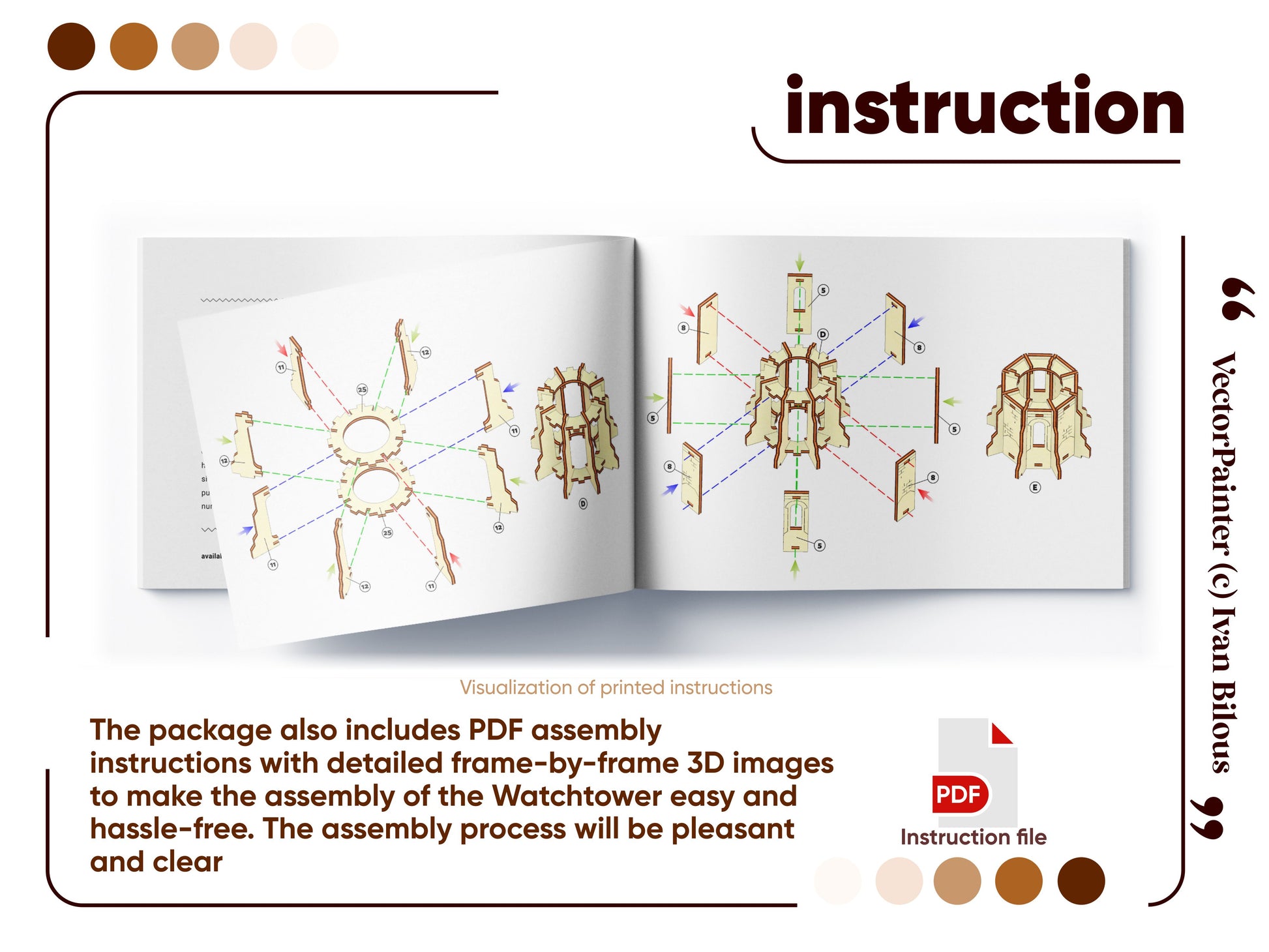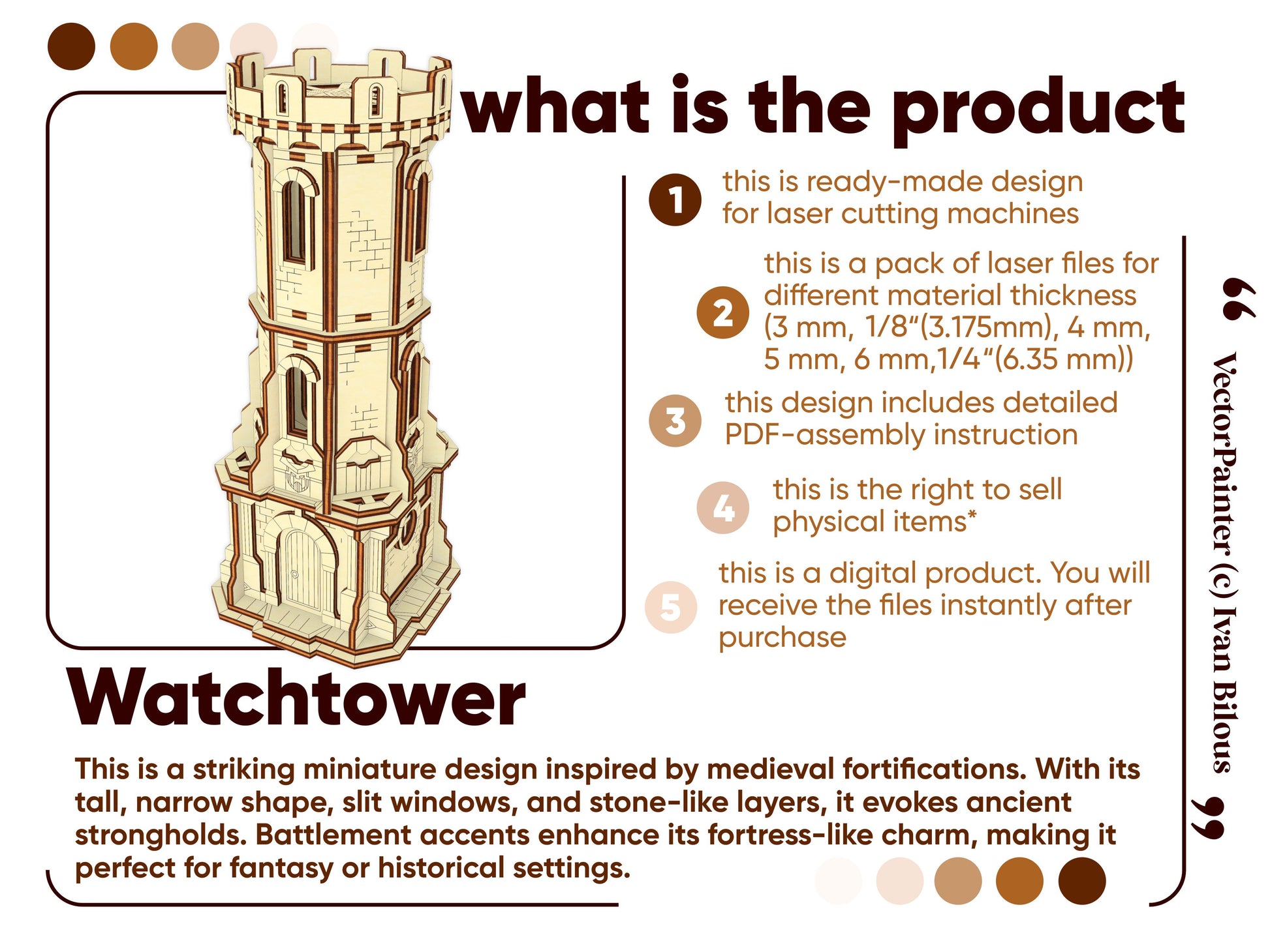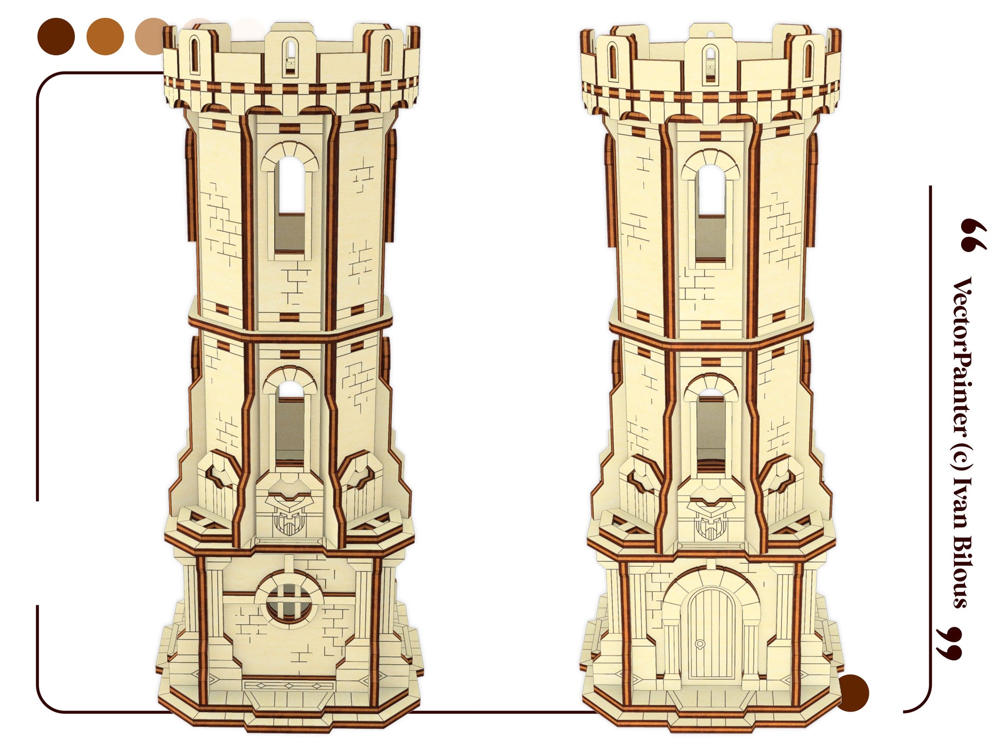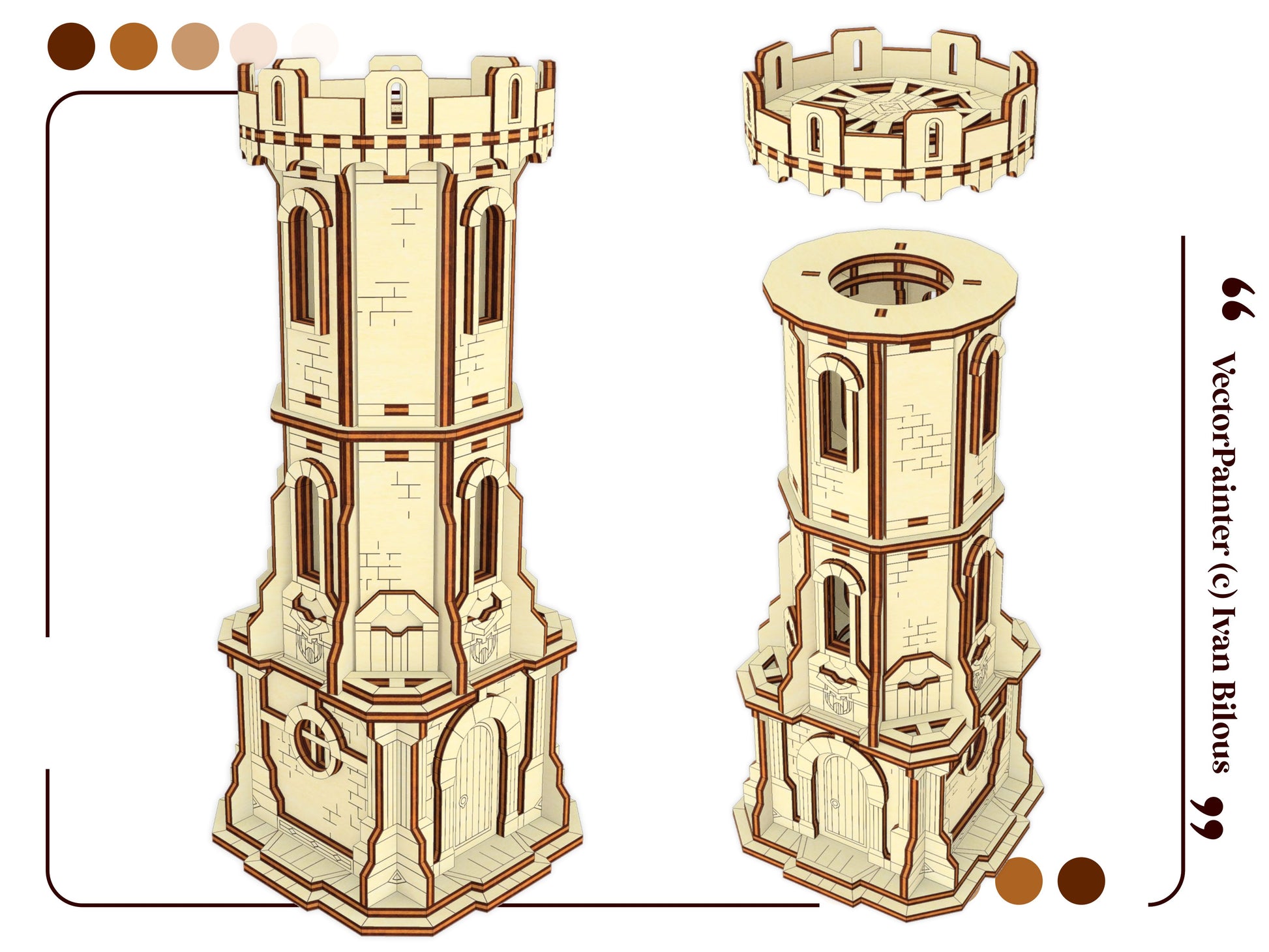 Watchtower laser cut file – digital SVG and DXF plan for creating a detailed miniature model from plywood or MDF. Inspired by medieval fortresses and fantasy worlds, this tower adds a touch of adventure to your collection. Perfect for tabletop gaming, dioramas, or unique home decor.